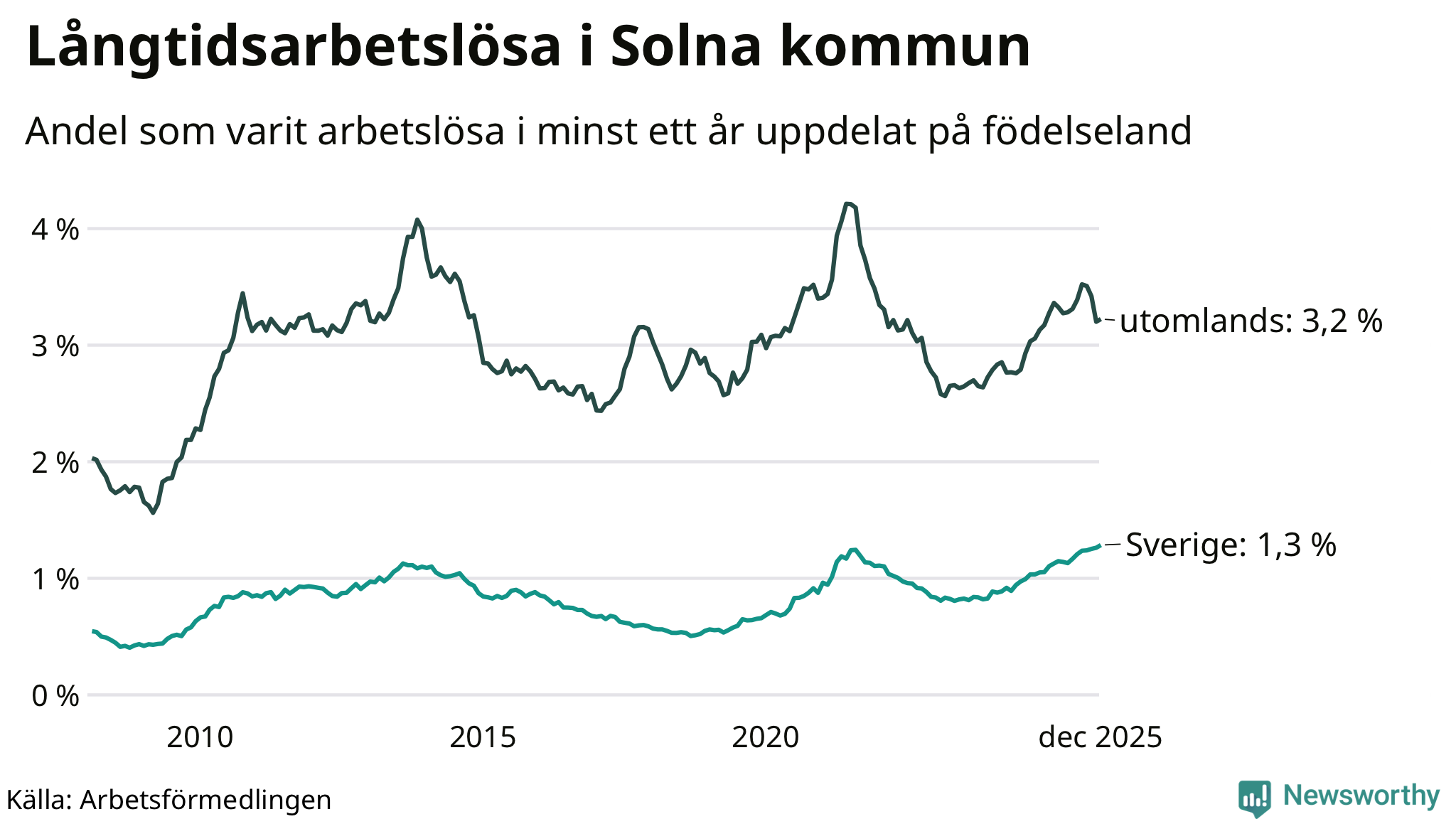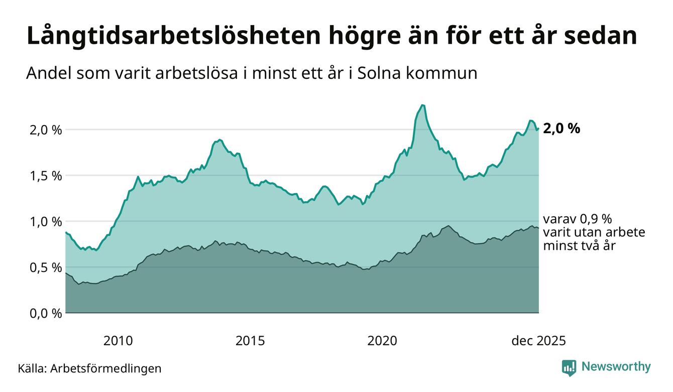 I december hade 972 Solnabor varit arbetslösa i minst ett år, vilket är tolv fler än månaden innan. 972 personer motsvarar 2,0 procent av arbetskraften i kommunen – andelen långtidsarbetslösa är 0,2 procentenheter högre än samma månad för ett år sedan.