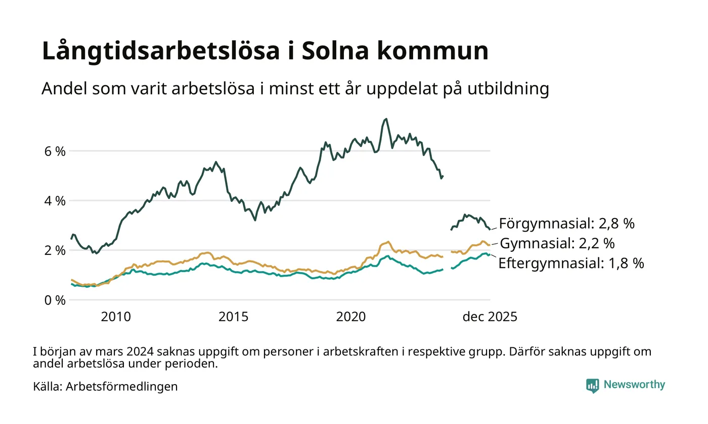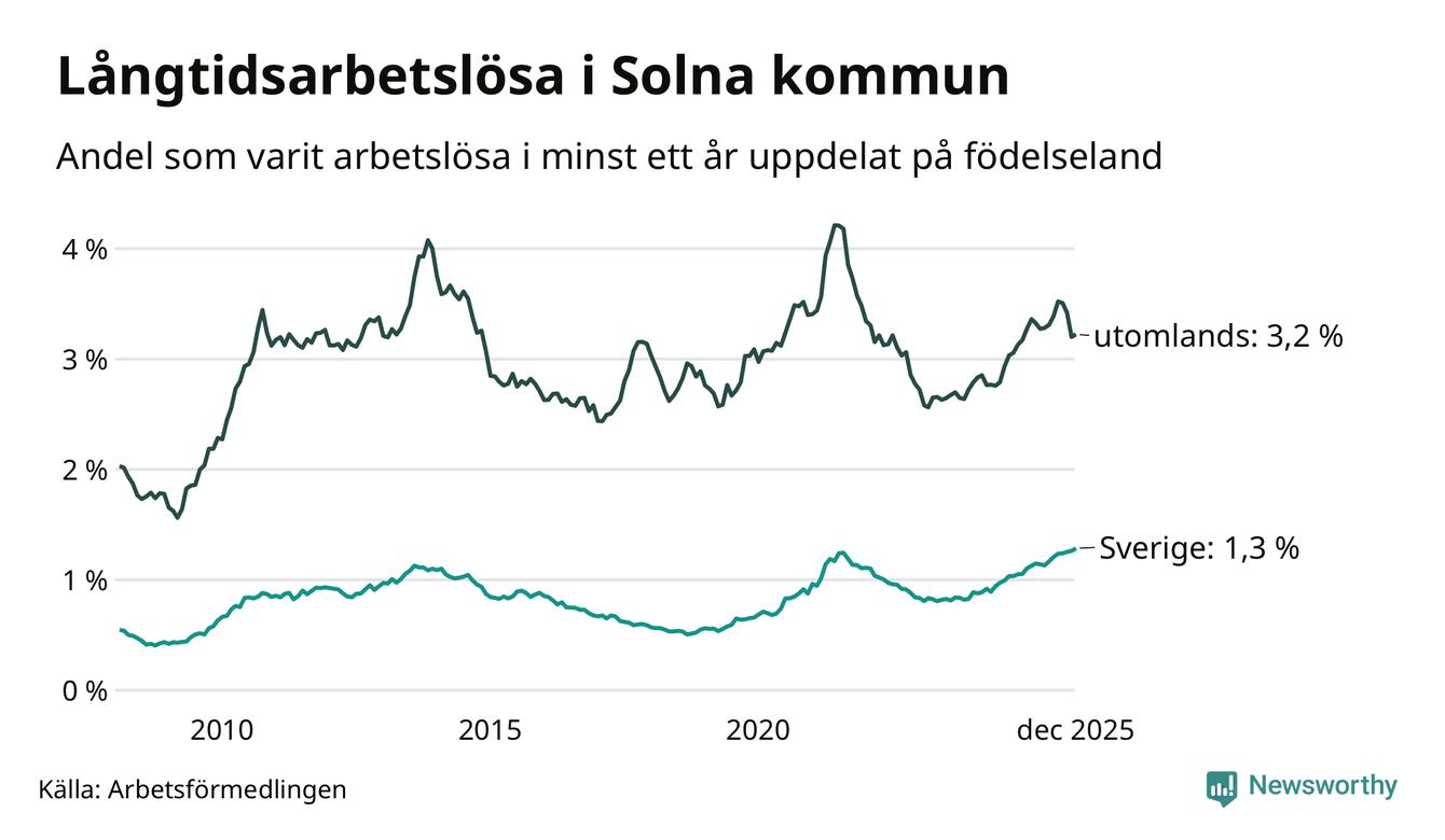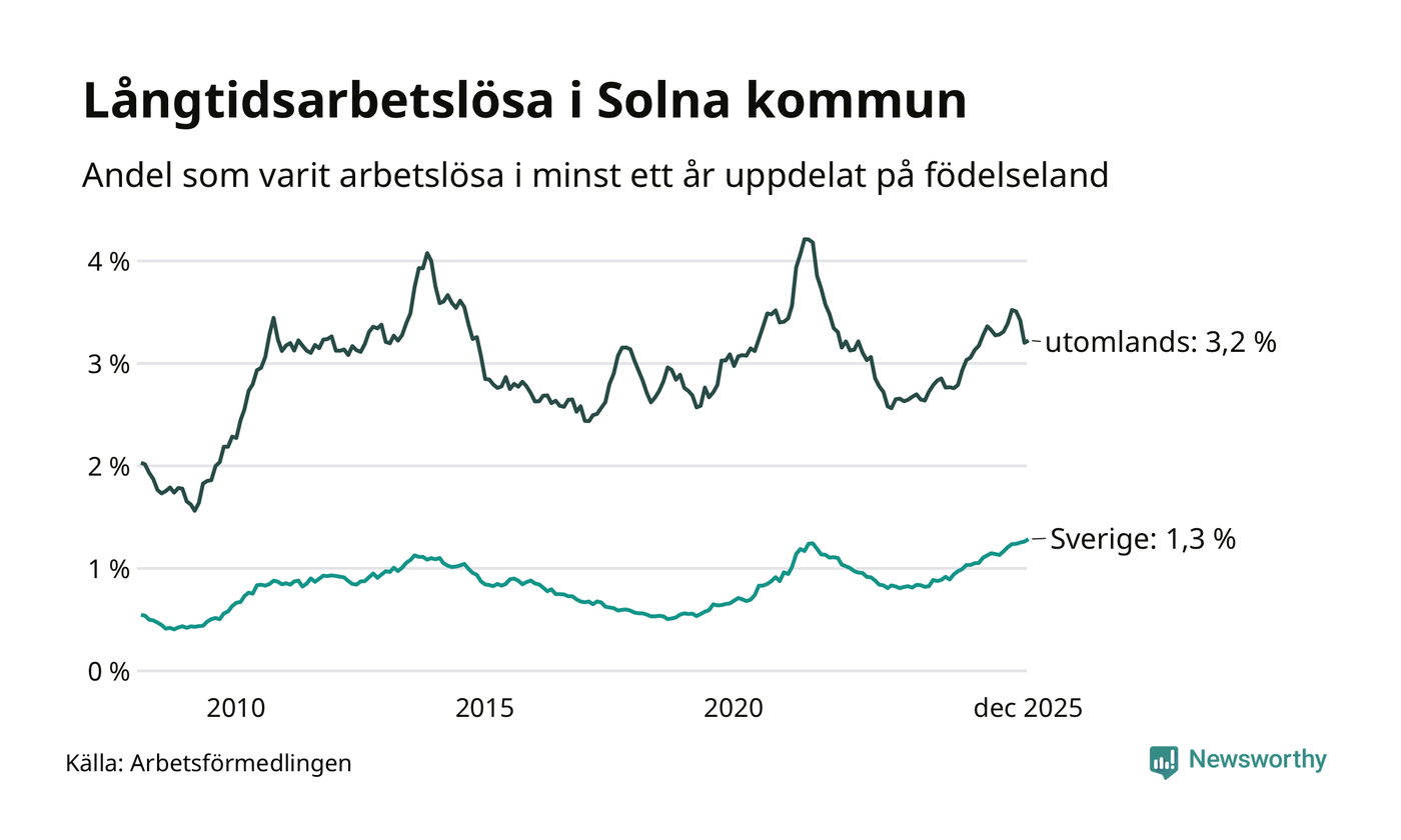 Andelen som varit utan arbete i minst ett år i Solna var högre i december jämfört med samma månad för ett år sedan. Det visar Arbetsfömedlingens senaste månadsstatistik.