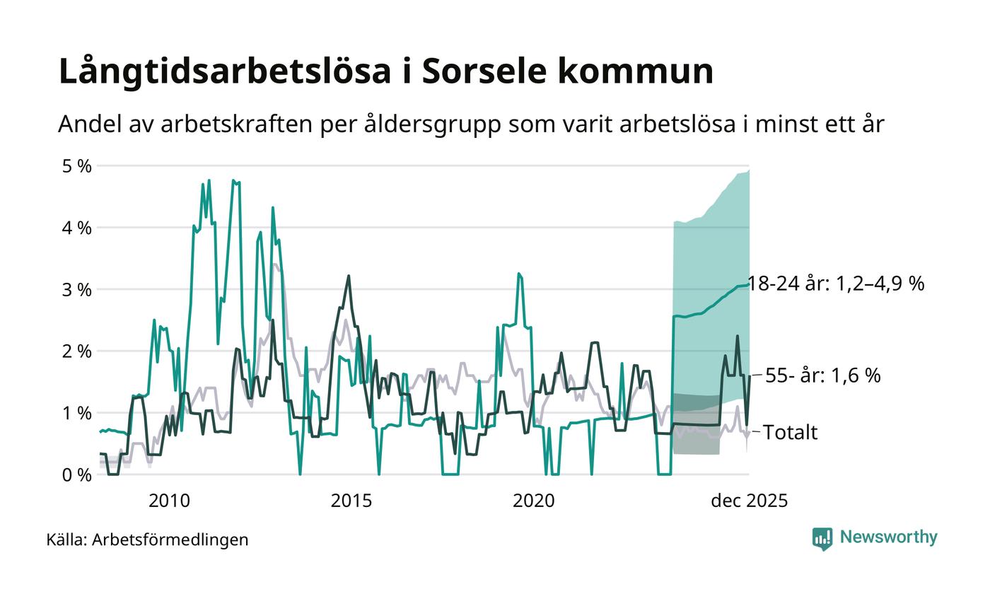 Av de sju personerna som varit arbetslösa i mer än ett år i Sorsele kommun är fem personer mellan 55 och 651 år och mellan en och fyra är mellan 18 och 24 år. För den äldre gruppen är andelen arbetslösa 1,6 procent medan den i den yngre gruppen är mellan 1,2 och 4,9 procent. Även i riket som helhet är långtidsarbetslösheten högre i gruppen äldre.