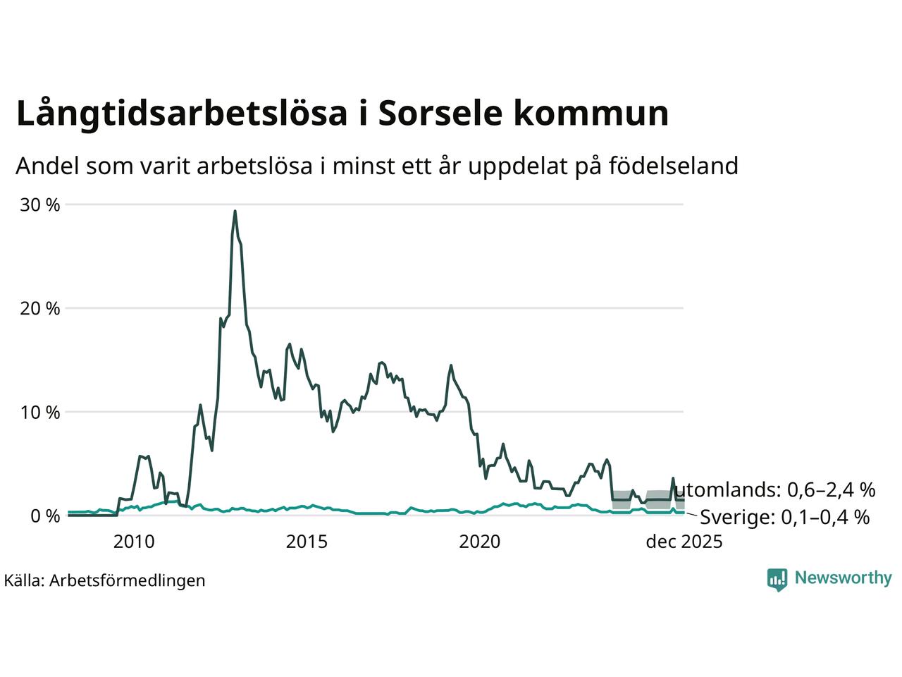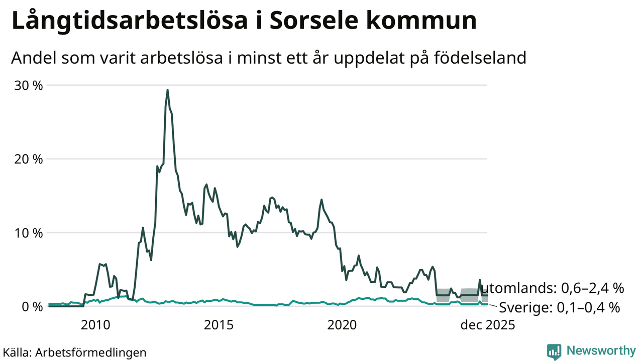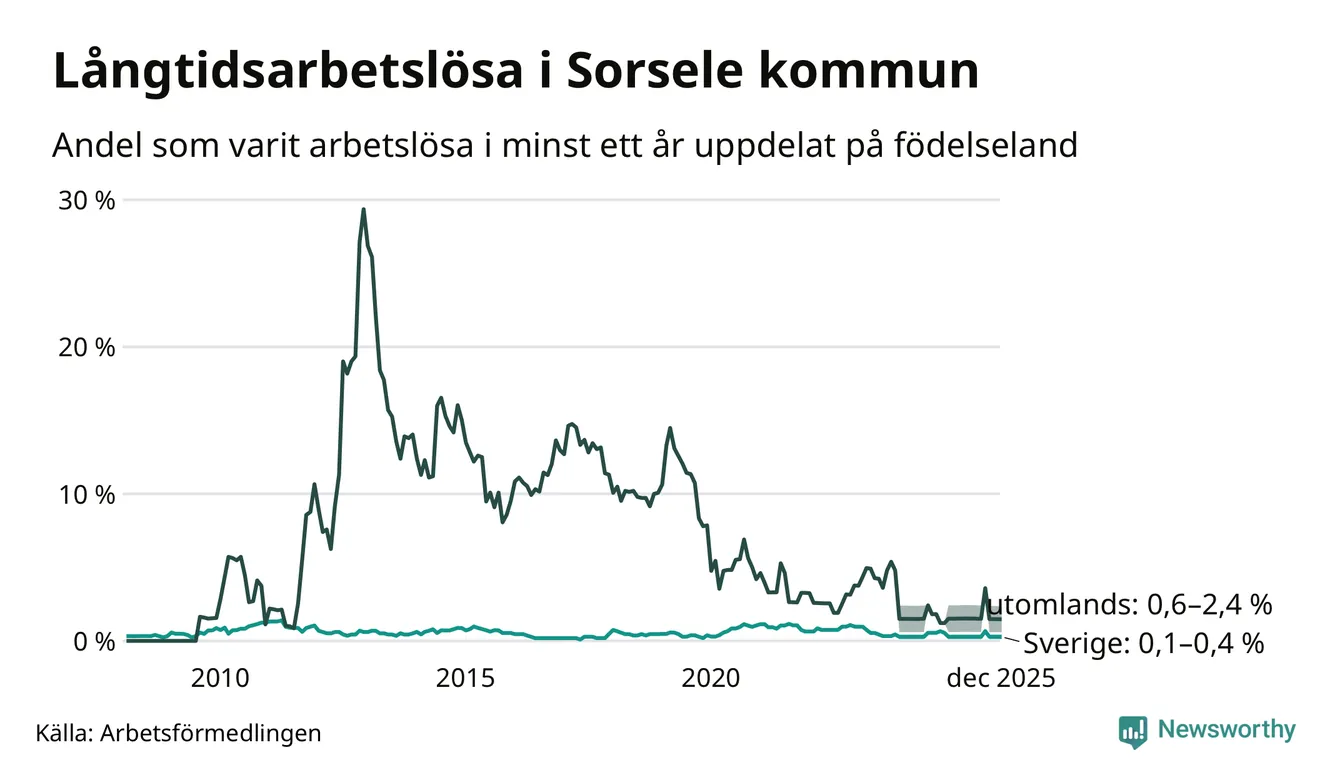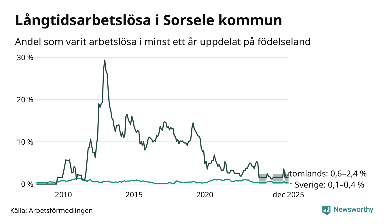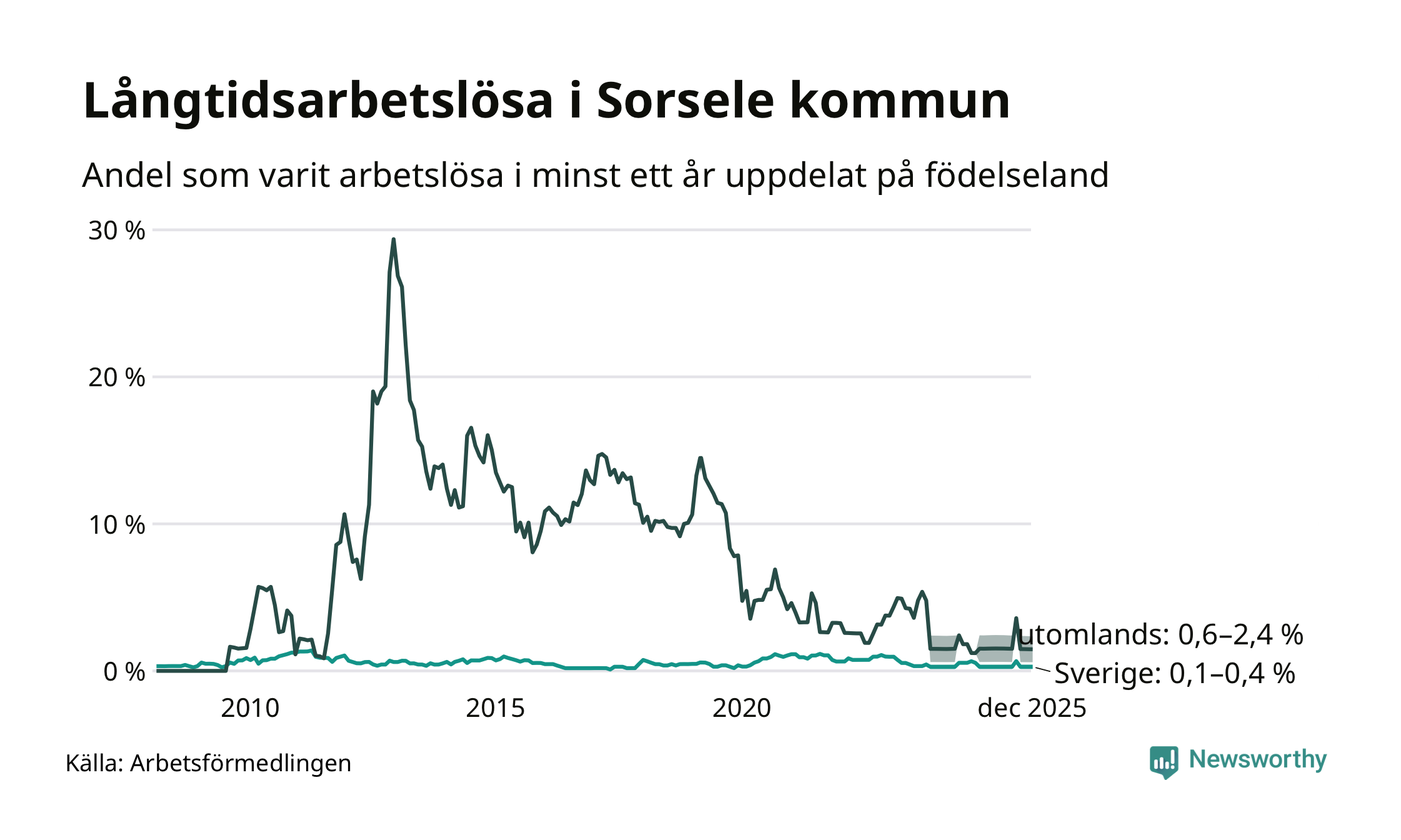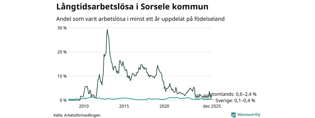 Färre än fem av de långtidsarbetslösa i Sorsele är födda i Sverige och mellan 1 och 4 är födda utomlands. Det innebär att långtidsarbetslösheten bland Sverigefödda är mellan 0,1 och 0,4 procent, medan den ligger mellan 0,6 och 2,4 procent för utlandsfödda.