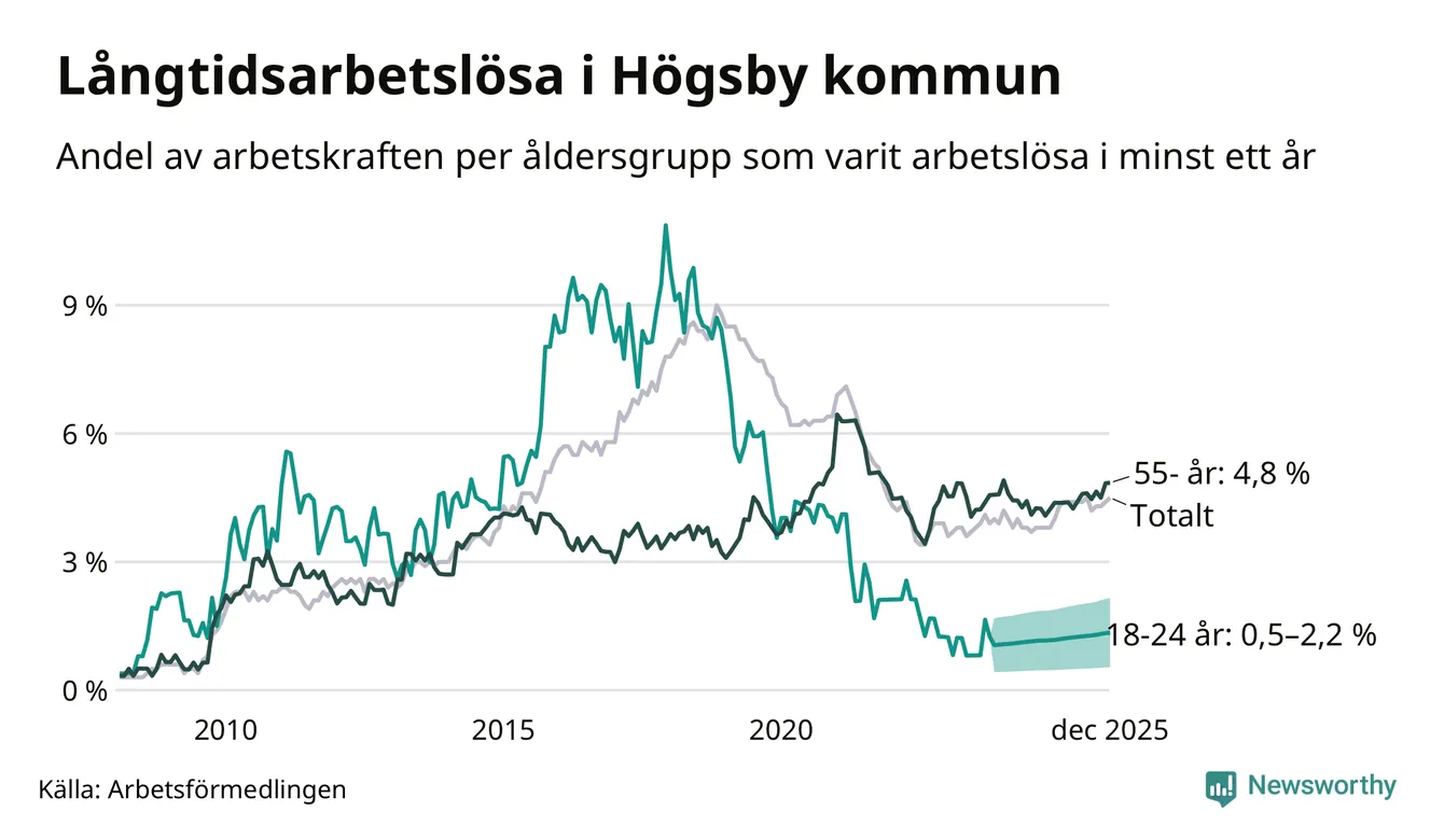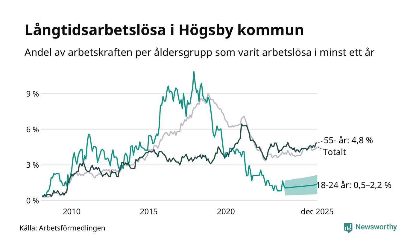 Av de 97 personerna som varit arbetslösa i mer än ett år i Högsby kommun är 30 personer mellan 55 och 651 år och mellan en och fyra är mellan 18 och 24 år. För den äldre gruppen är andelen arbetslösa 4,8 procent medan den i den yngre gruppen är mellan 0,5 och 2,2 procent. Även i riket som helhet är långtidsarbetslösheten högre i gruppen äldre.