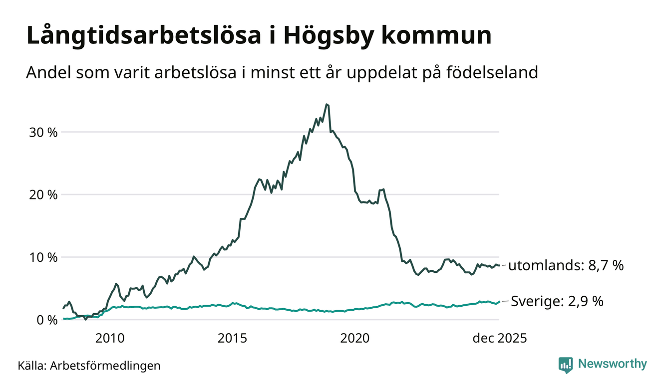 45 av de långtidsarbetslösa i Högsby är födda i Sverige, medan 52 är födda utomlands. Det innebär att långtidsarbetslösheten bland Sverigefödda är 2,9 procent, medan den är tre gånger så hög – 8,7 procent – bland födda utomlands. Även i riket som helhet är arbetslösheten högre bland utrikesfödda.