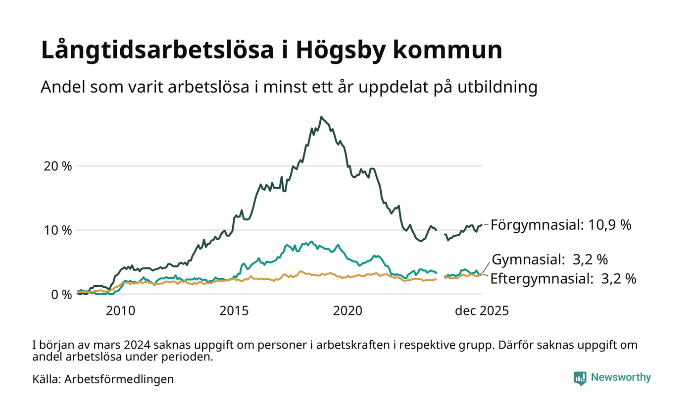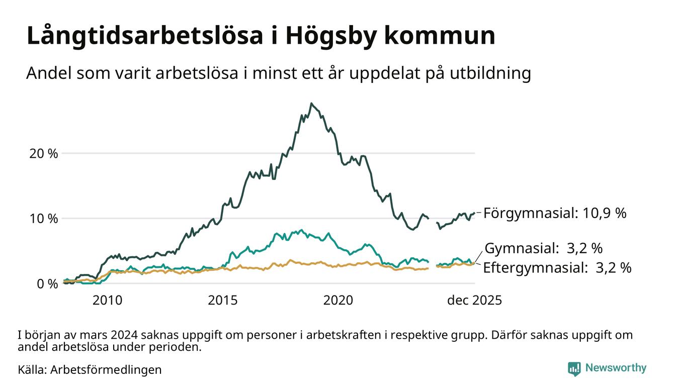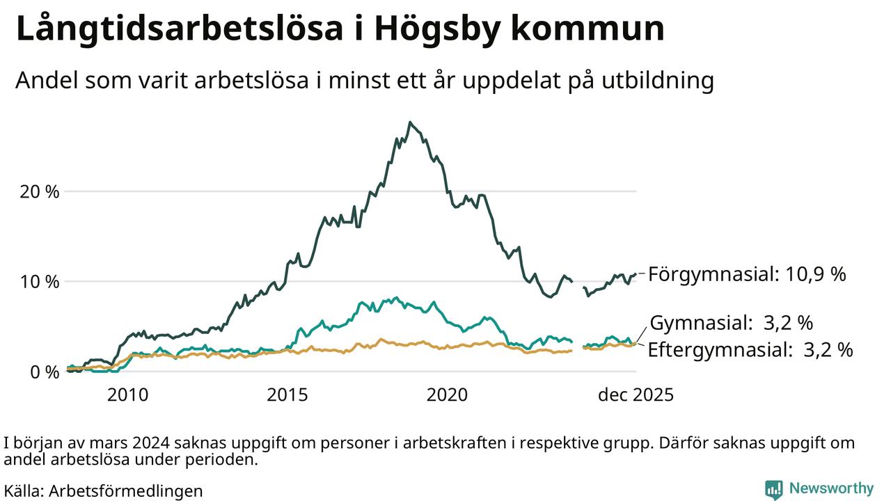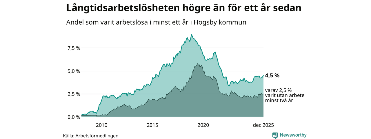 Inte sedan november 2021 har andelen långtidsarbetslösa varit så hög i Högsby. Det visar Arbetsförmedlingens senaste månadsstatistik.