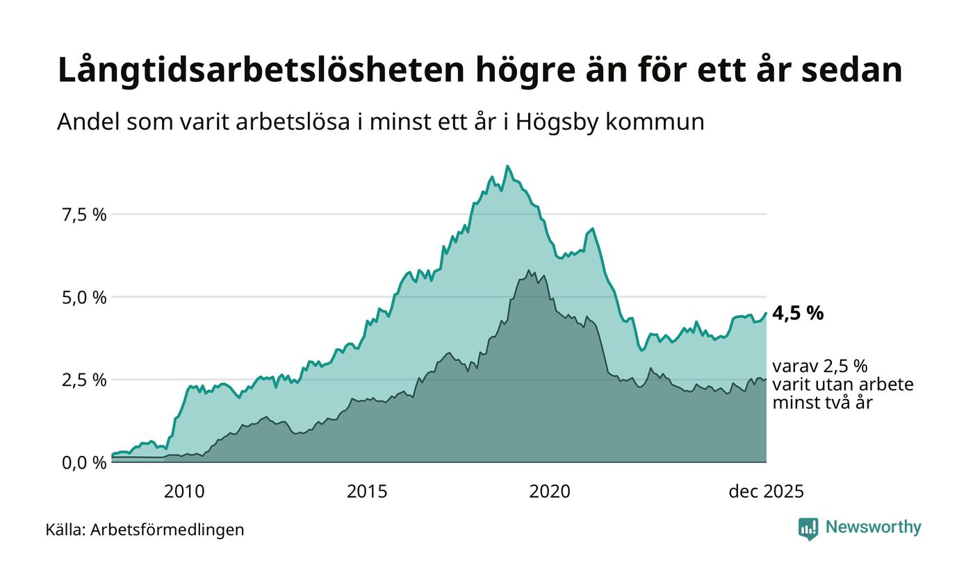 I december hade 97 Högsbybor varit arbetslösa i minst ett år, vilket är tre fler än månaden innan. 97 personer motsvarar 4,5 procent av arbetskraften i kommunen – andelen långtidsarbetslösa är 0,5 procentenheter högre än samma månad för ett år sedan. Högsby tillhör de kommuner som har högst andel långtidsarbetslösa i hela landet just nu.