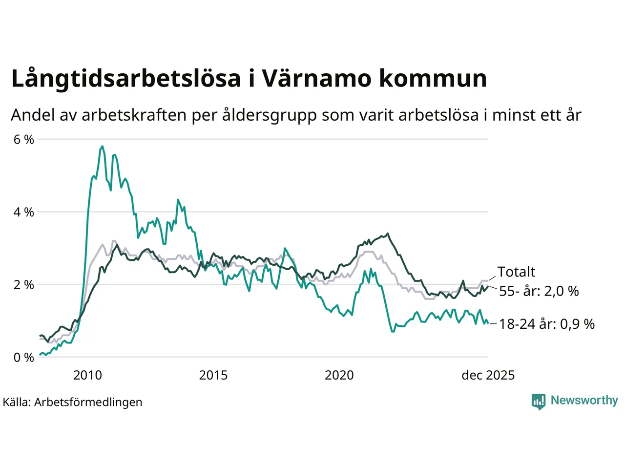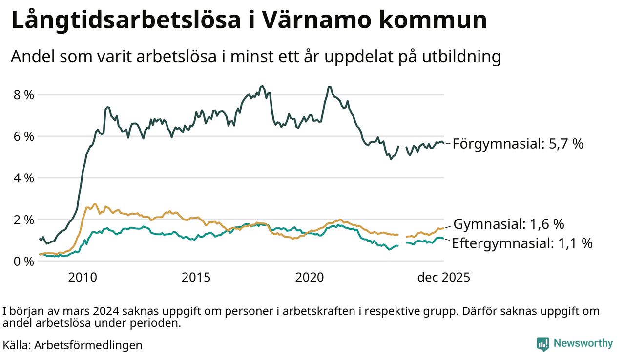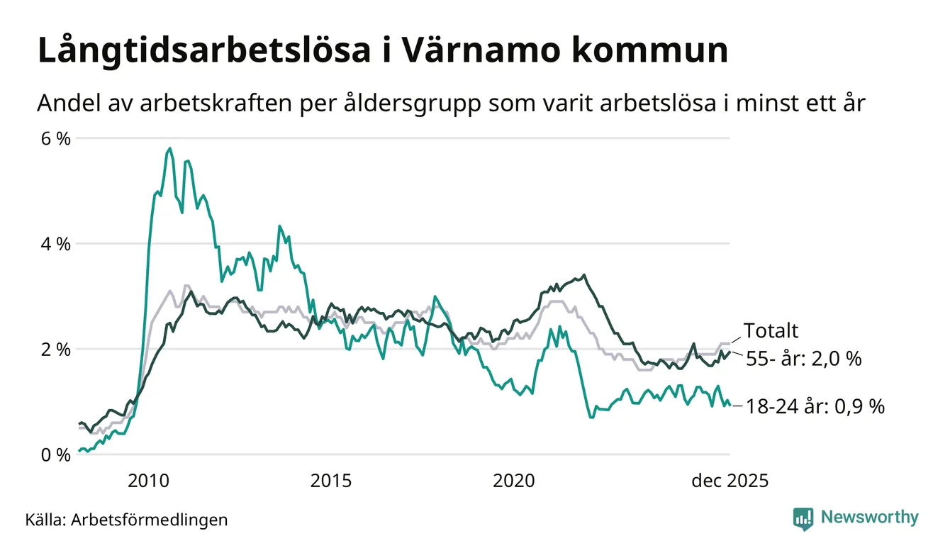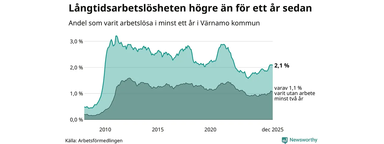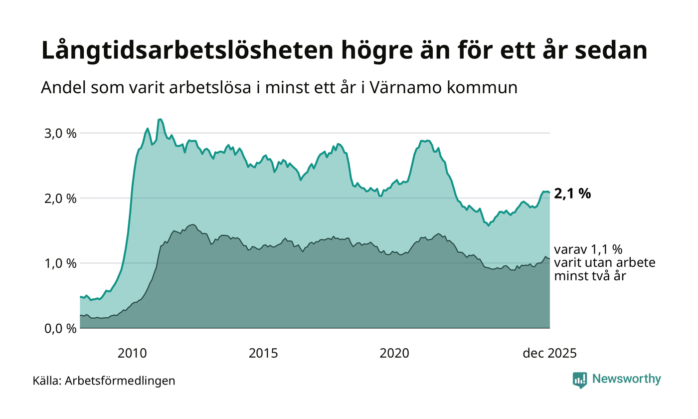 I december hade 364 Värnamobor varit arbetslösa i minst ett år, vilket är fyra färre än månaden innan. 364 personer motsvarar 2,1 procent av arbetskraften i kommunen – andelen långtidsarbetslösa är 0,2 procentenheter högre än samma månad för ett år sedan.