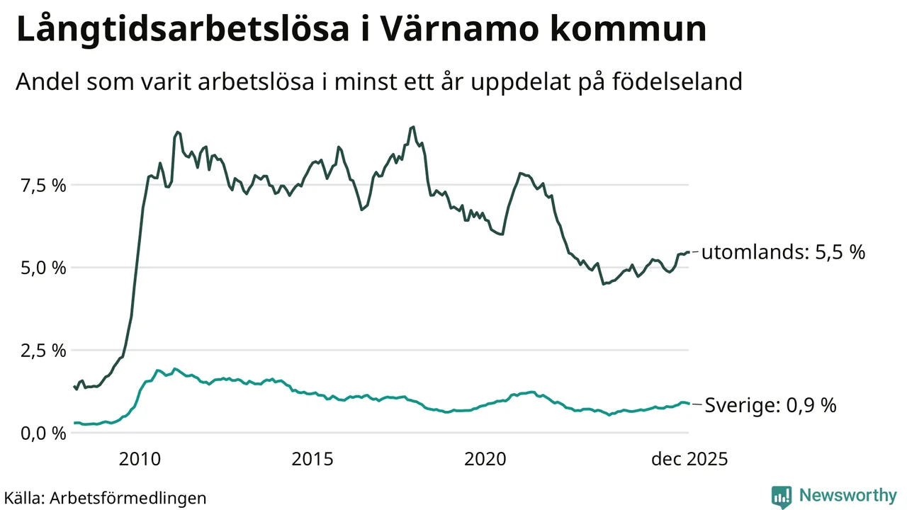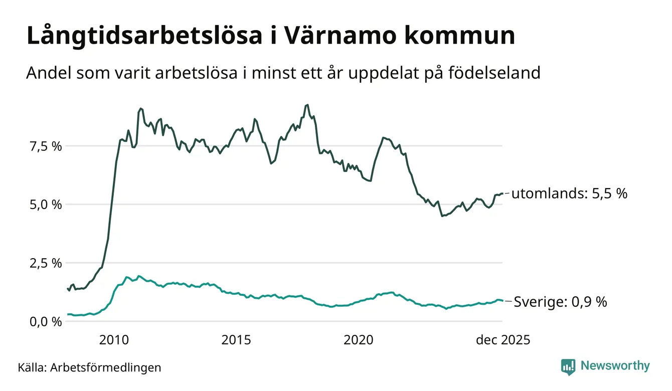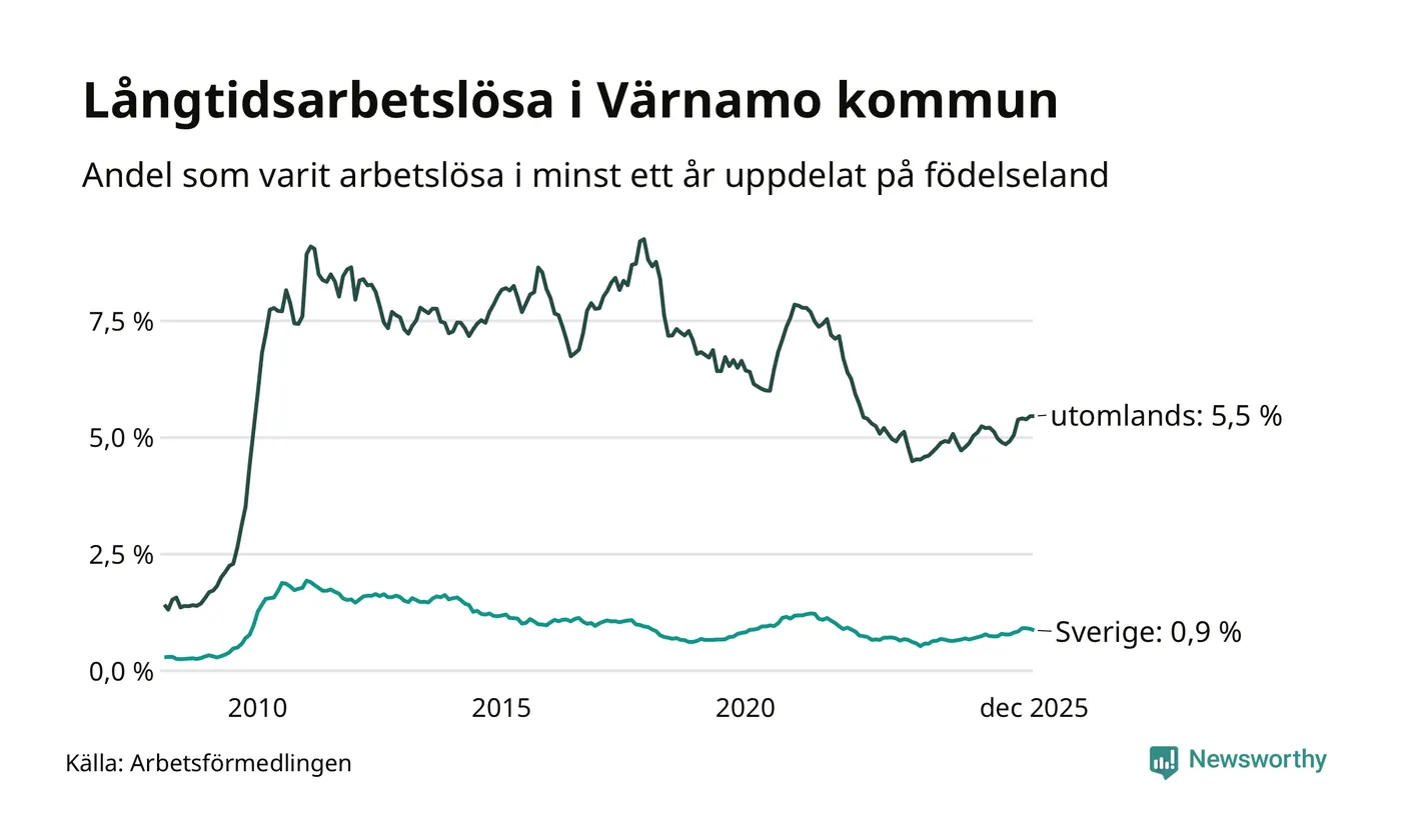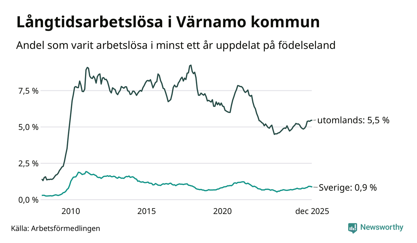 112 av de långtidsarbetslösa i Värnamo är födda i Sverige, medan 252 är födda utomlands. Det innebär att långtidsarbetslösheten bland Sverigefödda är 0,9 procent, medan den är sex gånger så hög – 5,5 procent – bland födda utomlands. Även i riket som helhet är arbetslösheten högre bland utrikesfödda.