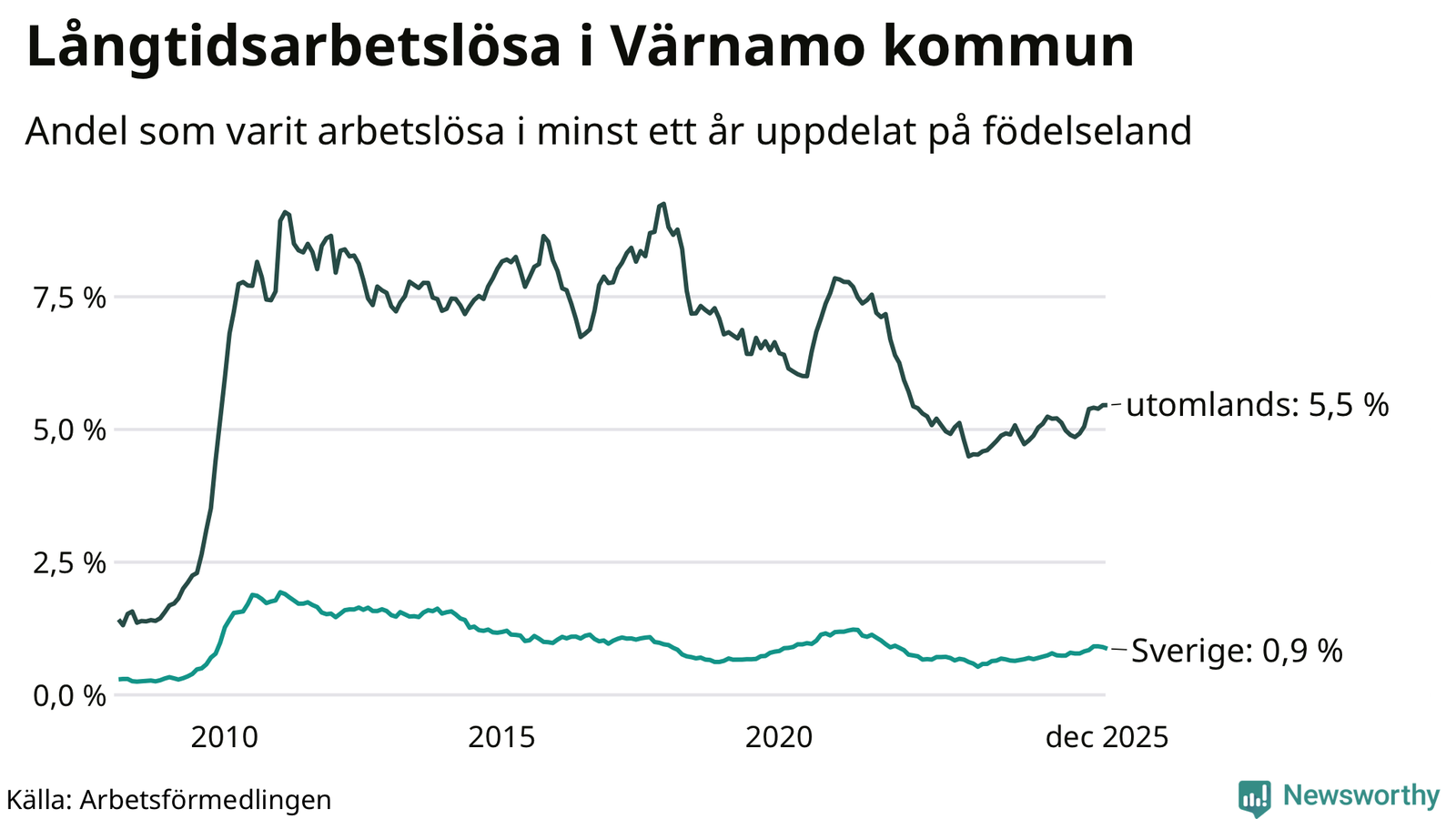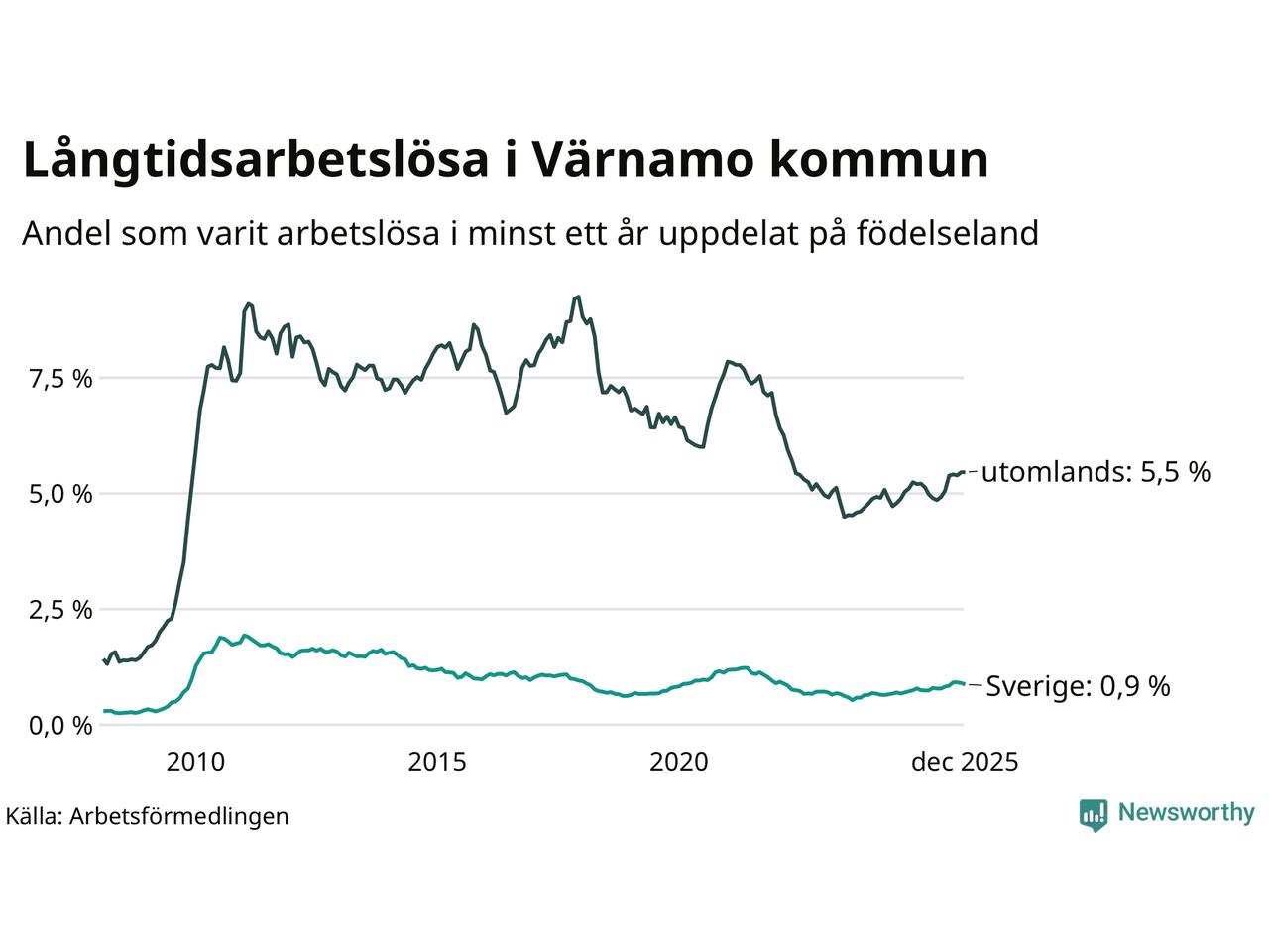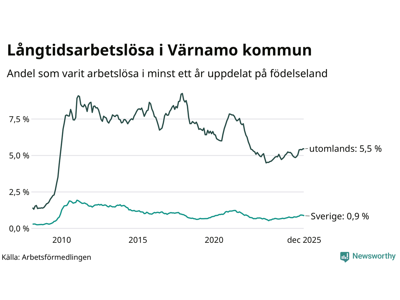 112 av de långtidsarbetslösa i Värnamo är födda i Sverige, medan 252 är födda utomlands. Det innebär att långtidsarbetslösheten bland Sverigefödda är 0,9 procent, medan den är sex gånger så hög – 5,5 procent – bland födda utomlands. Även i riket som helhet är arbetslösheten högre bland utrikesfödda.