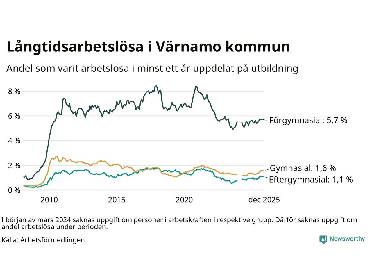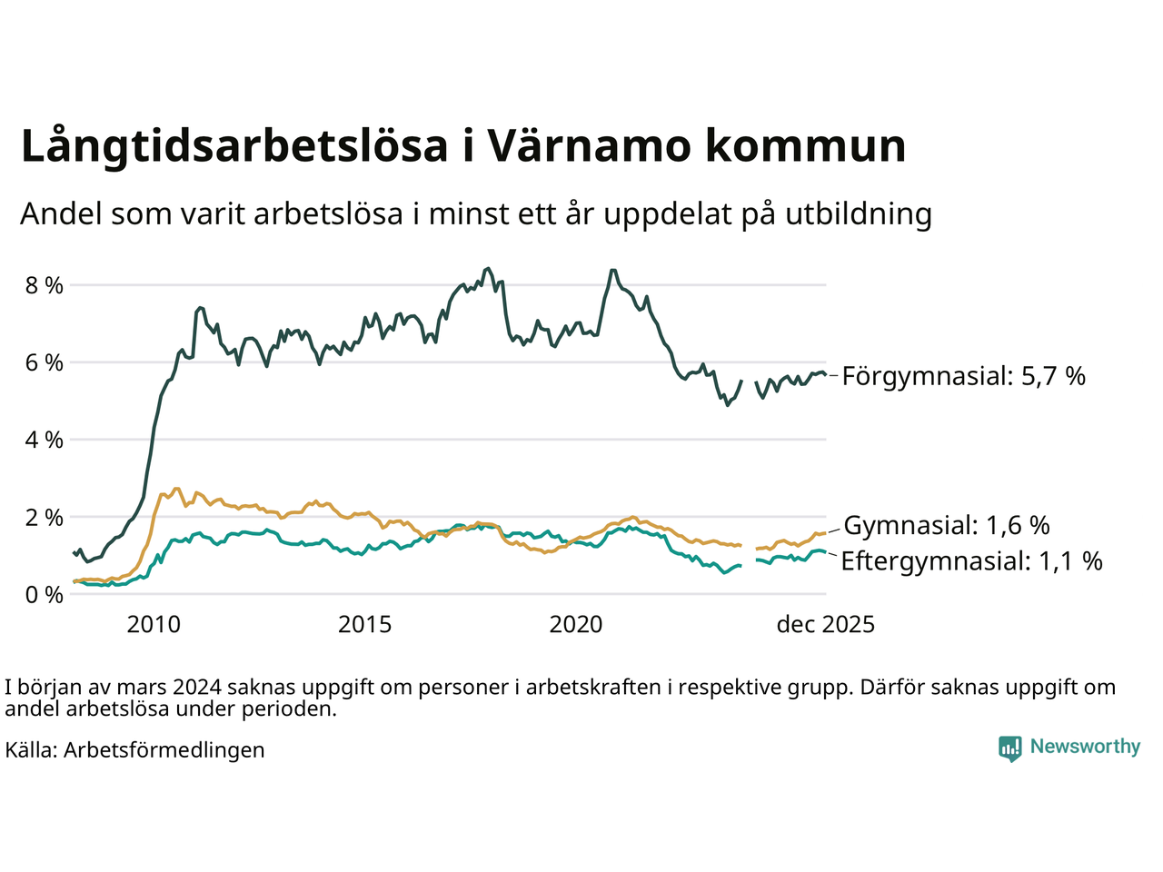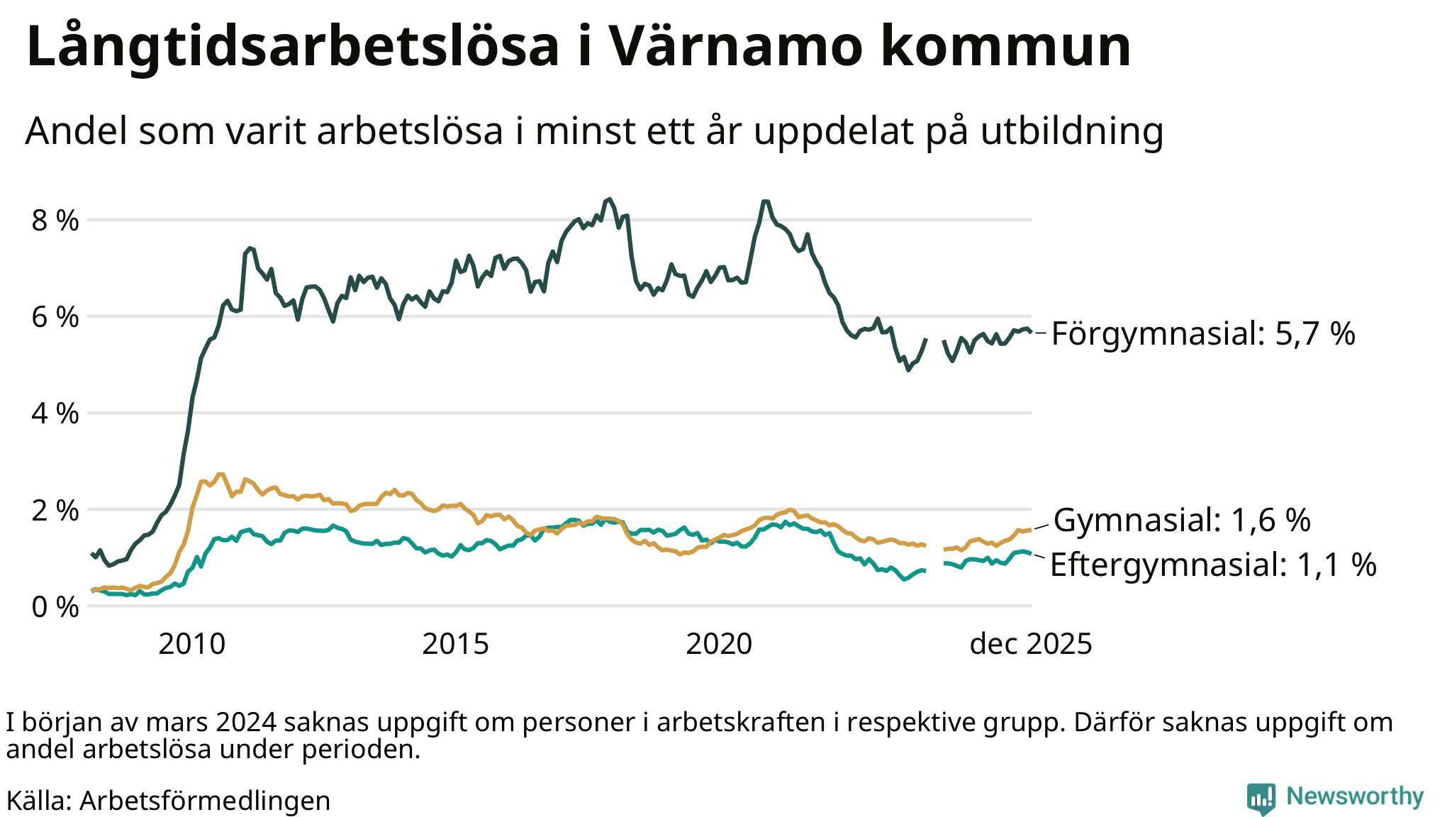 | Bland dem med eftergymnasial utbildning | 1,1 % | 1,6 % | 1,9 % |