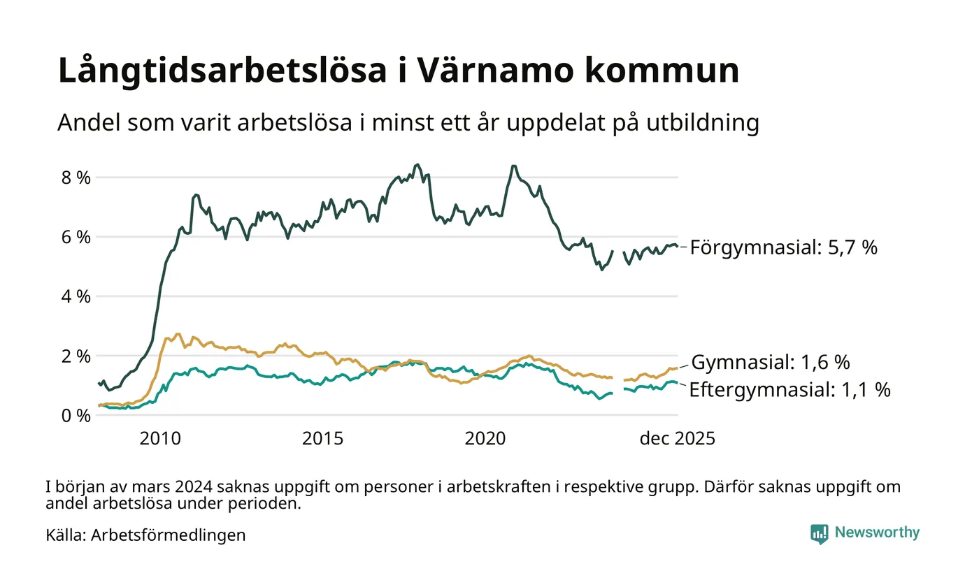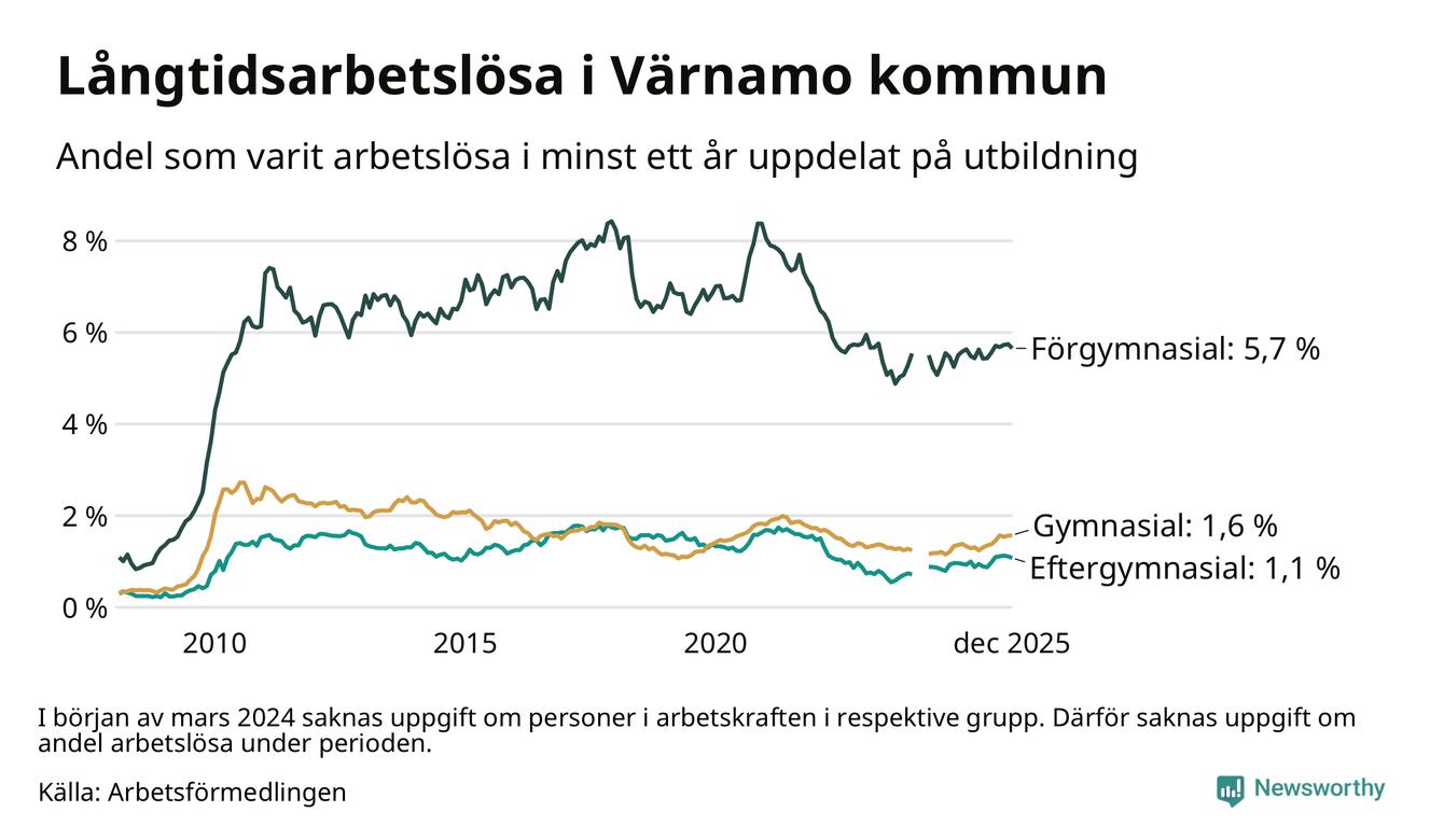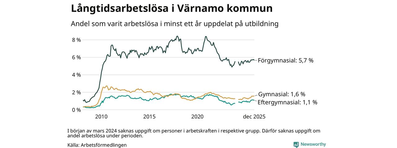 Andelen som varit utan arbete i minst ett år i Värnamo i december var högre än för ett år sedan. Men jämfört med i november har antalet långtidsarbetslösa minskat.