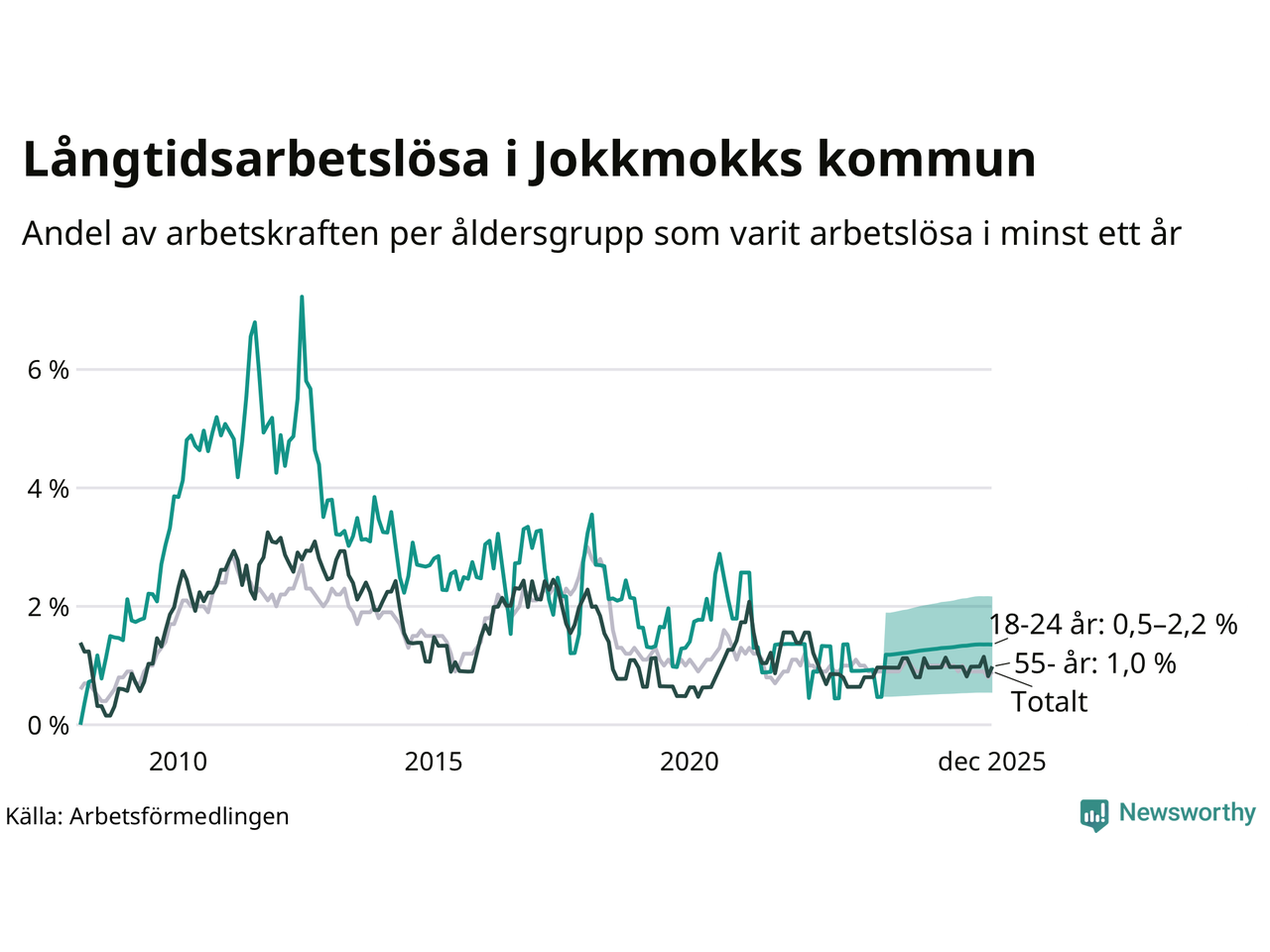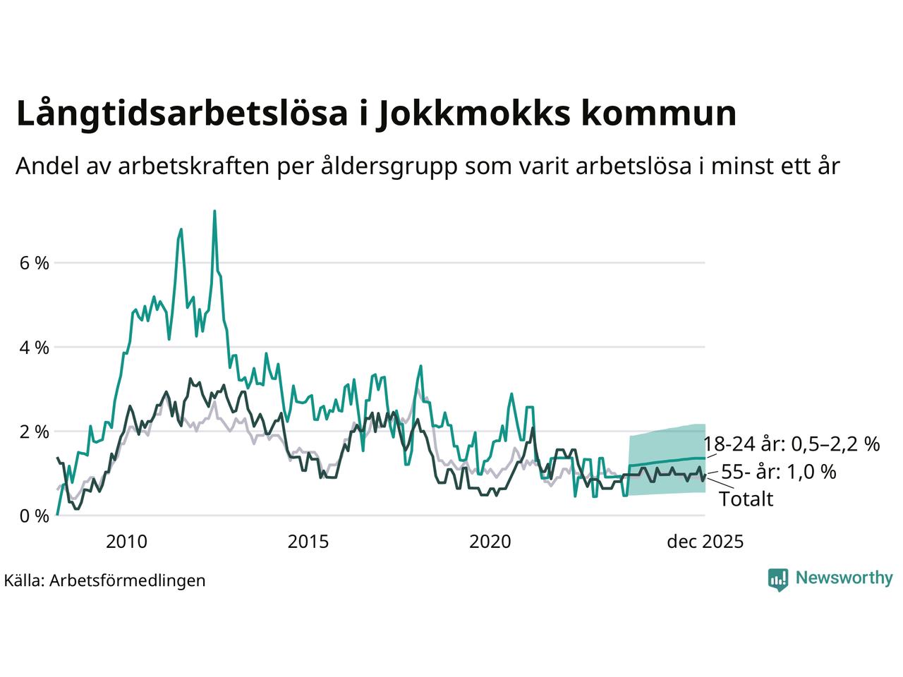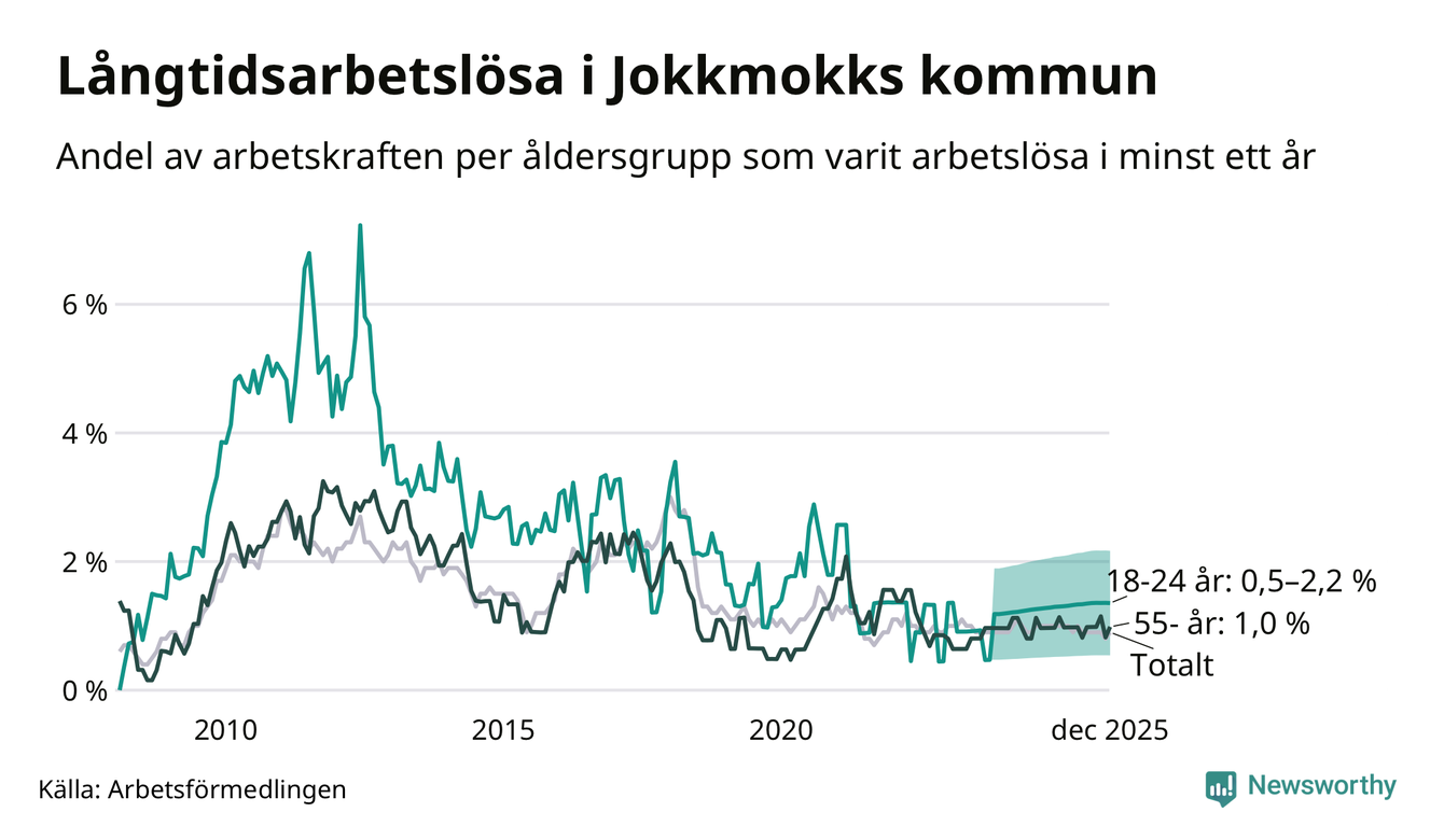Av de 20 personerna som varit arbetslösa i mer än ett år i Jokkmokks kommun är sex personer mellan 55 och 651 år och mellan en och fyra är mellan 18 och 24 år. För den äldre gruppen är andelen arbetslösa 1,0 procent medan den i den yngre gruppen är mellan 0,5 och 2,2 procent. Även i riket som helhet är långtidsarbetslösheten högre i gruppen äldre.