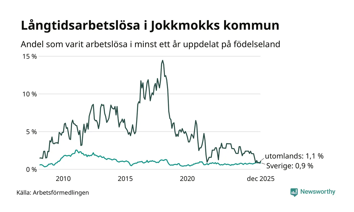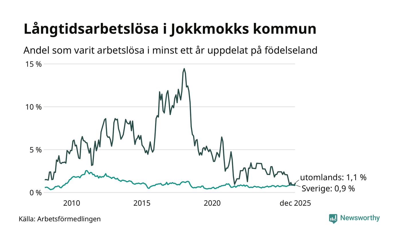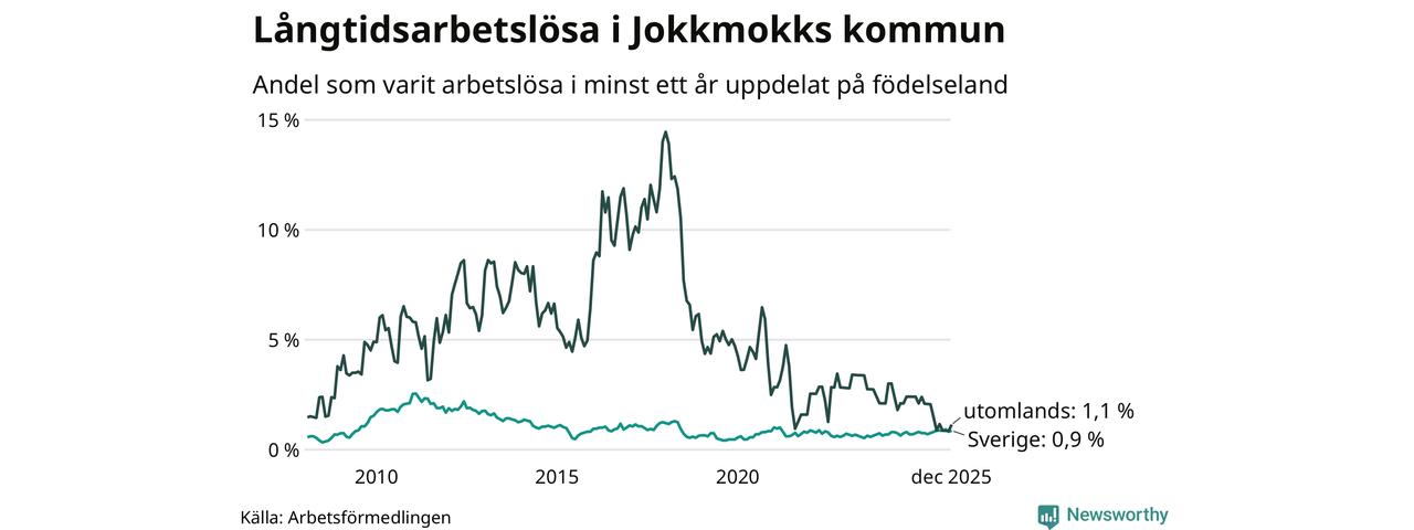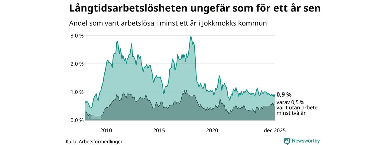 I december hade 20 Jokkmokksbor varit arbetslösa i minst ett år, vilket är två fler än månaden innan. 20 personer motsvarar 0,9 procent av arbetskraften i kommunen – andelen långtidsarbetslösa är ungefär på samma nivå som för ett år sedan. Jokkmokk tillhör de kommuner som har lägst andel långtidsarbetslösa i hela landet just nu.