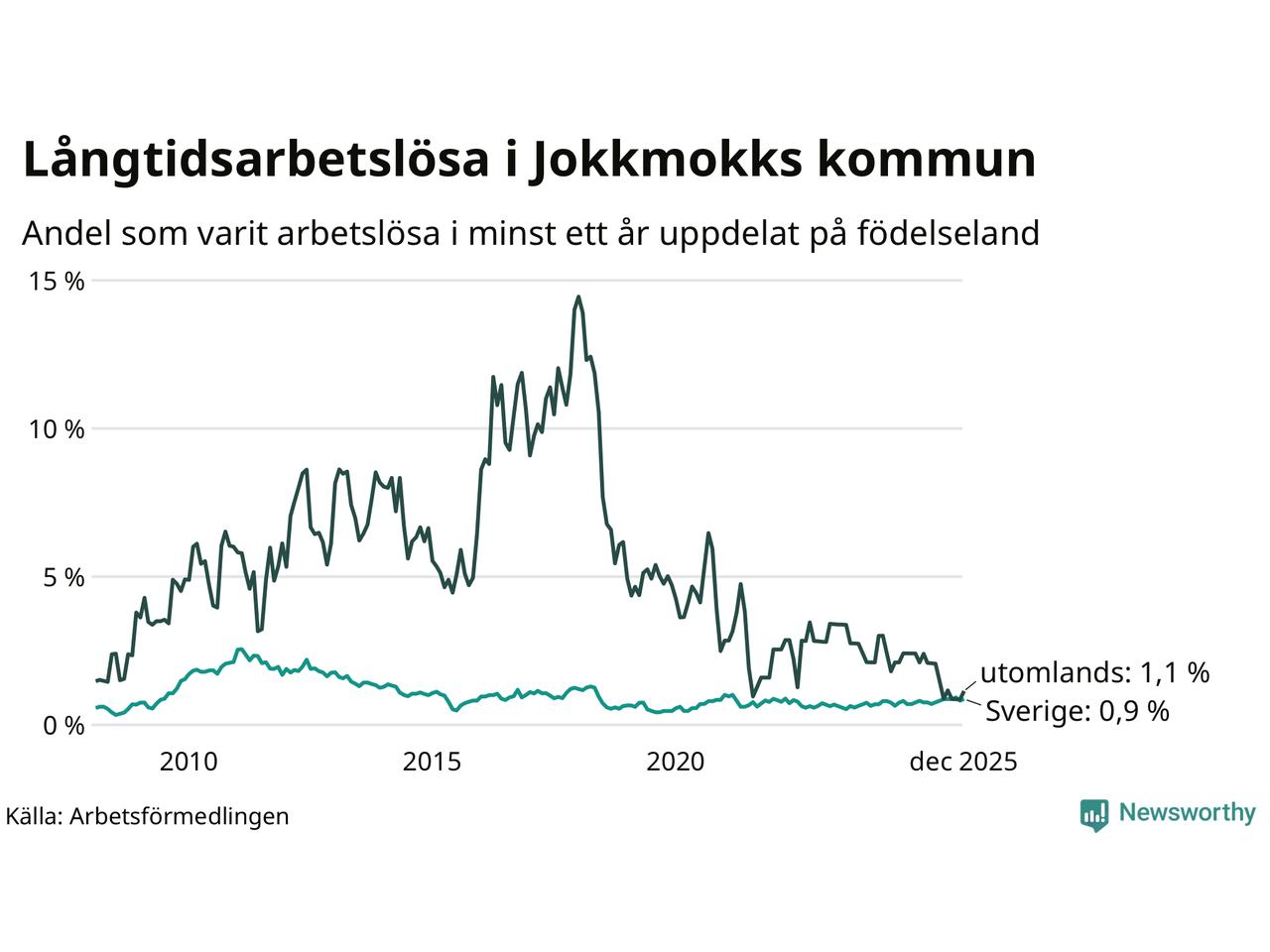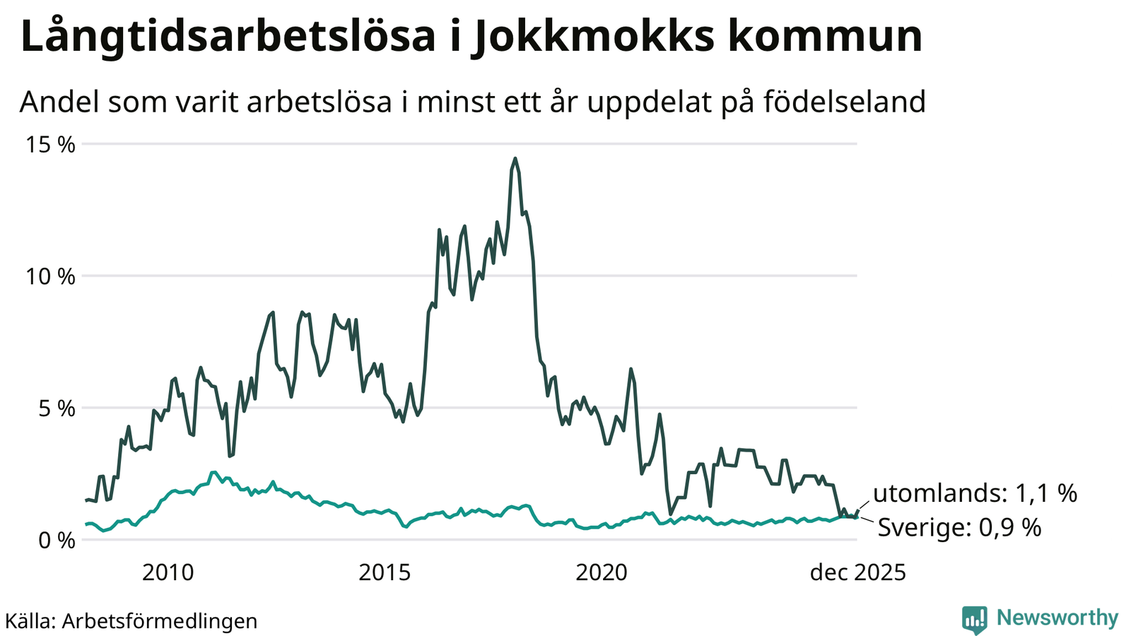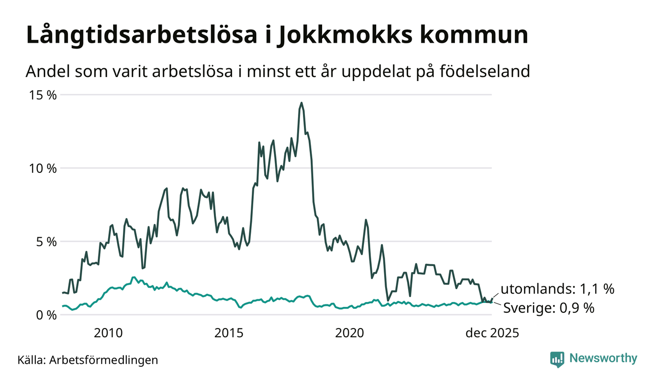 I december hade 20 Jokkmokksbor varit arbetslösa i minst ett år, vilket är två fler än månaden innan. 20 personer motsvarar 0,9 procent av arbetskraften i kommunen – andelen långtidsarbetslösa är ungefär på samma nivå som för ett år sedan. Jokkmokk tillhör de kommuner som har lägst andel långtidsarbetslösa i hela landet just nu.