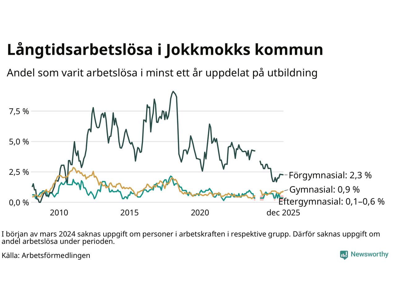 | Andel arbetslösa i minst ett år | 0,9 % | 1,3 % | 2,9 % |
