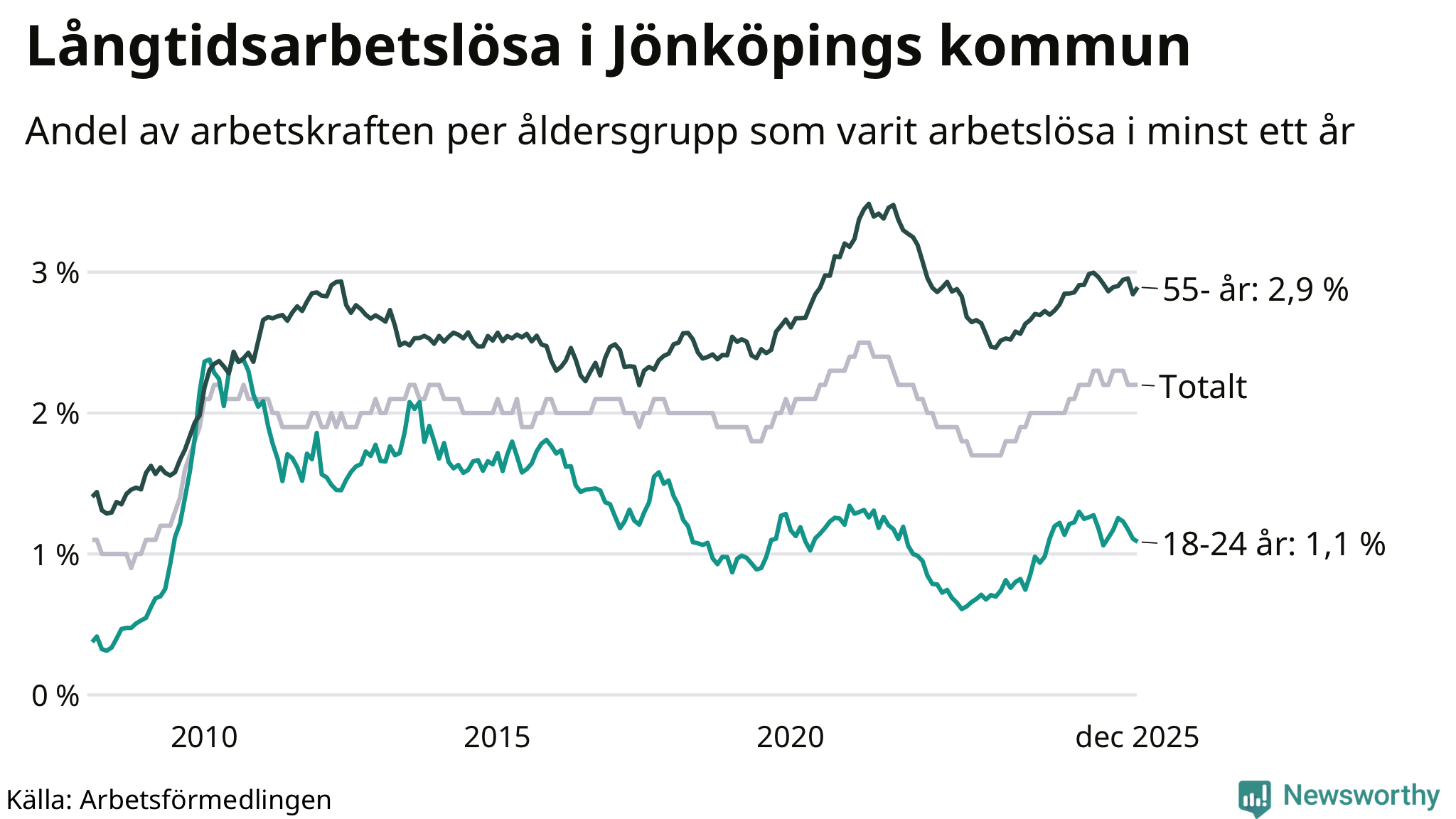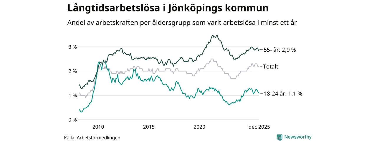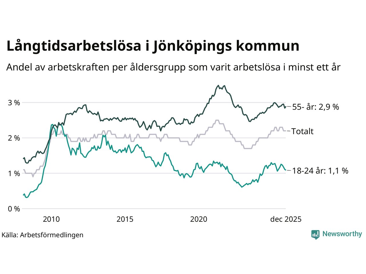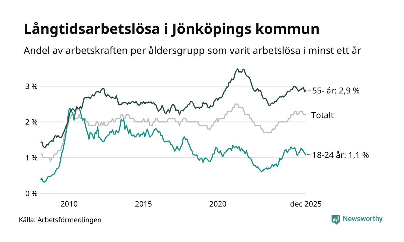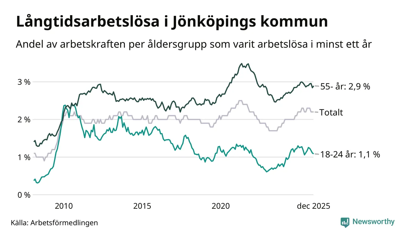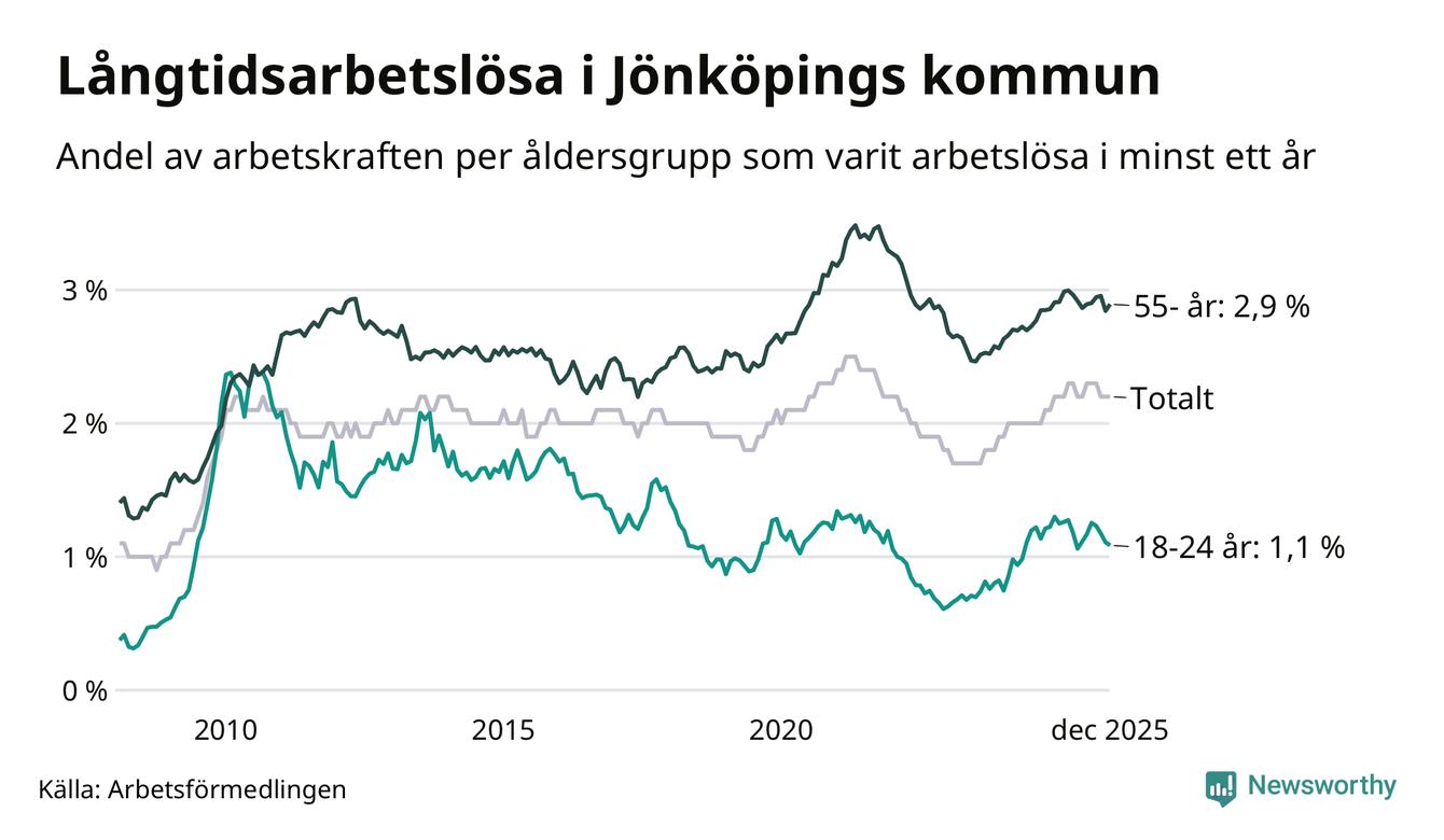 Av de 1 694 personerna som varit arbetslösa i mer än ett år i Jönköpings kommun är 428 personer mellan 55 och 651 år och 101 är mellan 18 och 24 år. För den äldre gruppen är andelen arbetslösa 2,9 procent medan den i den yngre gruppen är 1,1 procent. Även i riket som helhet är långtidsarbetslösheten högre i gruppen äldre.
