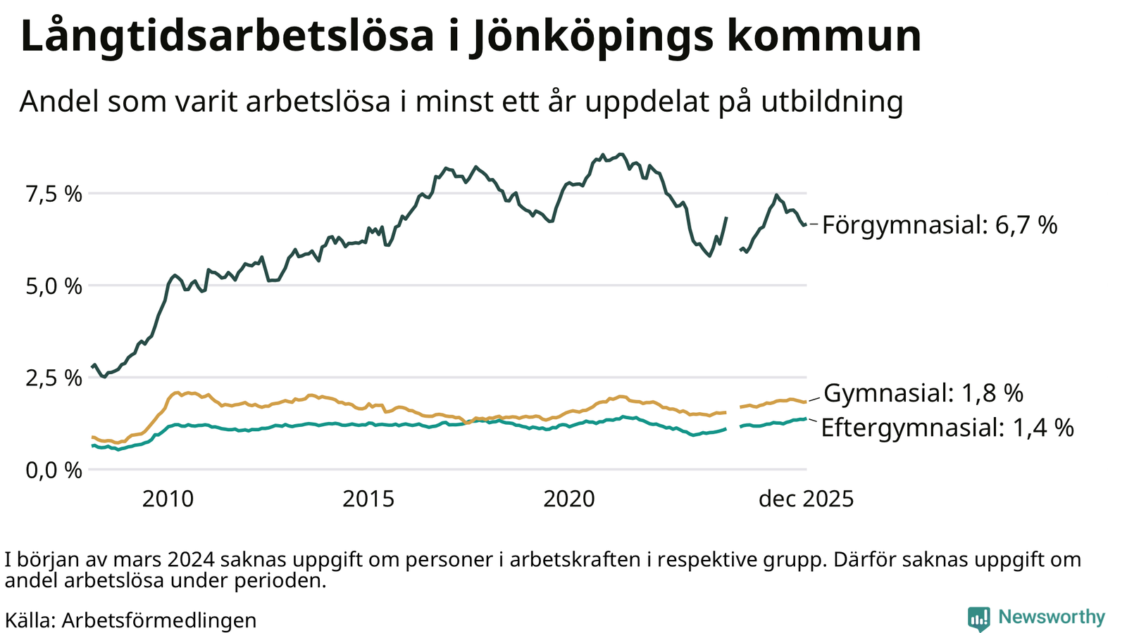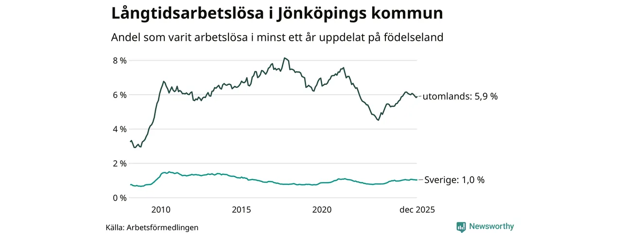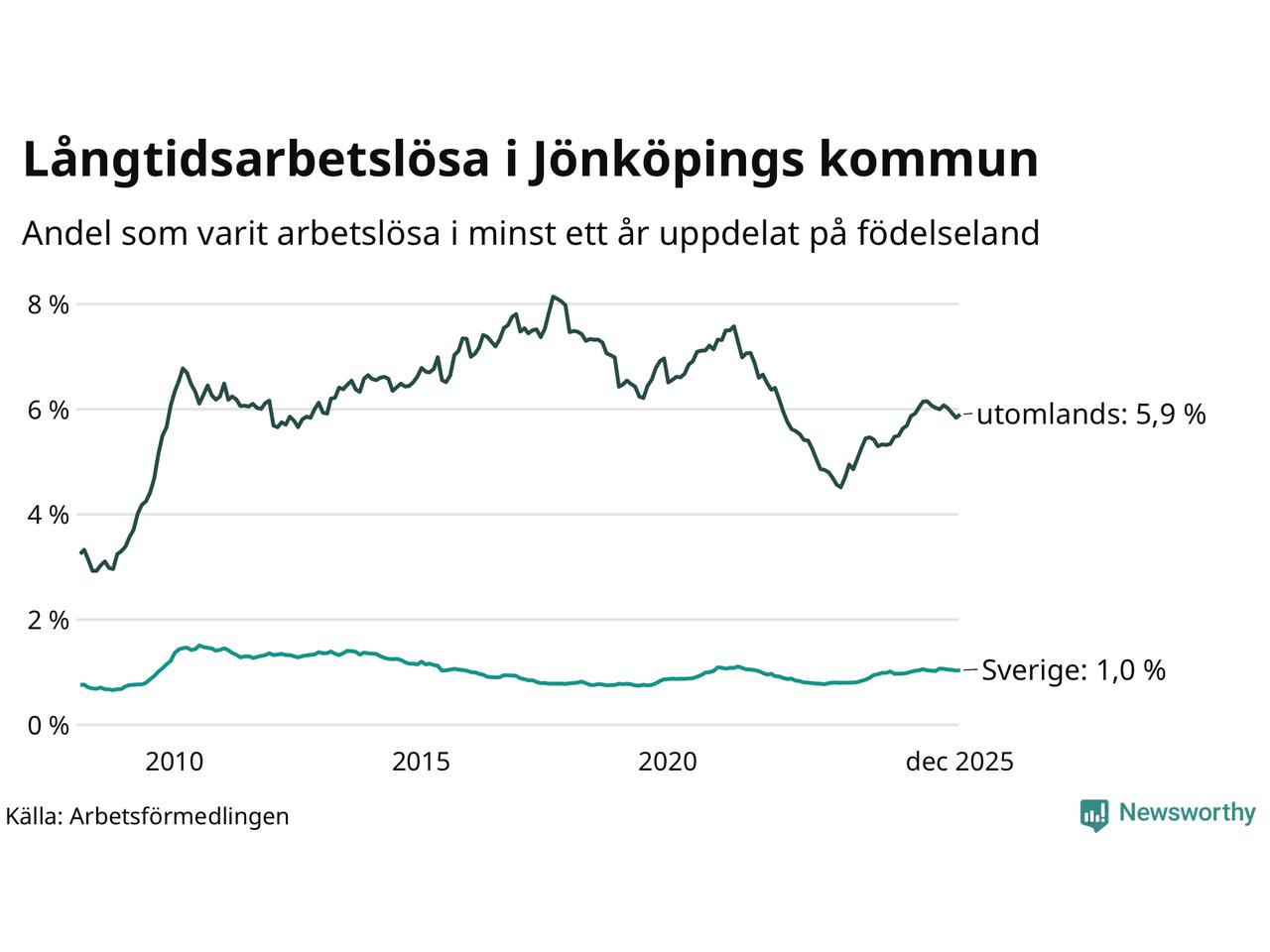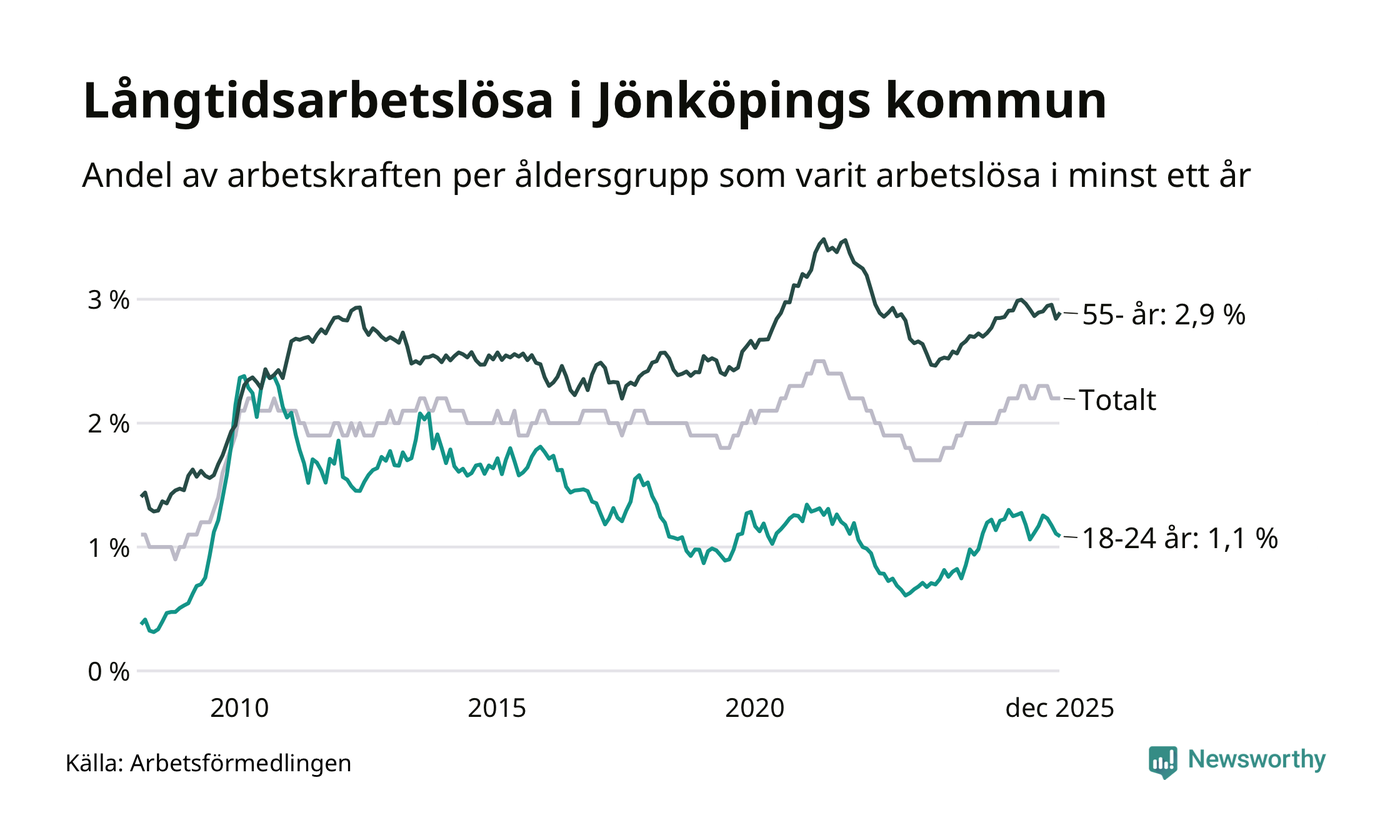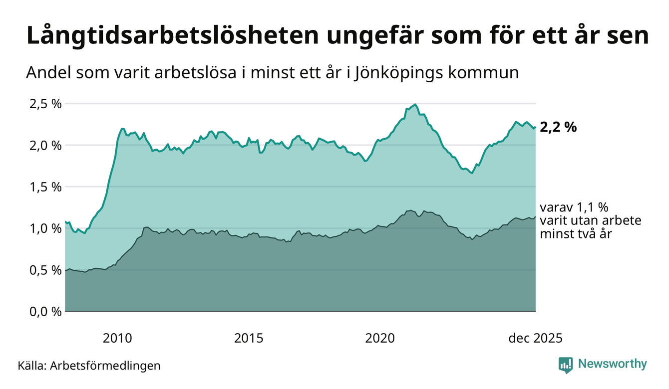 I december hade 1 694 Jönköpingsbor varit arbetslösa i minst ett år, vilket är 18 fler än månaden innan. 1 694 personer motsvarar 2,2 procent av arbetskraften i kommunen – andelen långtidsarbetslösa är ungefär på samma nivå som för ett år sedan.