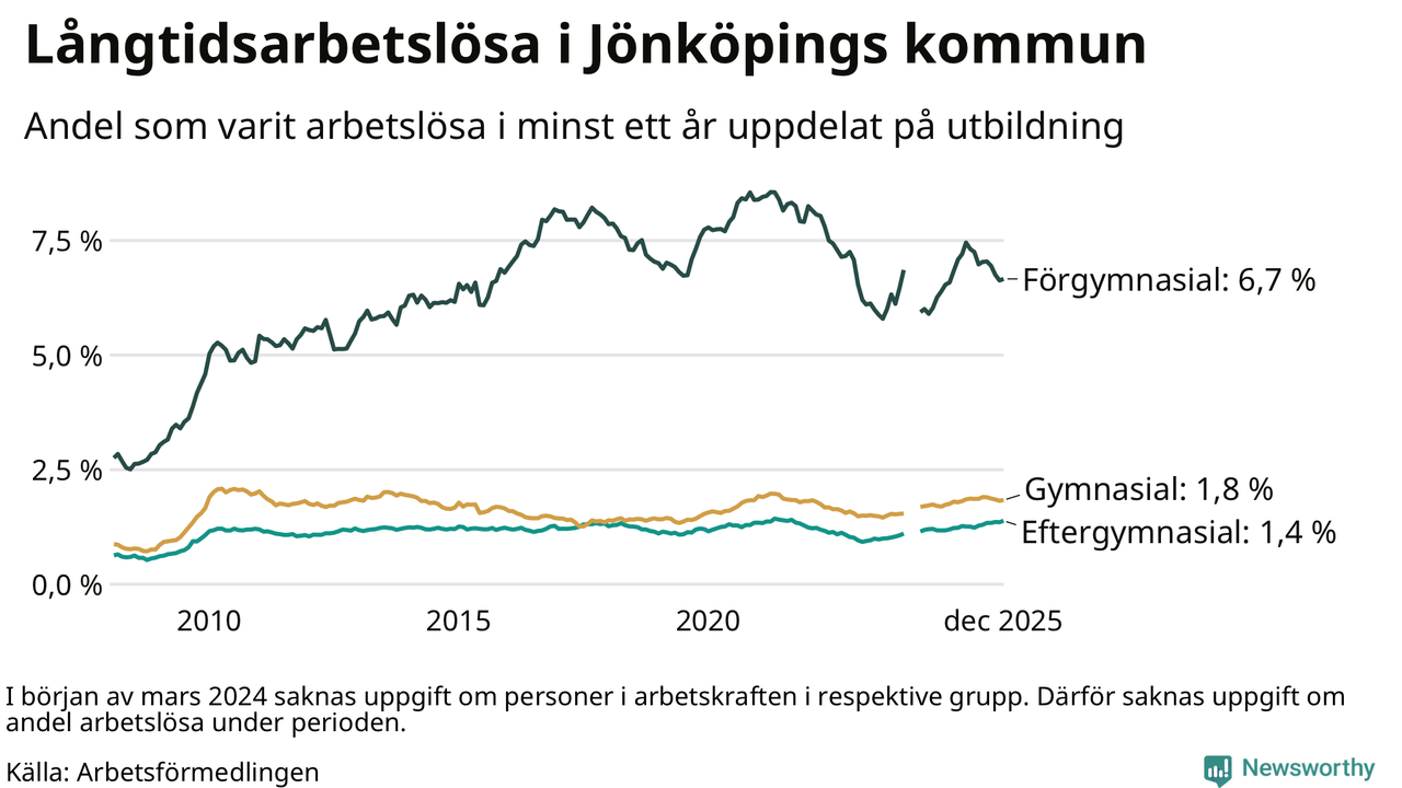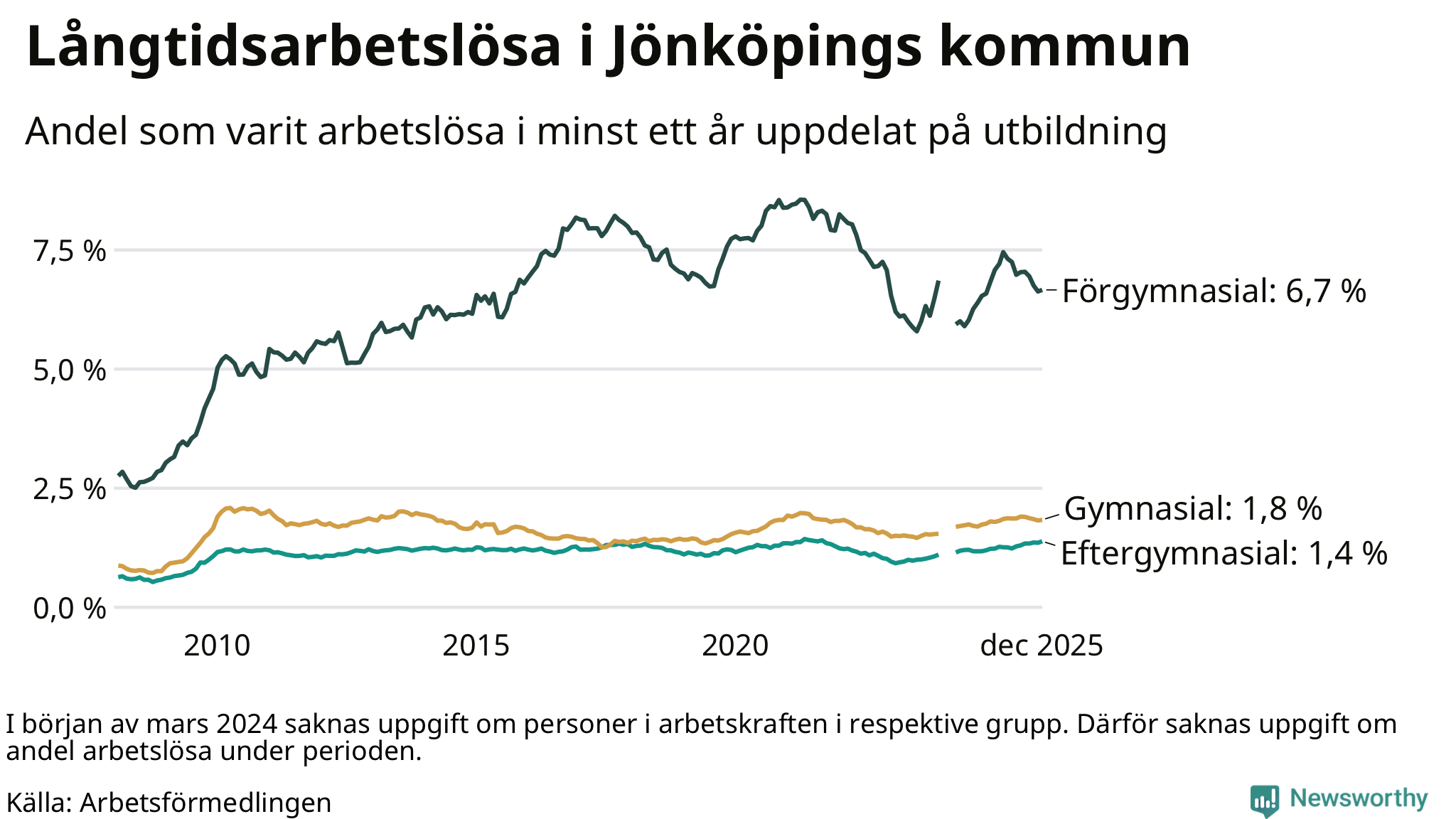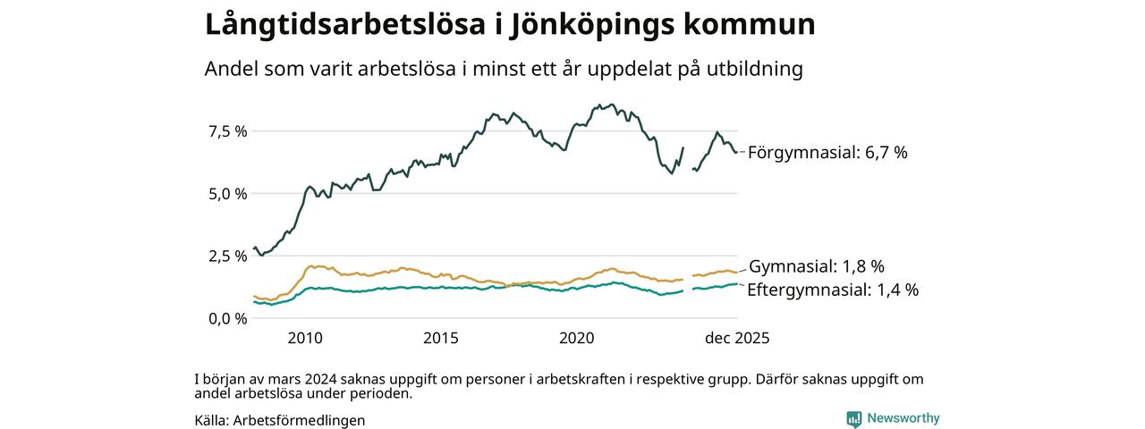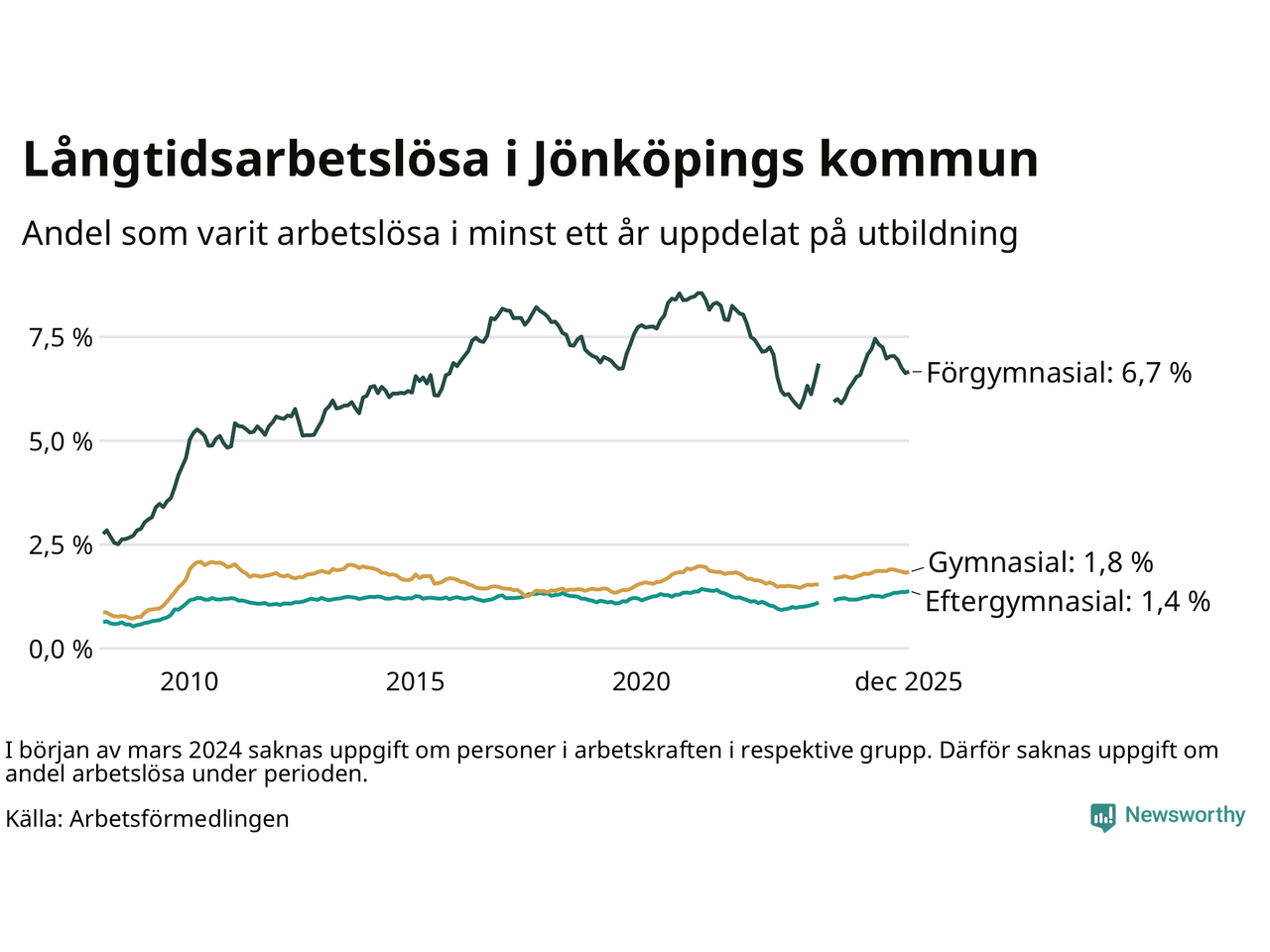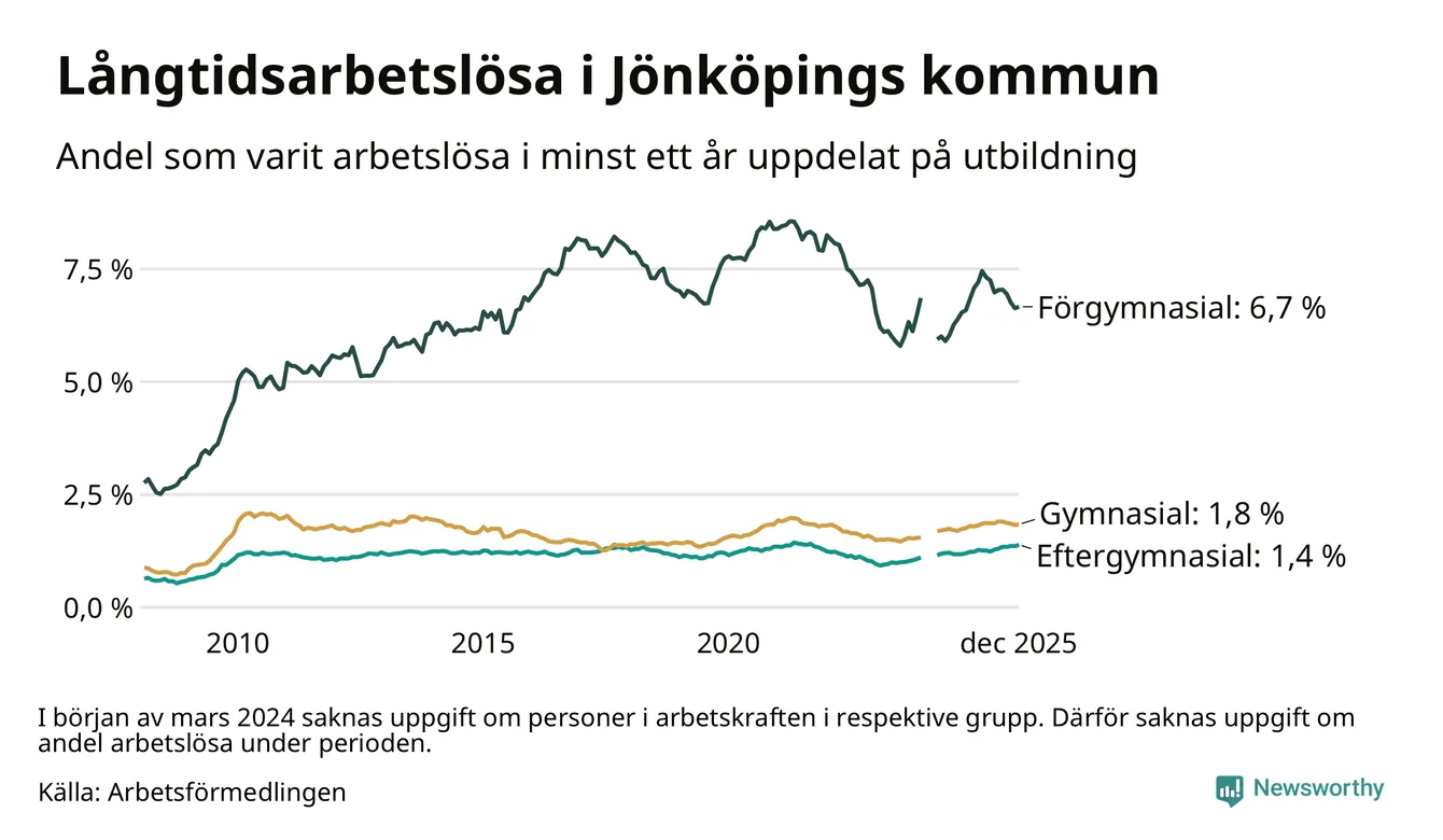 I december hade 1 694 Jönköpingsbor varit arbetslösa i minst ett år, vilket är 18 fler än månaden innan. 1 694 personer motsvarar 2,2 procent av arbetskraften i kommunen – andelen långtidsarbetslösa är ungefär på samma nivå som för ett år sedan.