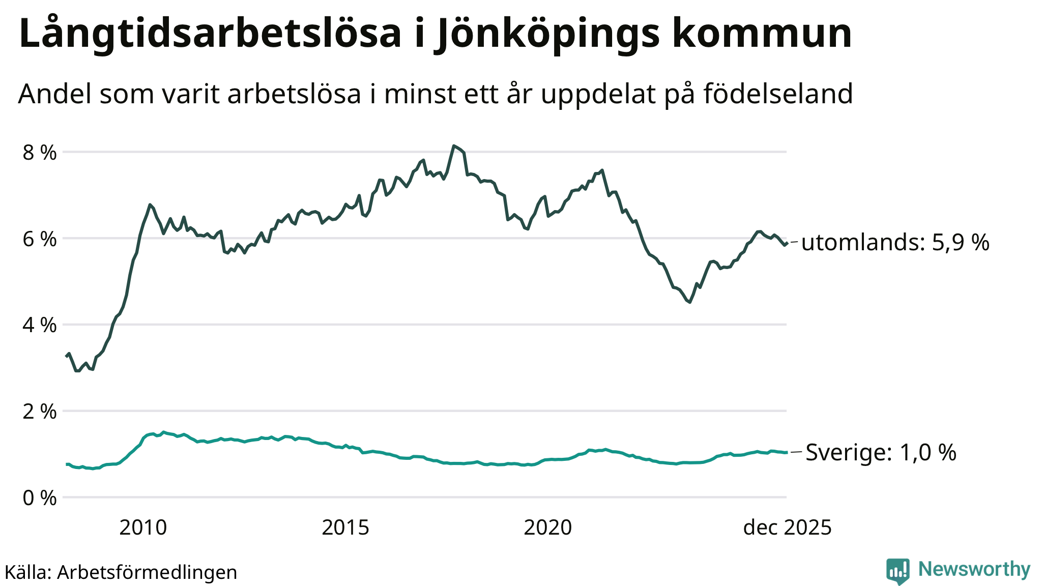 599 av de långtidsarbetslösa i Jönköpings kommun är födda i Sverige, medan 1 095 är födda utomlands. Det innebär att långtidsarbetslösheten bland Sverigefödda är 1,0 procent, medan den är sex gånger så hög – 5,9 procent – bland födda utomlands. Även i riket som helhet är arbetslösheten högre bland utrikesfödda.