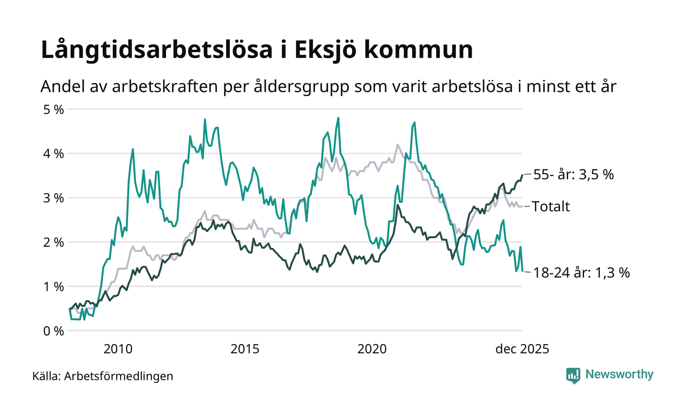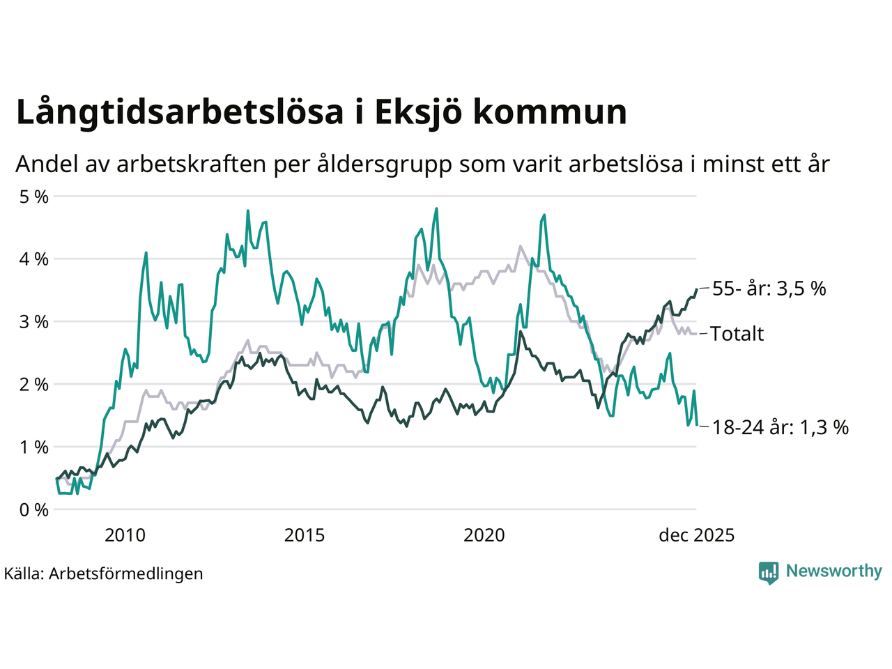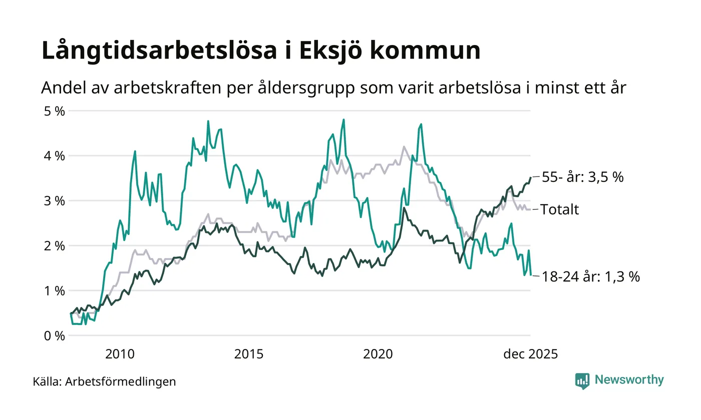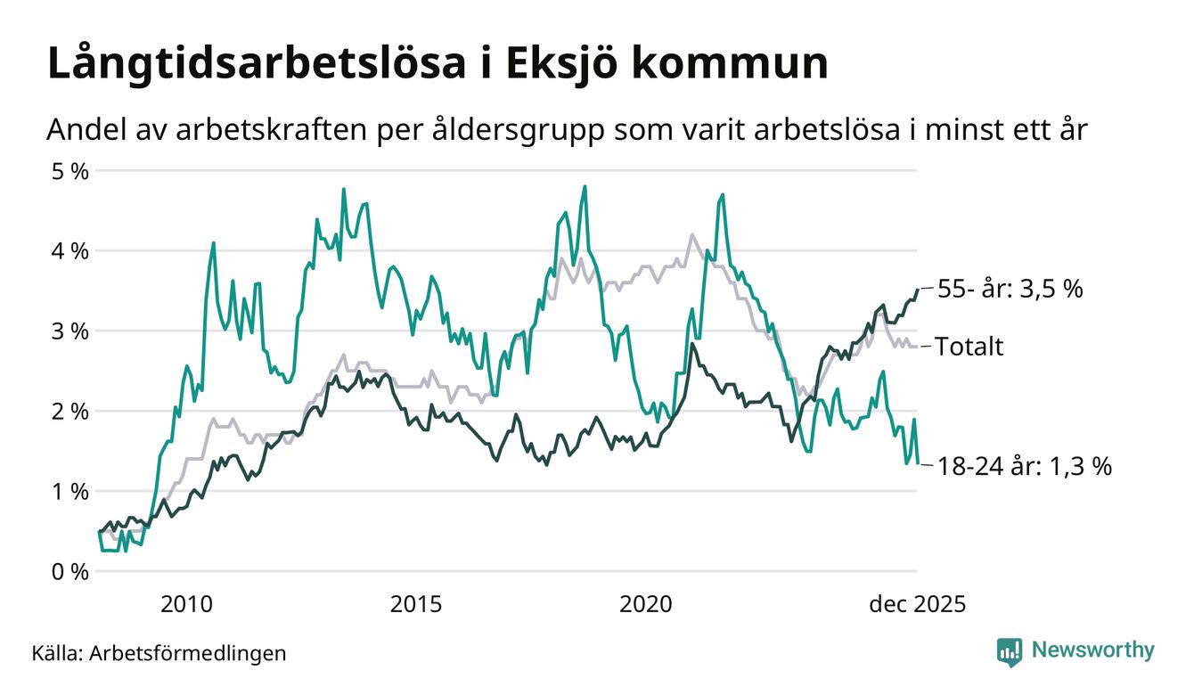 Av de 230 personerna som varit arbetslösa i mer än ett år i Eksjö kommun är 70 personer mellan 55 och 651 år och tolv är mellan 18 och 24 år. För den äldre gruppen är andelen arbetslösa 3,5 procent medan den i den yngre gruppen är 1,3 procent. Även i riket som helhet är långtidsarbetslösheten högre i gruppen äldre.