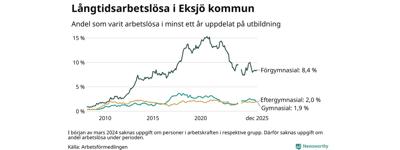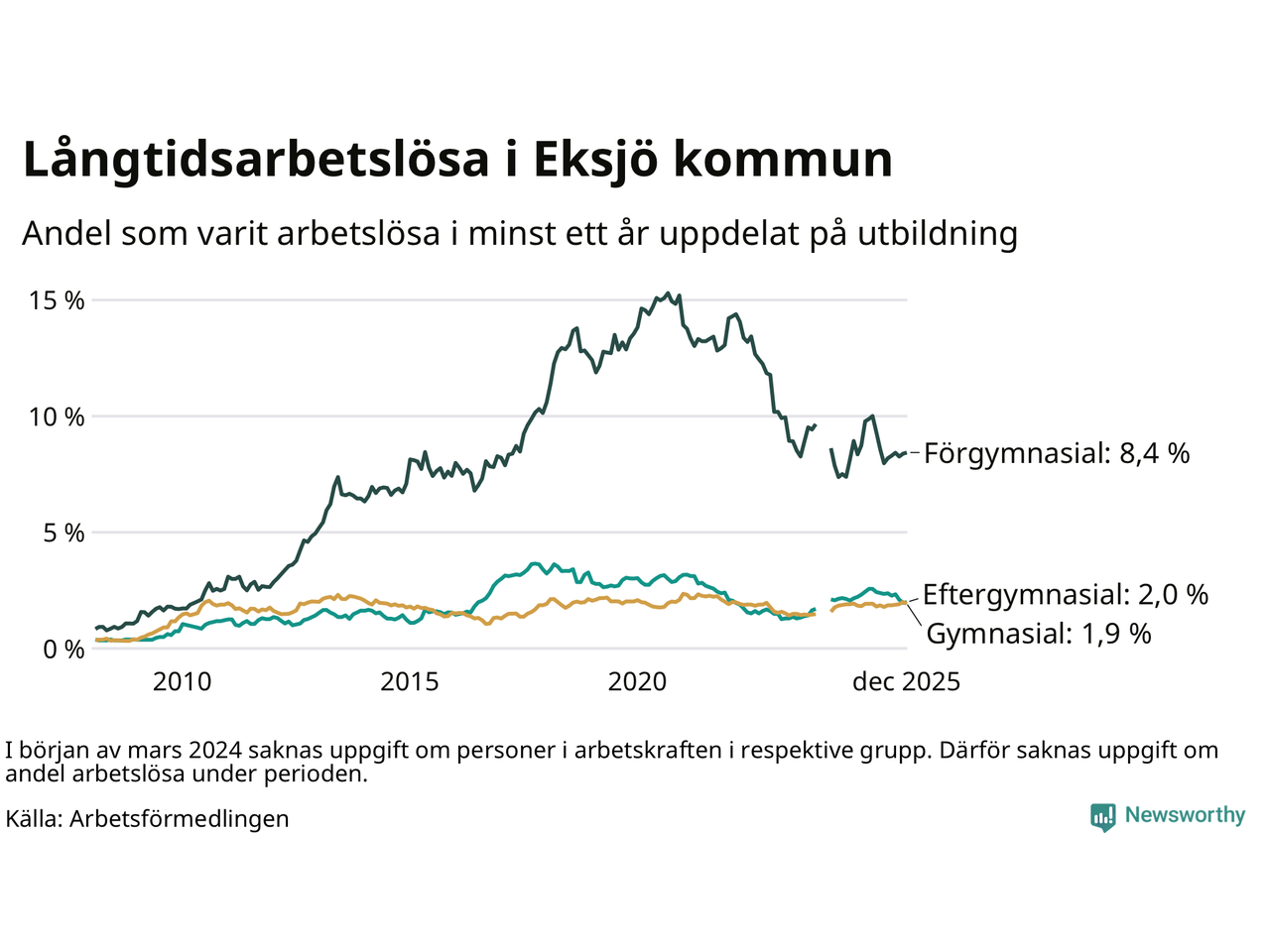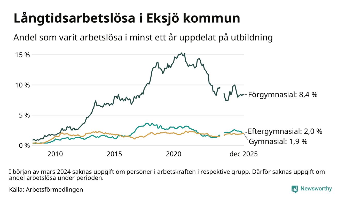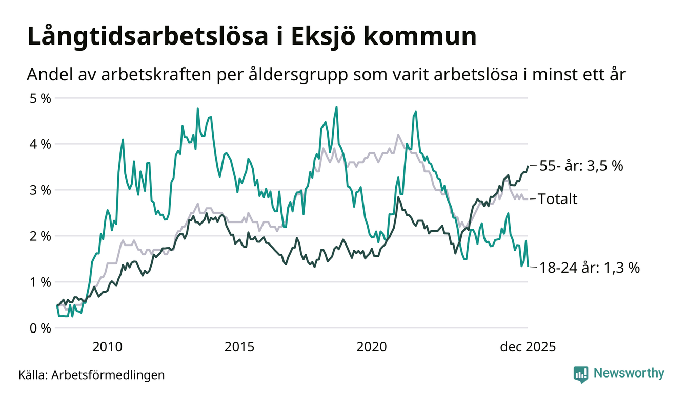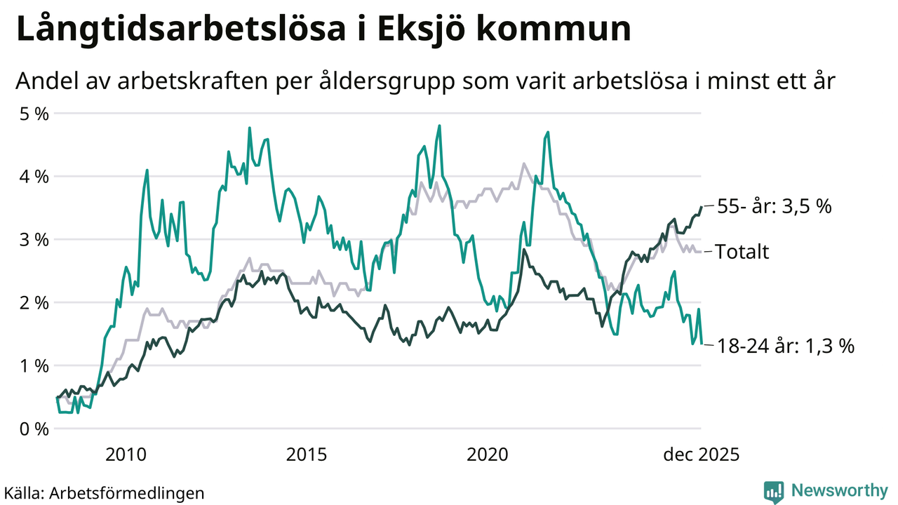 Av de 230 personerna som varit arbetslösa i mer än ett år i Eksjö kommun är 70 personer mellan 55 och 651 år och tolv är mellan 18 och 24 år. För den äldre gruppen är andelen arbetslösa 3,5 procent medan den i den yngre gruppen är 1,3 procent. Även i riket som helhet är långtidsarbetslösheten högre i gruppen äldre.