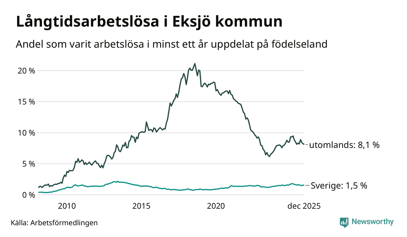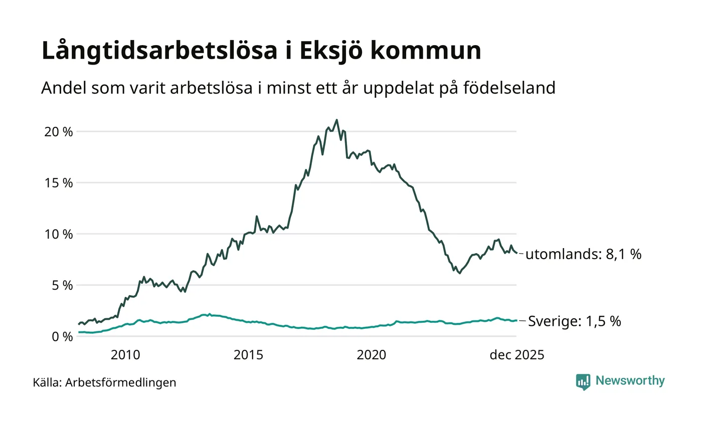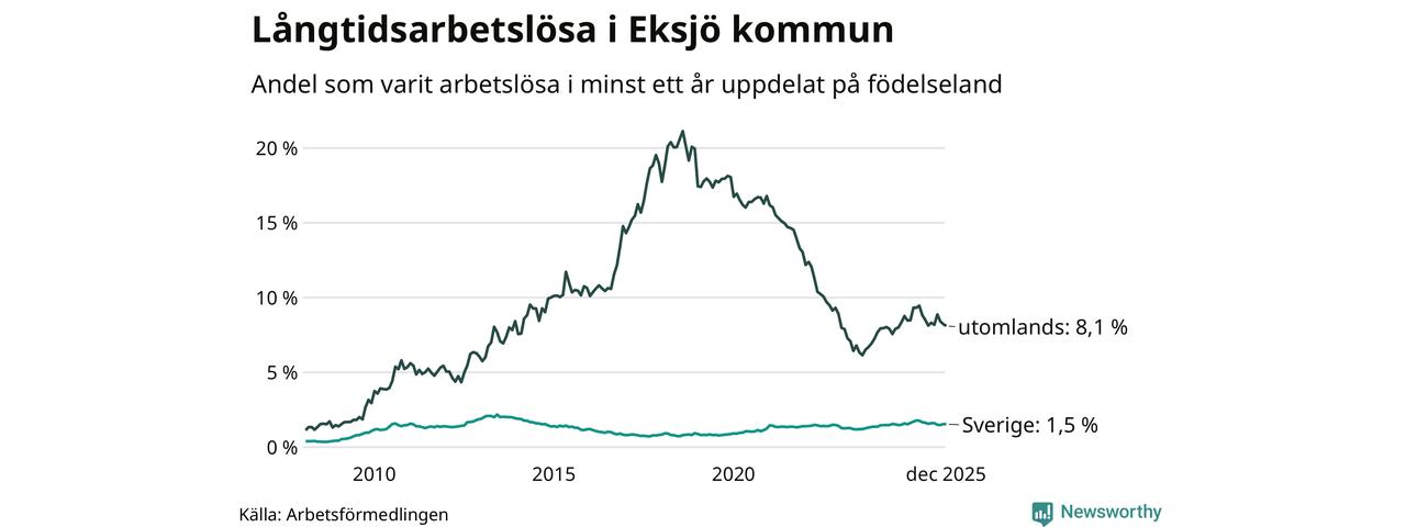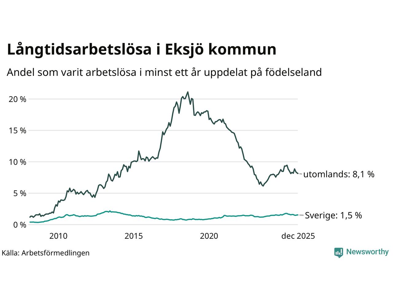 103 av de långtidsarbetslösa i Eksjö är födda i Sverige, medan 127 är födda utomlands. Det innebär att långtidsarbetslösheten bland Sverigefödda är 1,5 procent, medan den är fem gånger så hög – 8,1 procent – bland födda utomlands. Även i riket som helhet är arbetslösheten högre bland utrikesfödda.