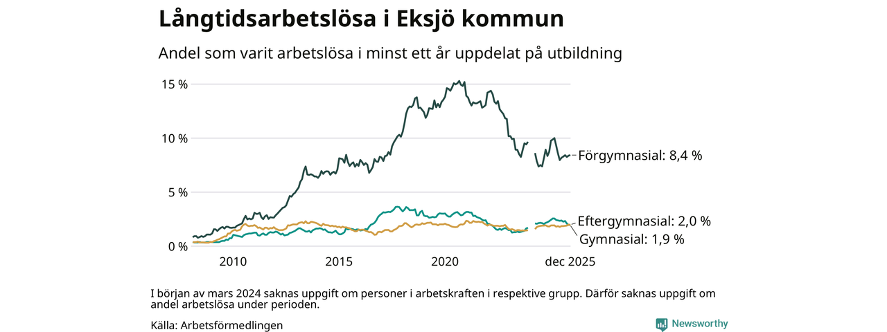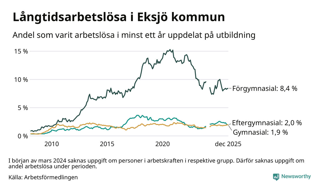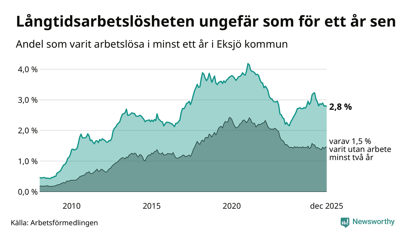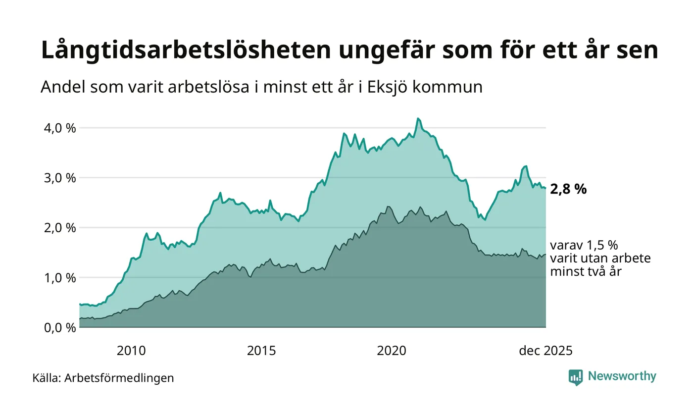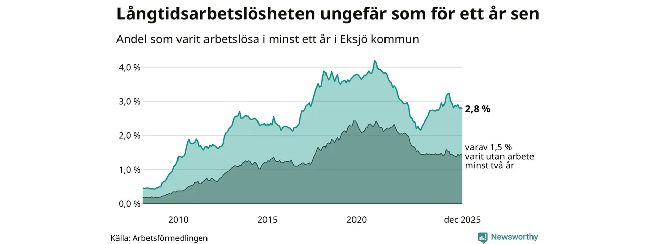 I december hade 230 Eksjöbor varit arbetslösa i minst ett år, vilket är två färre än månaden innan. 230 personer motsvarar 2,8 procent av arbetskraften i kommunen – andelen långtidsarbetslösa är ungefär på samma nivå som för ett år sedan.