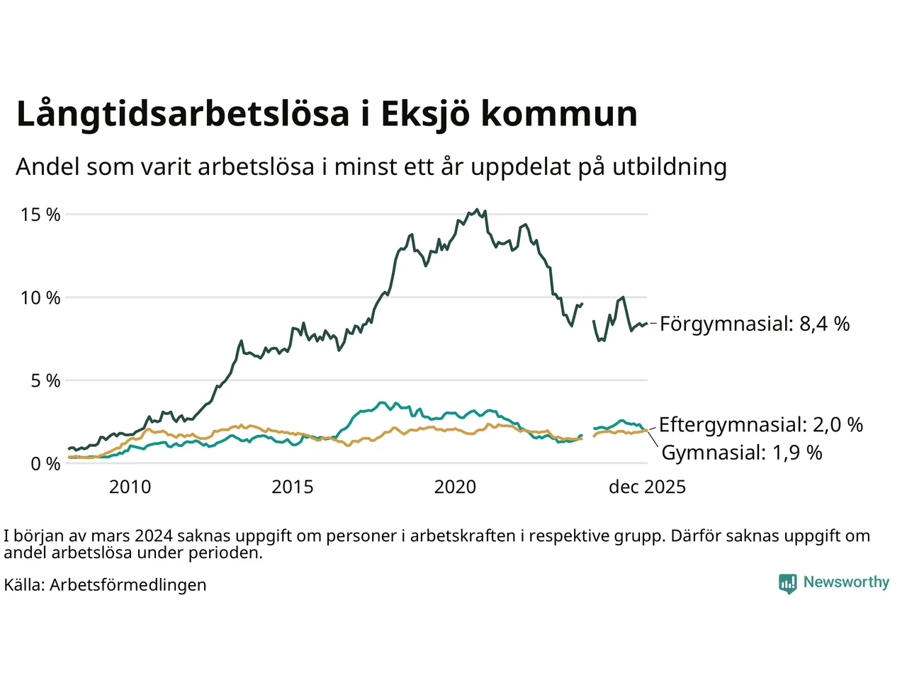 Andelen som varit utan arbete i minst ett år i Eksjö var ungefär lika stor i december jämfört med samma månad för ett år sedan. Det visar Arbetsfömedlingens senaste månadsstatistik.