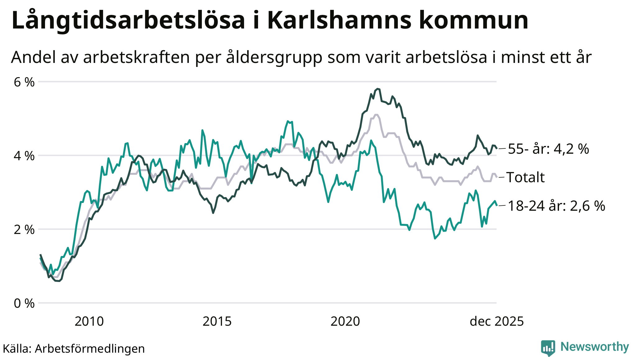 Graf: Andel arbetslösa uppdelat i åldersgrupper i Karlshamn