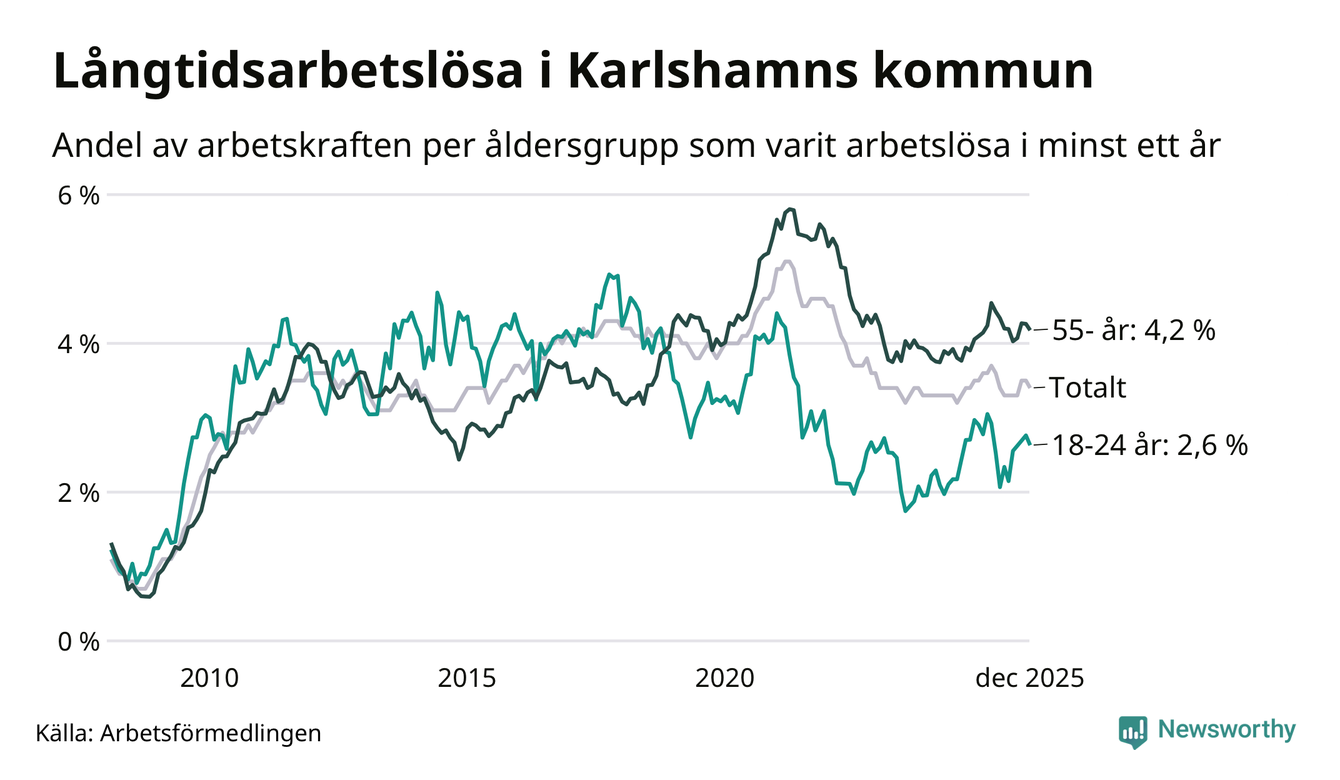 Av de 514 personerna som varit arbetslösa i mer än ett år i Karlshamns kommun är 162 personer mellan 55 och 651 år och 39 är mellan 18 och 24 år. För den äldre gruppen är andelen arbetslösa 4,2 procent medan den i den yngre gruppen är 2,6 procent. Även i riket som helhet är långtidsarbetslösheten högre i gruppen äldre.