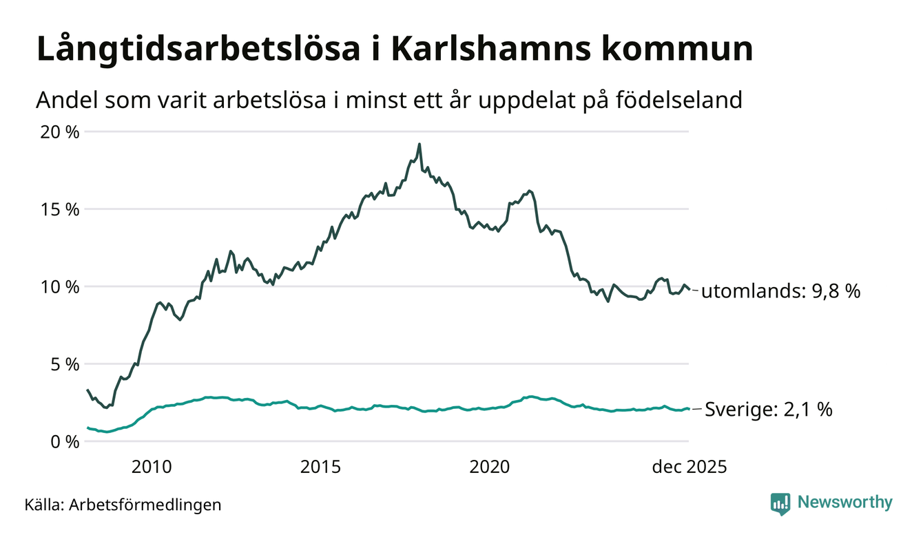 256 av de långtidsarbetslösa i Karlshamn är födda i Sverige, medan 258 är födda utomlands. Det innebär att långtidsarbetslösheten bland Sverigefödda är 2,1 procent, medan den är fem gånger så hög – 9,8 procent – bland födda utomlands. Även i riket som helhet är arbetslösheten högre bland utrikesfödda.