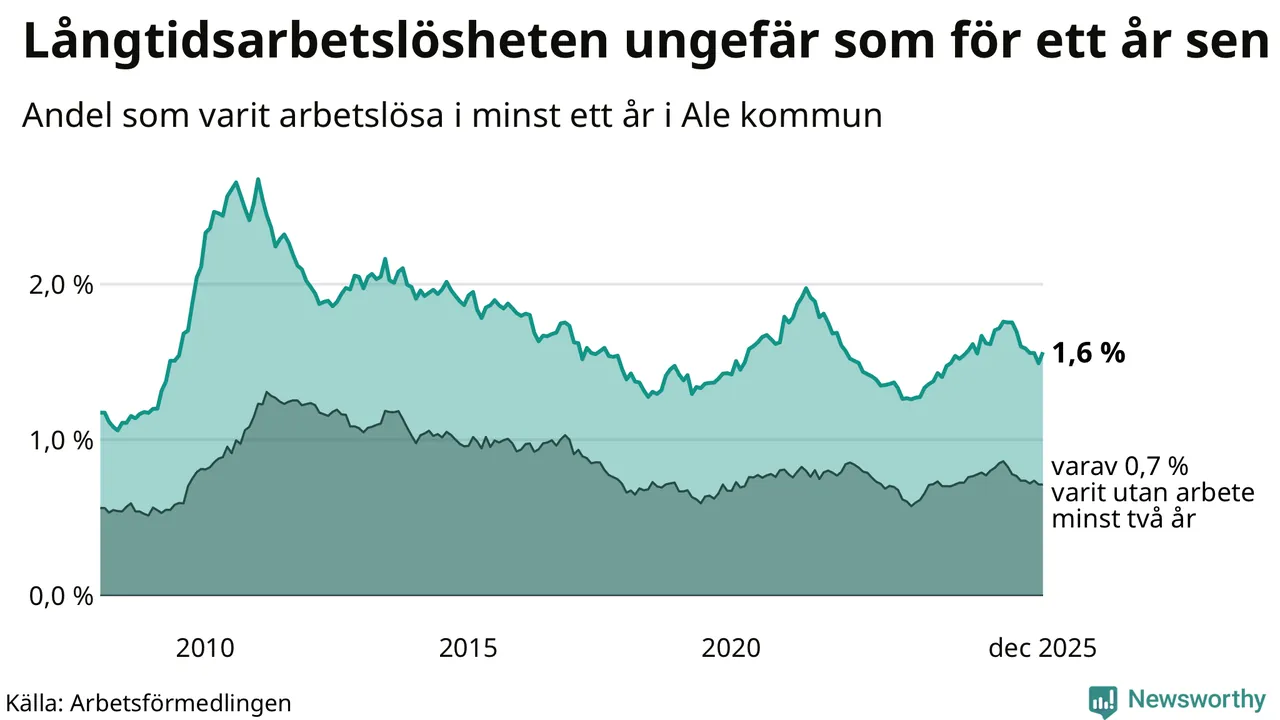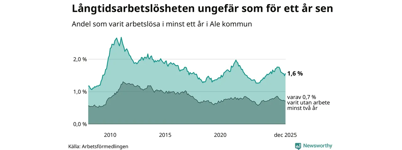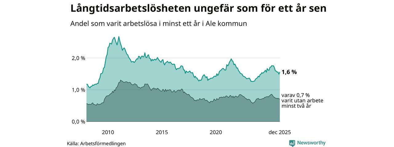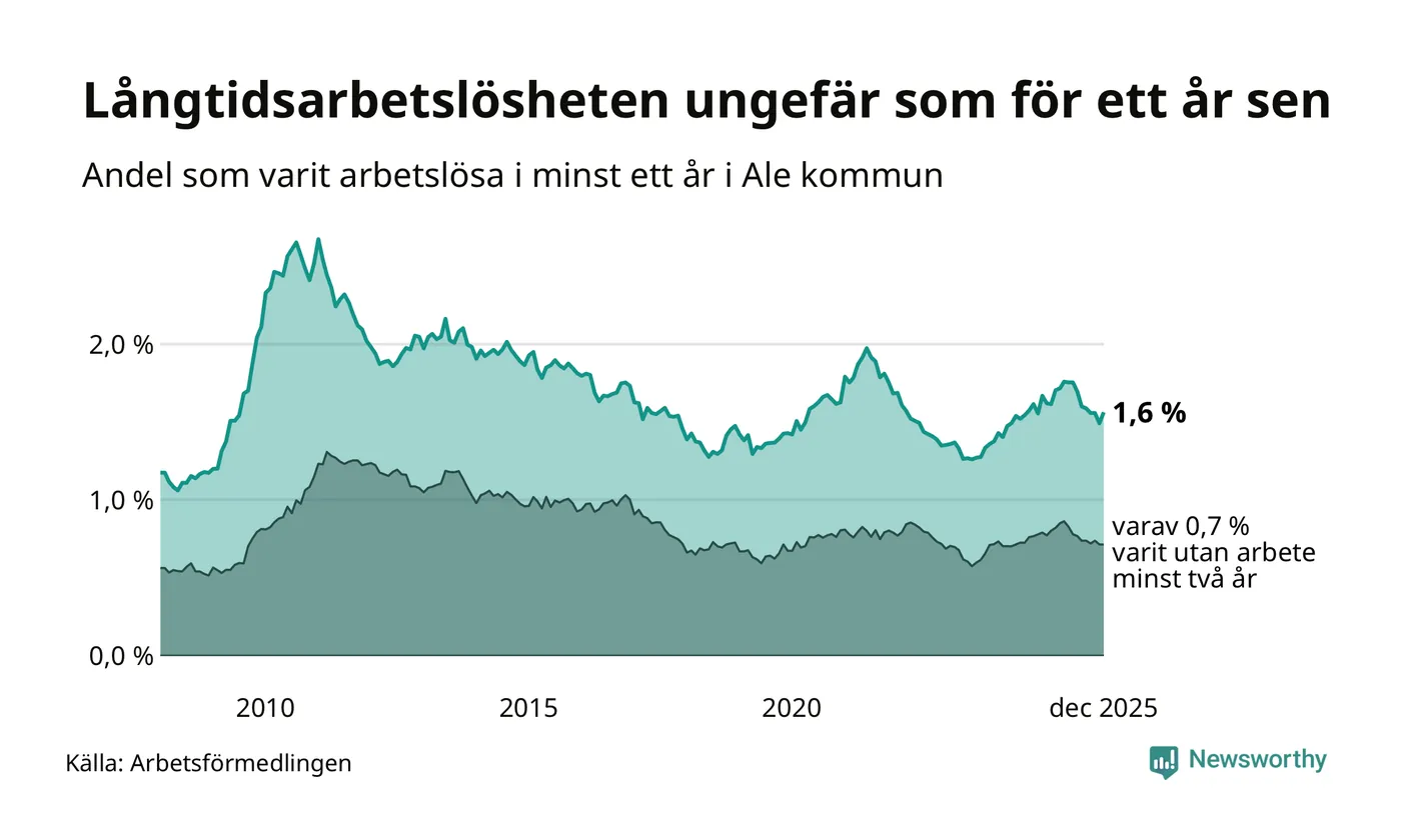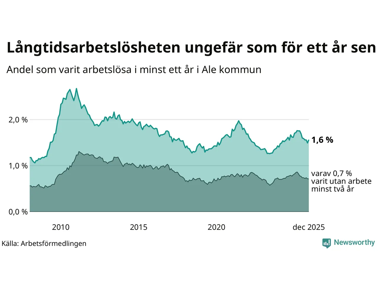 I december hade 261 Alebor varit arbetslösa i minst ett år, vilket är tolv fler än månaden innan. Det är den första månaden sedan mars 2025 som antalet arbetslösa ökar. 261 personer motsvarar 1,6 procent av arbetskraften i kommunen – andelen långtidsarbetslösa är ungefär på samma nivå som för ett år sedan.