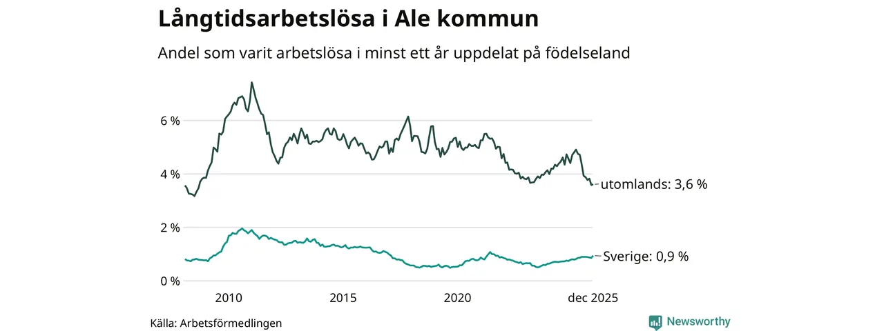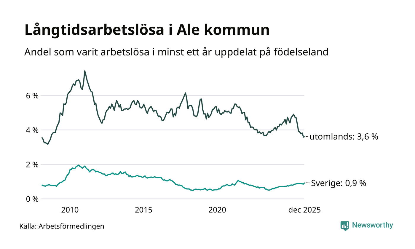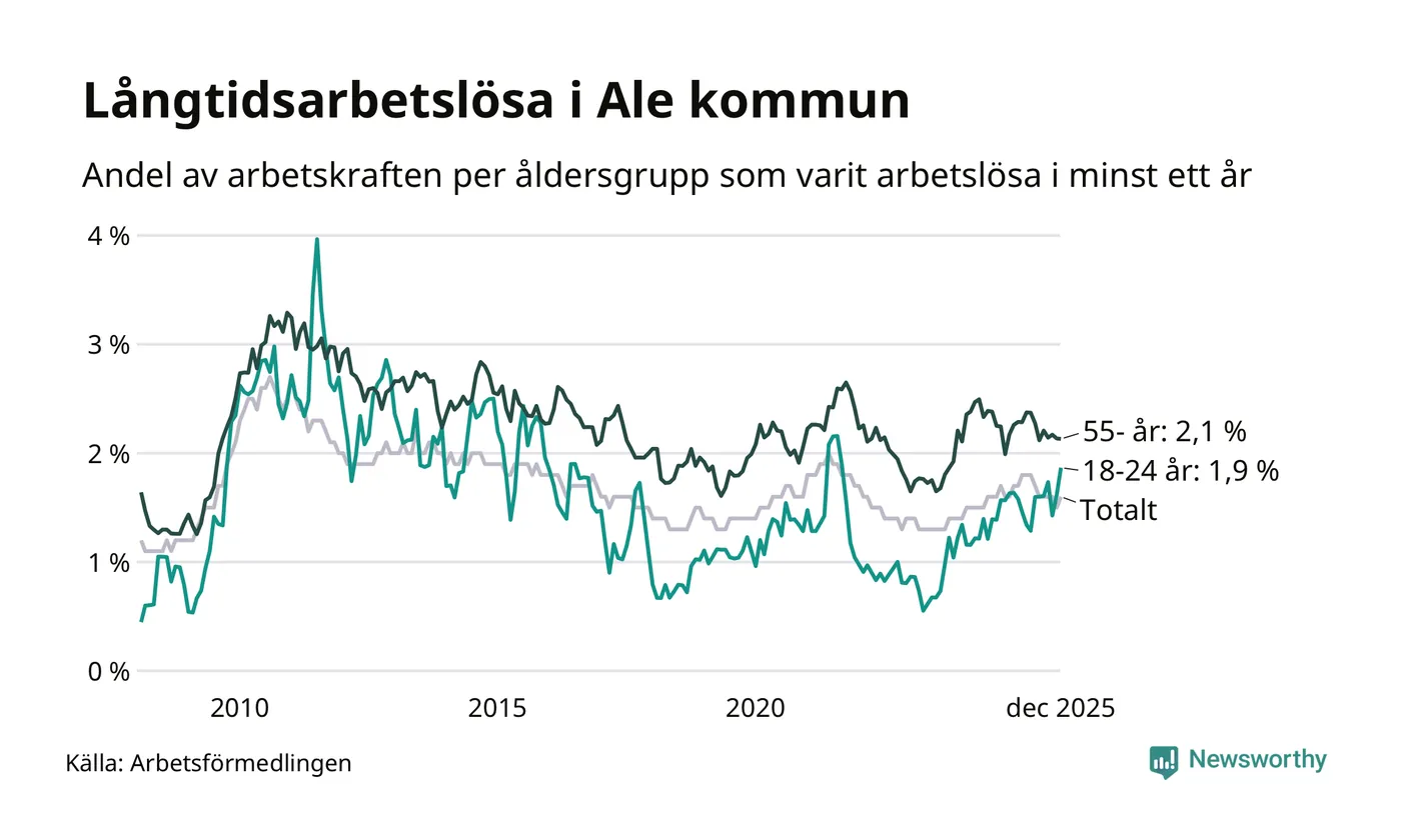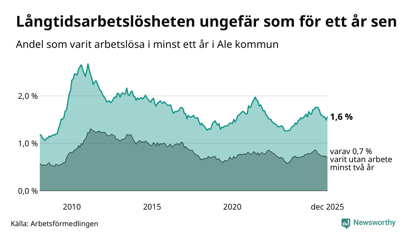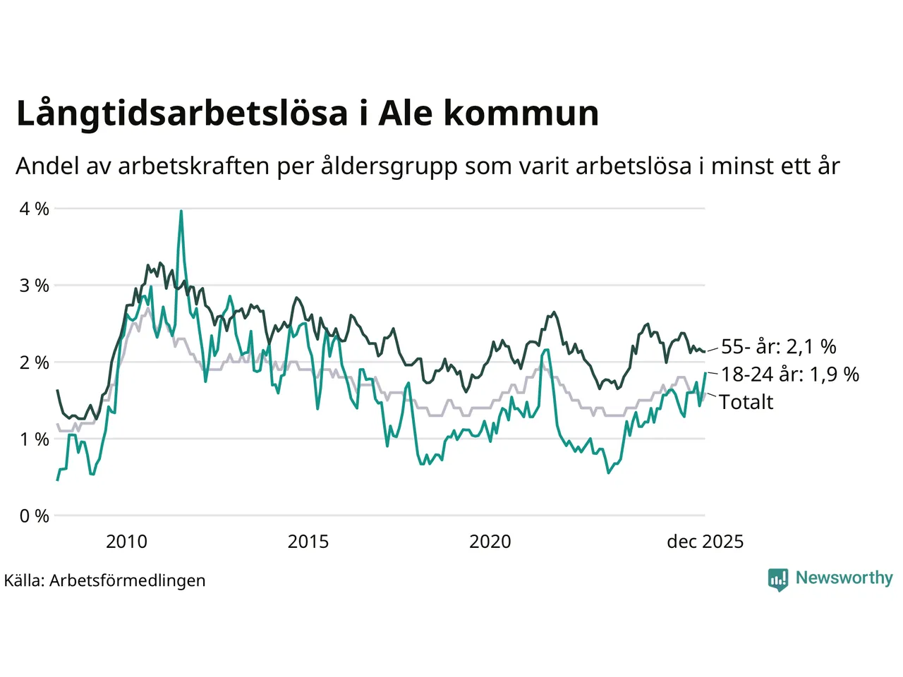 I december hade 261 Alebor varit arbetslösa i minst ett år, vilket är tolv fler än månaden innan. Det är den första månaden sedan mars 2025 som antalet arbetslösa ökar. 261 personer motsvarar 1,6 procent av arbetskraften i kommunen – andelen långtidsarbetslösa är ungefär på samma nivå som för ett år sedan.