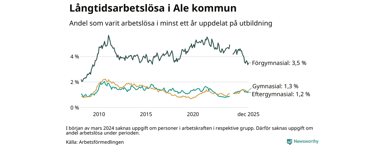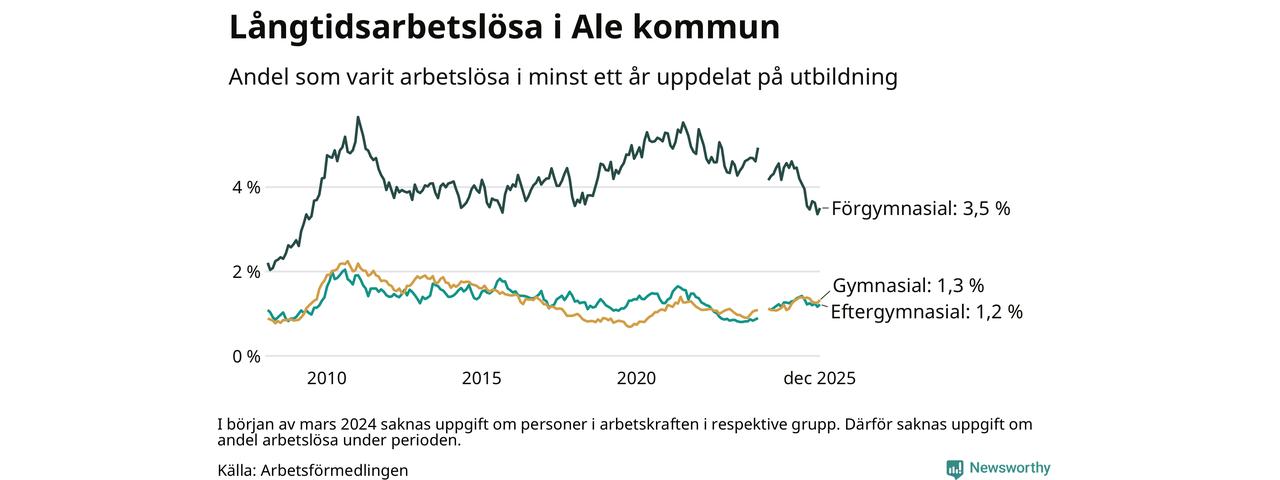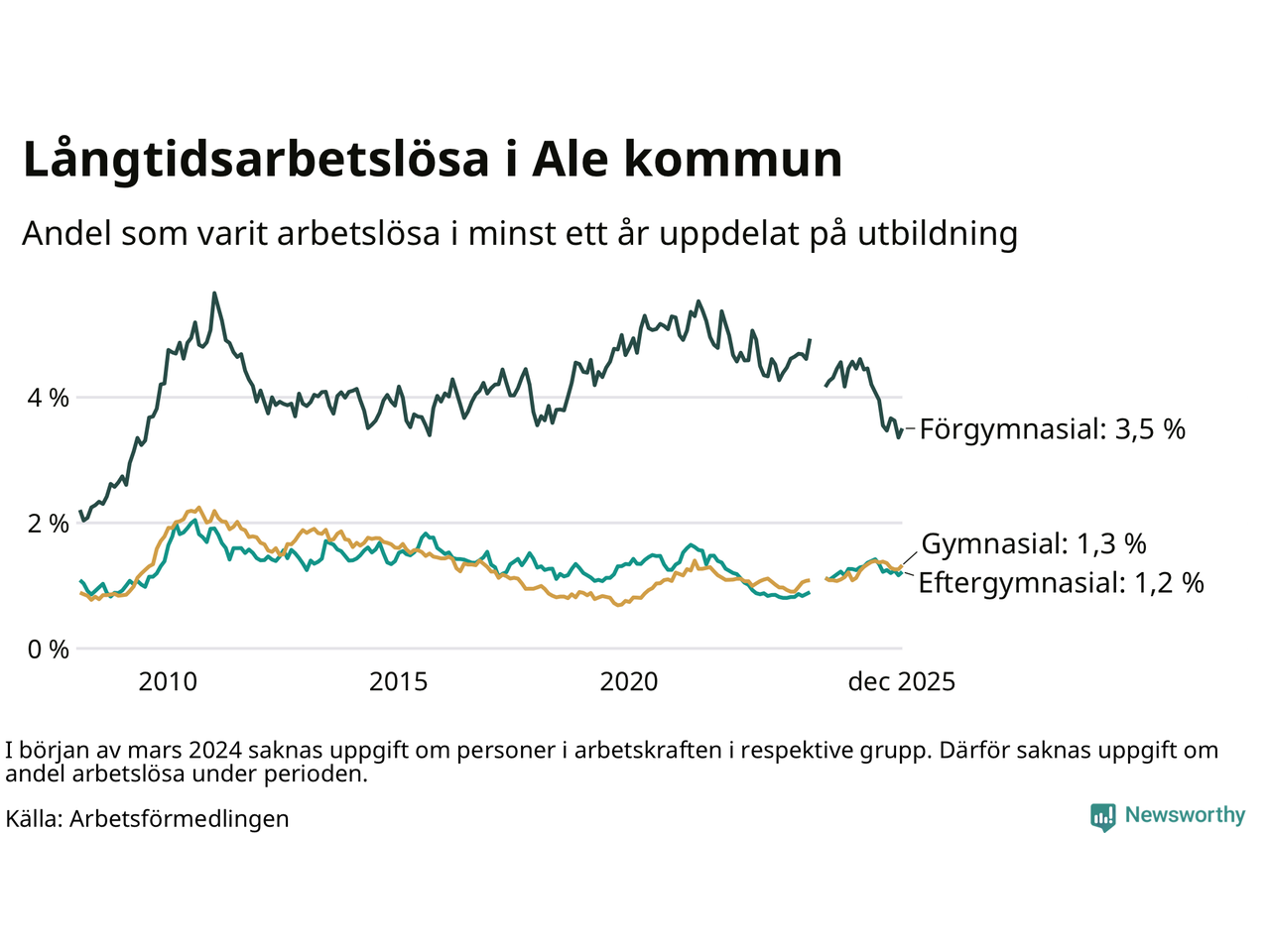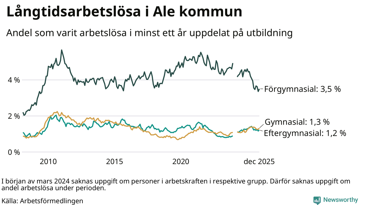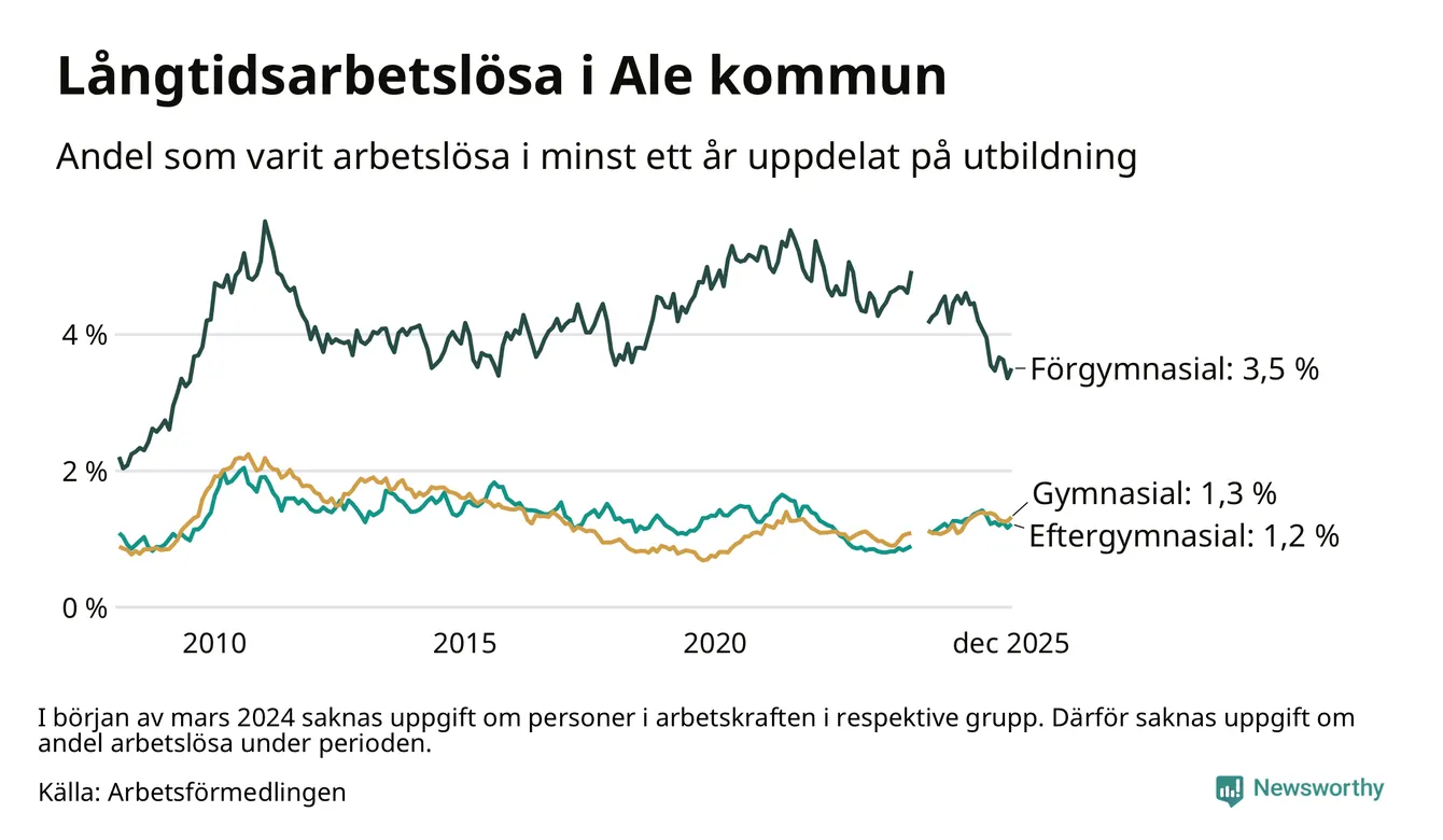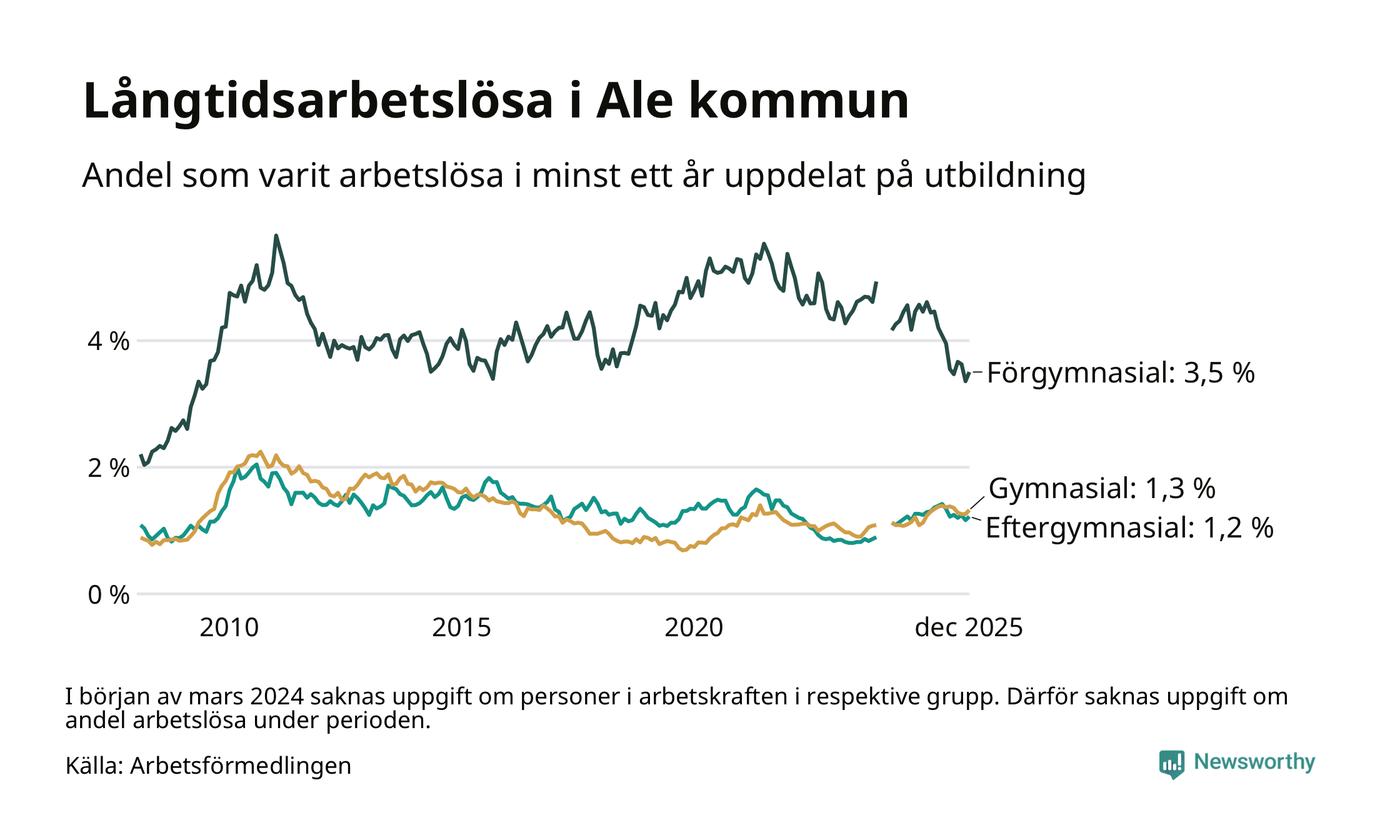 I december hade 261 Alebor varit arbetslösa i minst ett år, vilket är tolv fler än månaden innan. Det är den första månaden sedan mars 2025 som antalet arbetslösa ökar. 261 personer motsvarar 1,6 procent av arbetskraften i kommunen – andelen långtidsarbetslösa är ungefär på samma nivå som för ett år sedan.