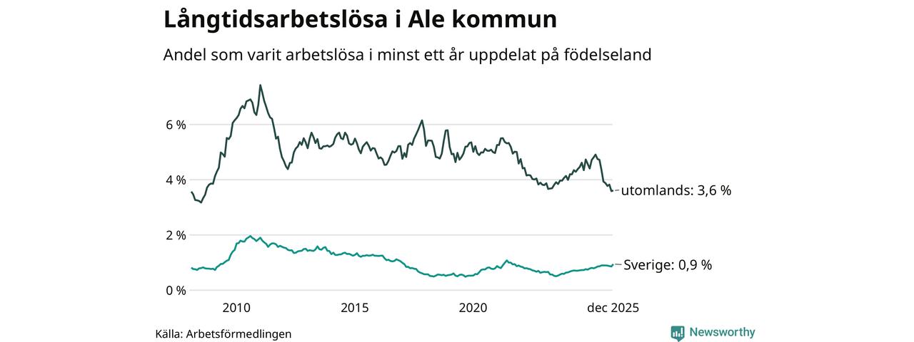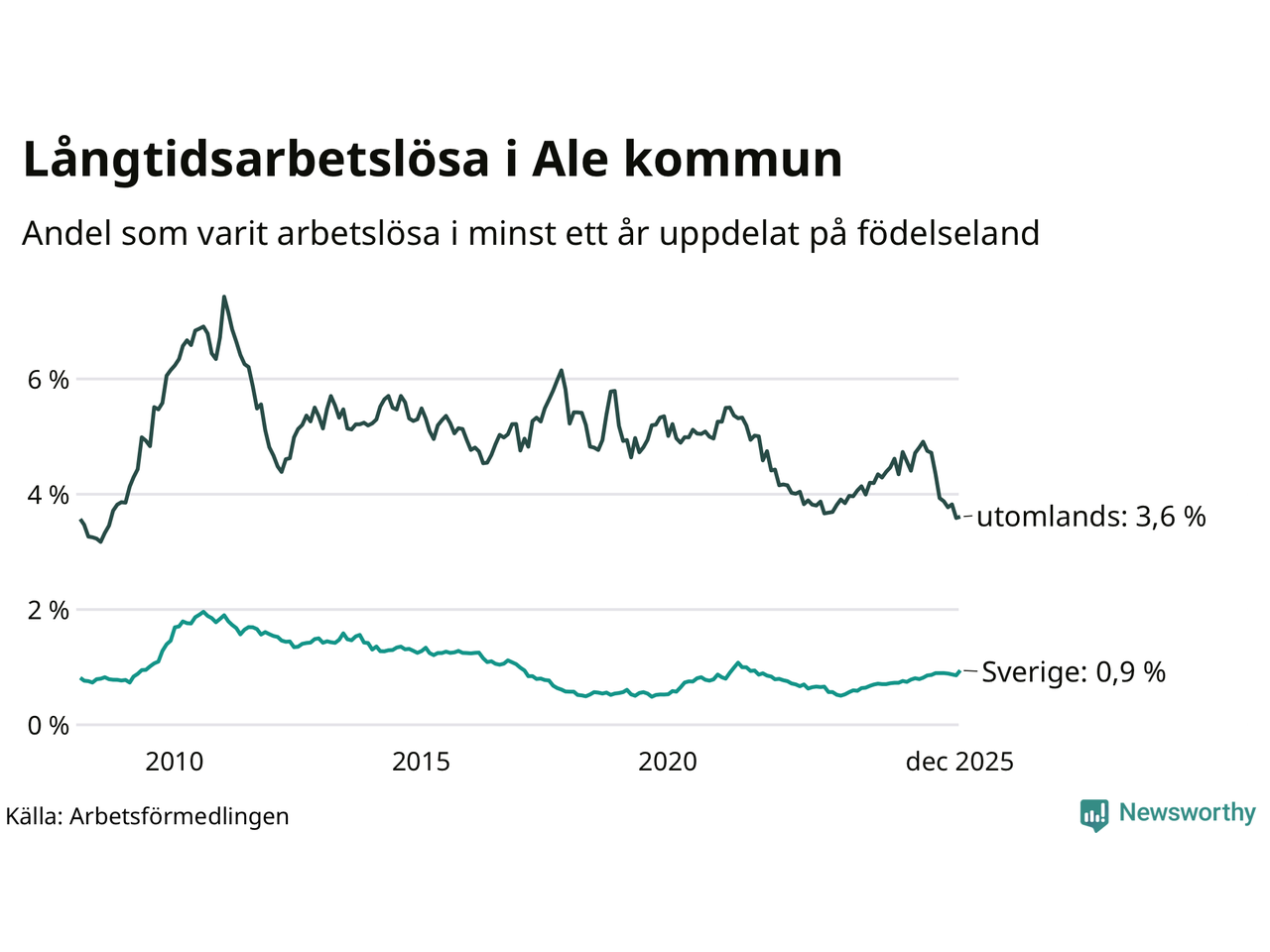 121 av de långtidsarbetslösa i Ale är födda i Sverige, medan 140 är födda utomlands. Det innebär att långtidsarbetslösheten bland Sverigefödda är 0,9 procent, medan den är fyra gånger så hög – 3,6 procent – bland födda utomlands. Även i riket som helhet är arbetslösheten högre bland utrikesfödda.