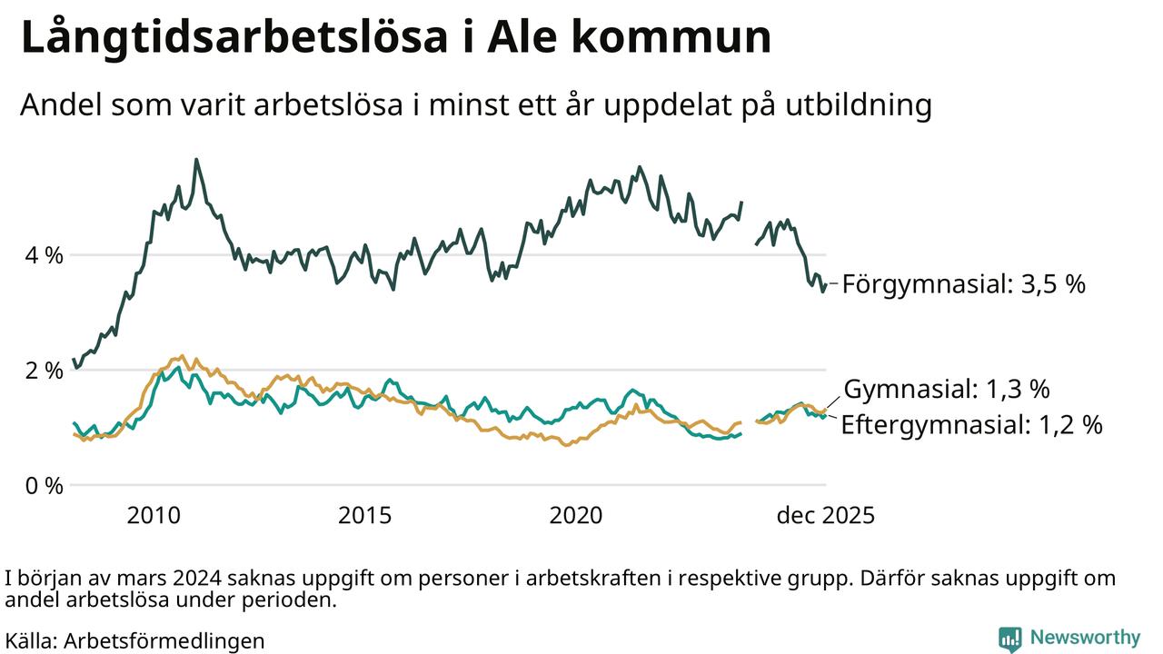 Av de 261 personerna som varit arbetslösa i mer än ett år i Ale kommun är 70 personer mellan 55 och 651 år och 30 är mellan 18 och 24 år. För den äldre gruppen är andelen arbetslösa 2,1 procent medan den i den yngre gruppen är 1,9 procent. Även i riket som helhet är långtidsarbetslösheten högre i gruppen äldre.
