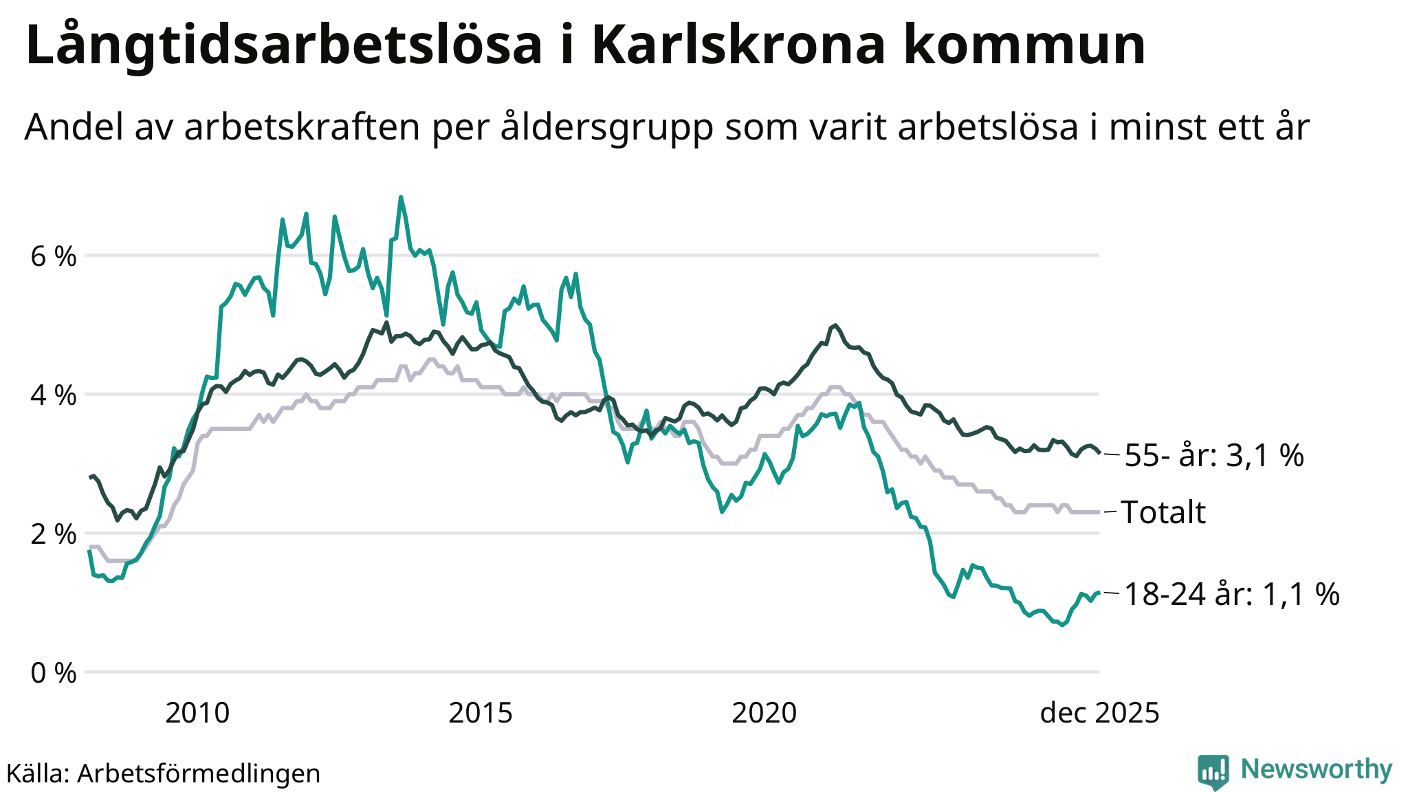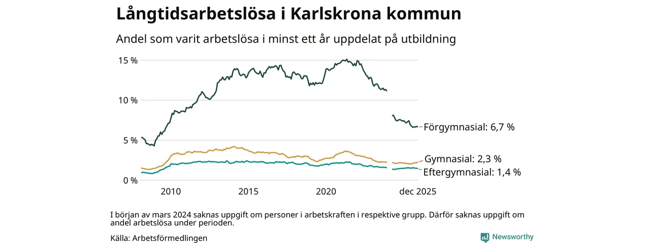 Av de 758 personerna som varit arbetslösa i mer än ett år i Karlskrona kommun är 223 personer mellan 55 och 651 år och 46 är mellan 18 och 24 år. För den äldre gruppen är andelen arbetslösa 3,1 procent medan den i den yngre gruppen är 1,1 procent. Även i riket som helhet är långtidsarbetslösheten högre i gruppen äldre.