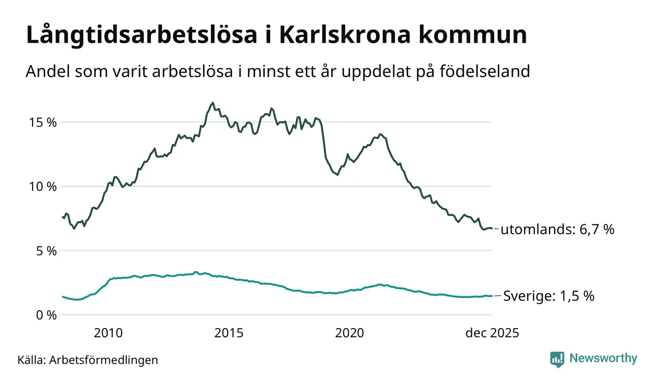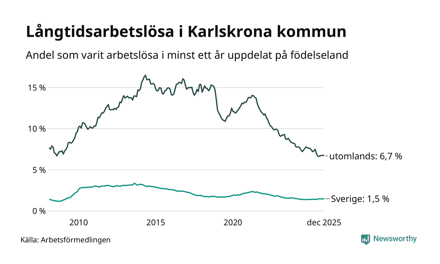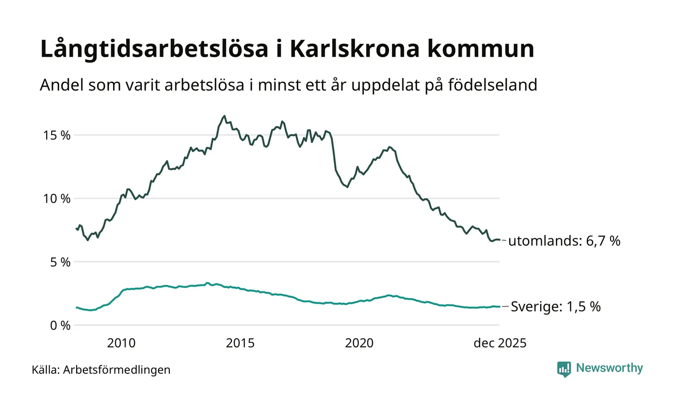 404 av de långtidsarbetslösa i Karlskrona är födda i Sverige, medan 354 är födda utomlands. Det innebär att långtidsarbetslösheten bland Sverigefödda är 1,5 procent, medan den är fyra gånger så hög – 6,7 procent – bland födda utomlands. Även i riket som helhet är arbetslösheten högre bland utrikesfödda.