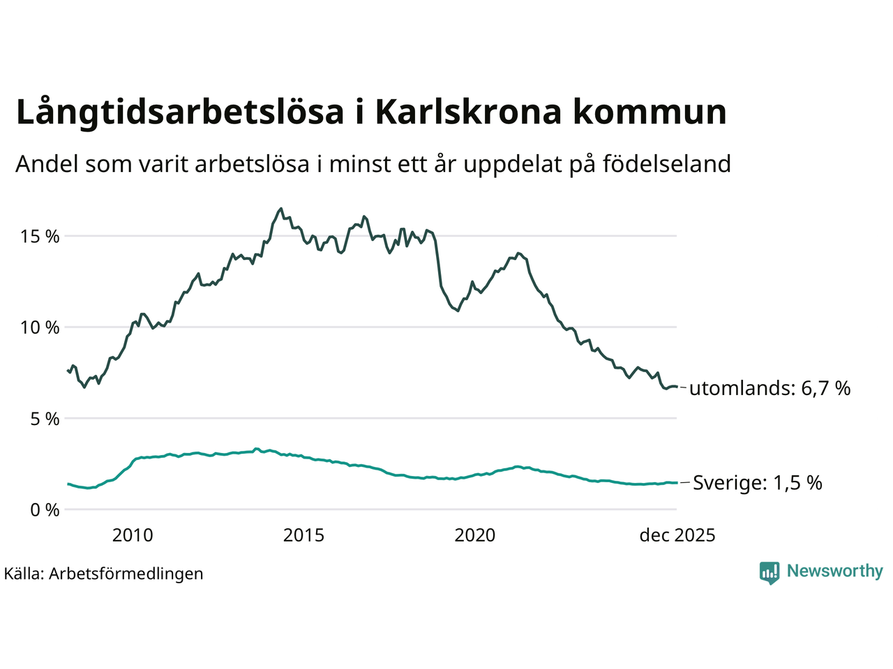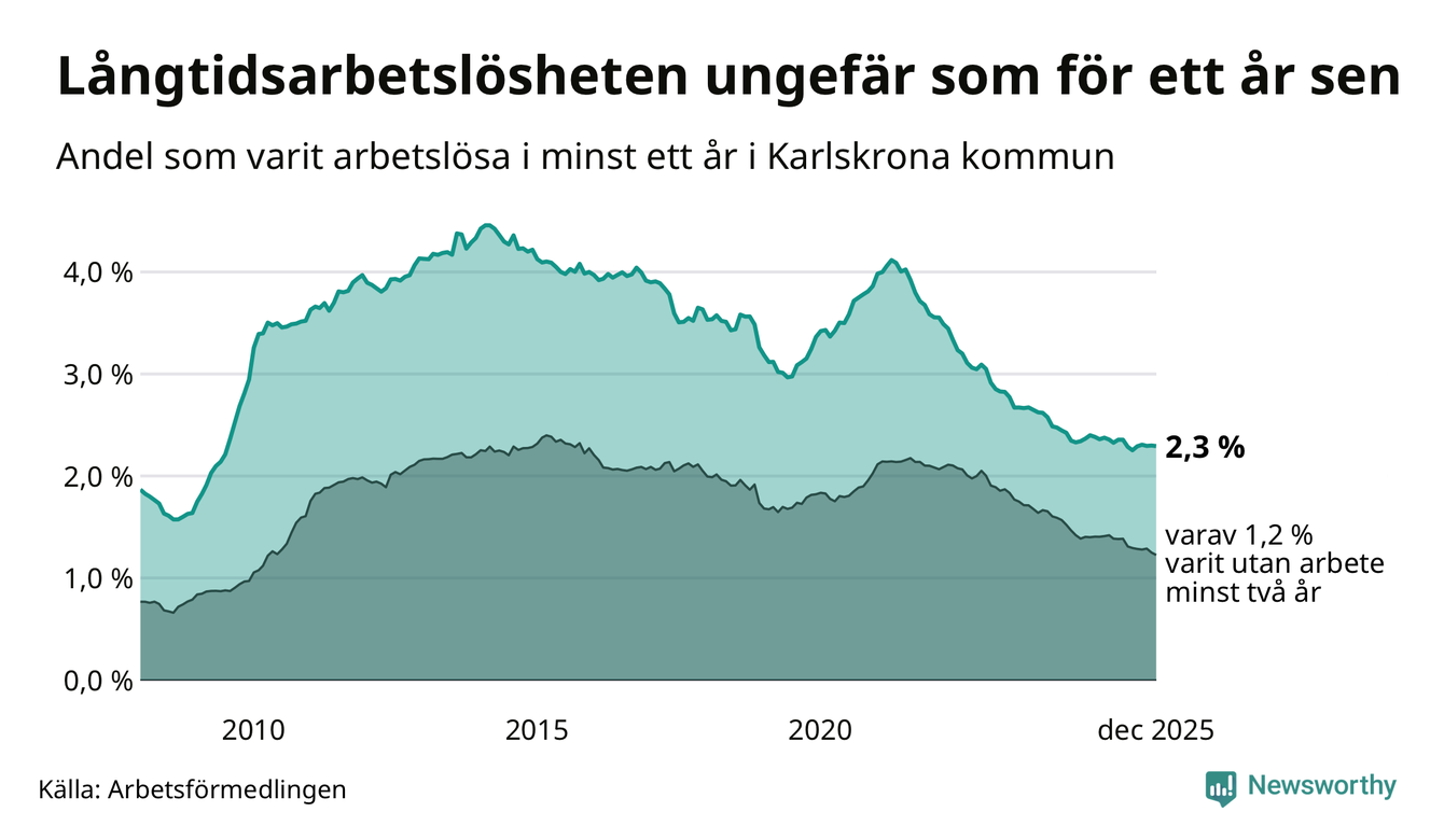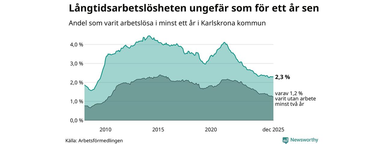 I december hade 758 Karlskronabor varit arbetslösa i minst ett år, vilket är två färre än månaden innan. 758 personer motsvarar 2,3 procent av arbetskraften i kommunen – andelen långtidsarbetslösa är ungefär på samma nivå som för ett år sedan.