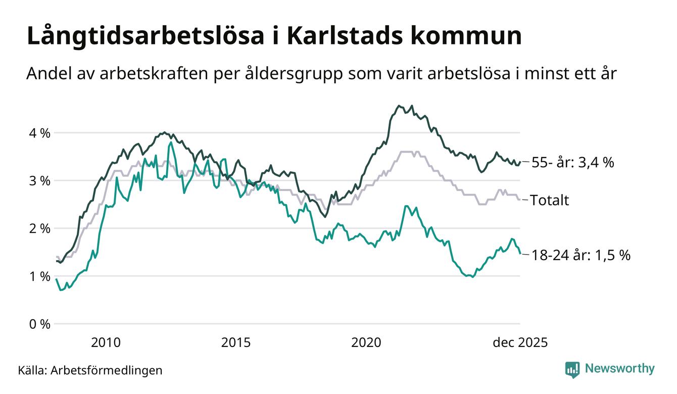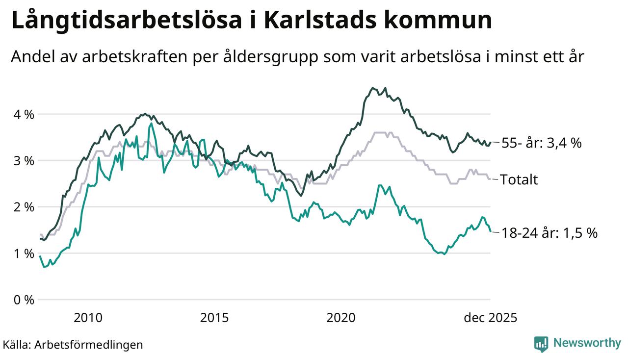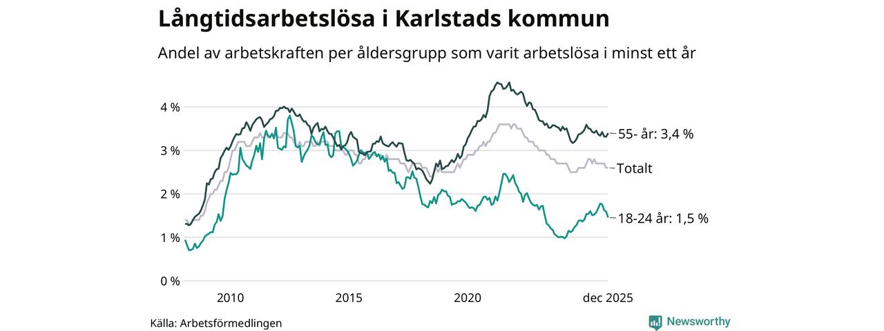 Av de 1 332 personerna som varit arbetslösa i mer än ett år i Karlstads kommun är 347 personer mellan 55 och 651 år och 92 är mellan 18 och 24 år. För den äldre gruppen är andelen arbetslösa 3,4 procent medan den i den yngre gruppen är 1,5 procent. Även i riket som helhet är långtidsarbetslösheten högre i gruppen äldre.