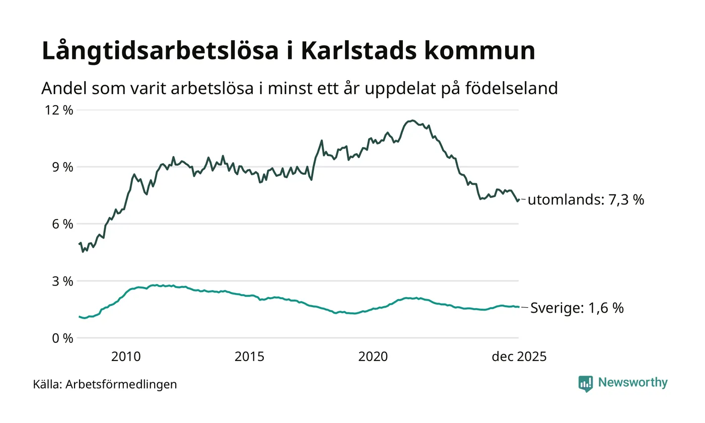 669 av de långtidsarbetslösa i Karlstad är födda i Sverige, medan 663 är födda utomlands. Det innebär att långtidsarbetslösheten bland Sverigefödda är 1,6 procent, medan den är fem gånger så hög – 7,3 procent – bland födda utomlands. Även i riket som helhet är arbetslösheten högre bland utrikesfödda.