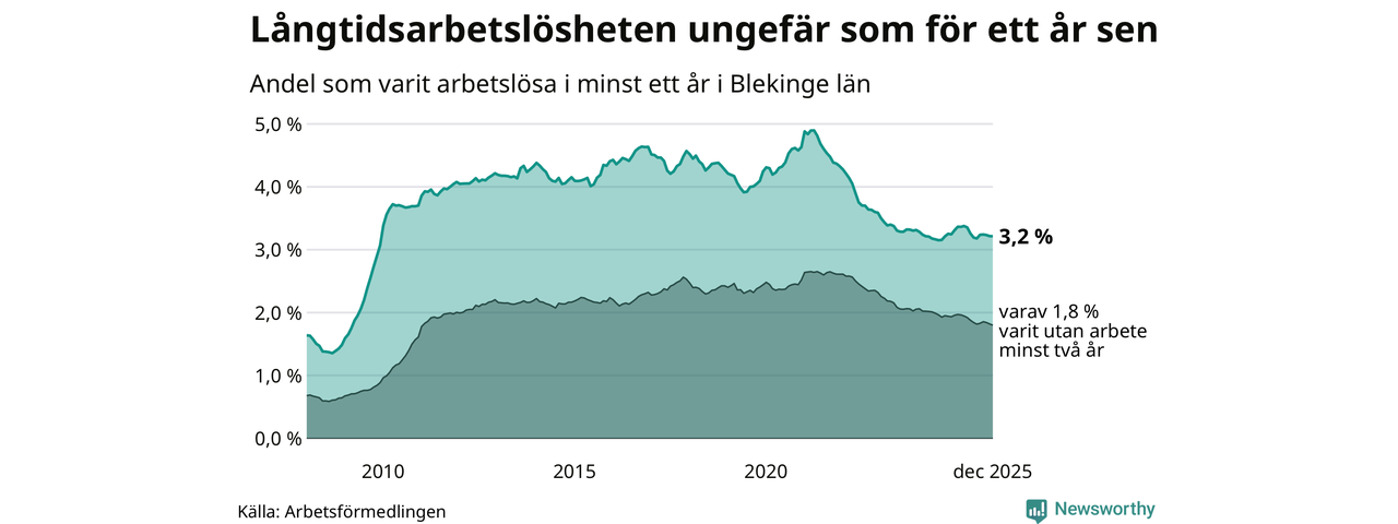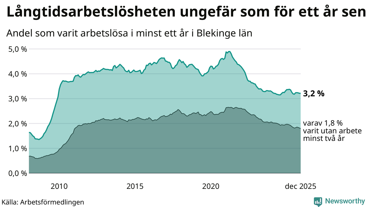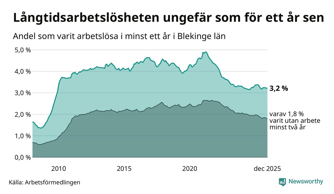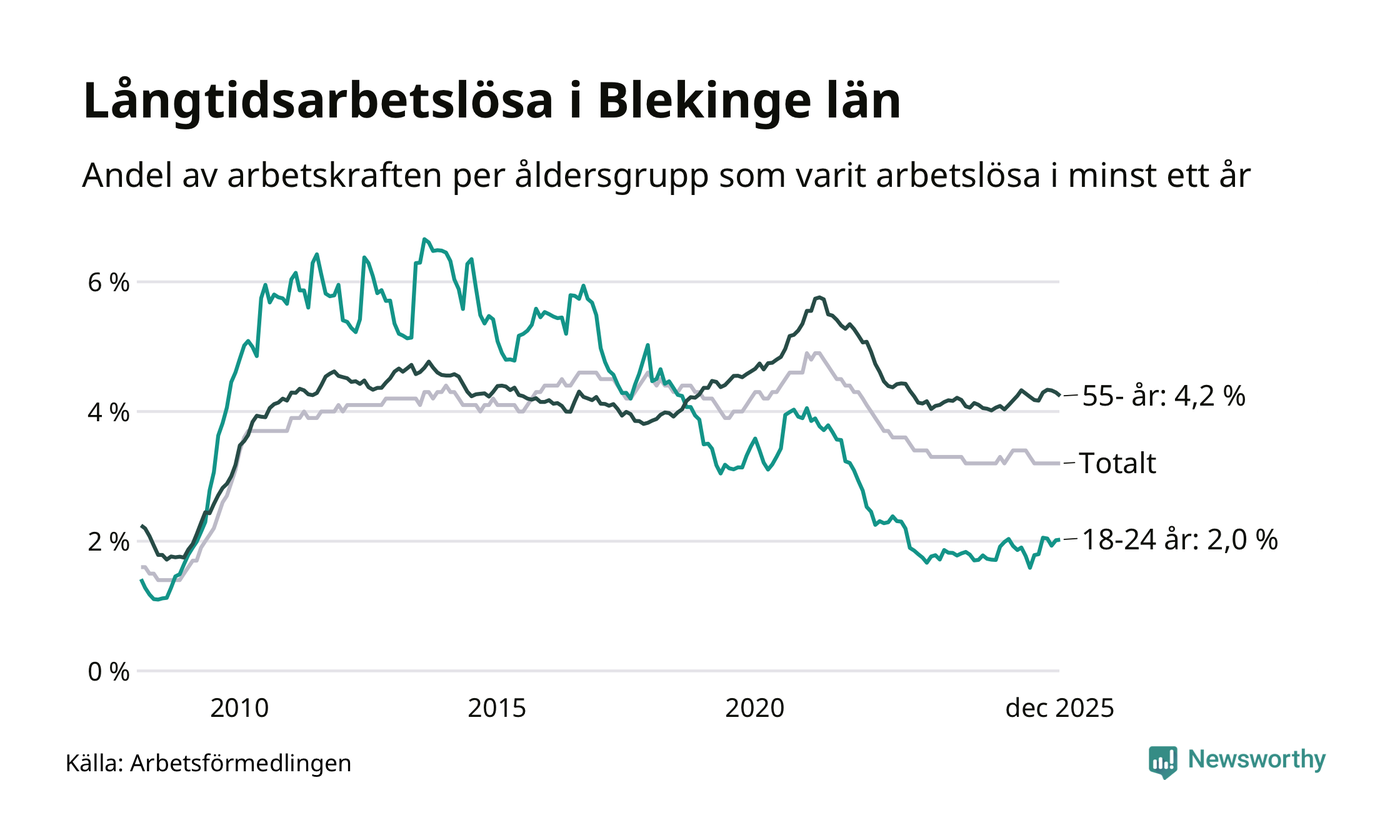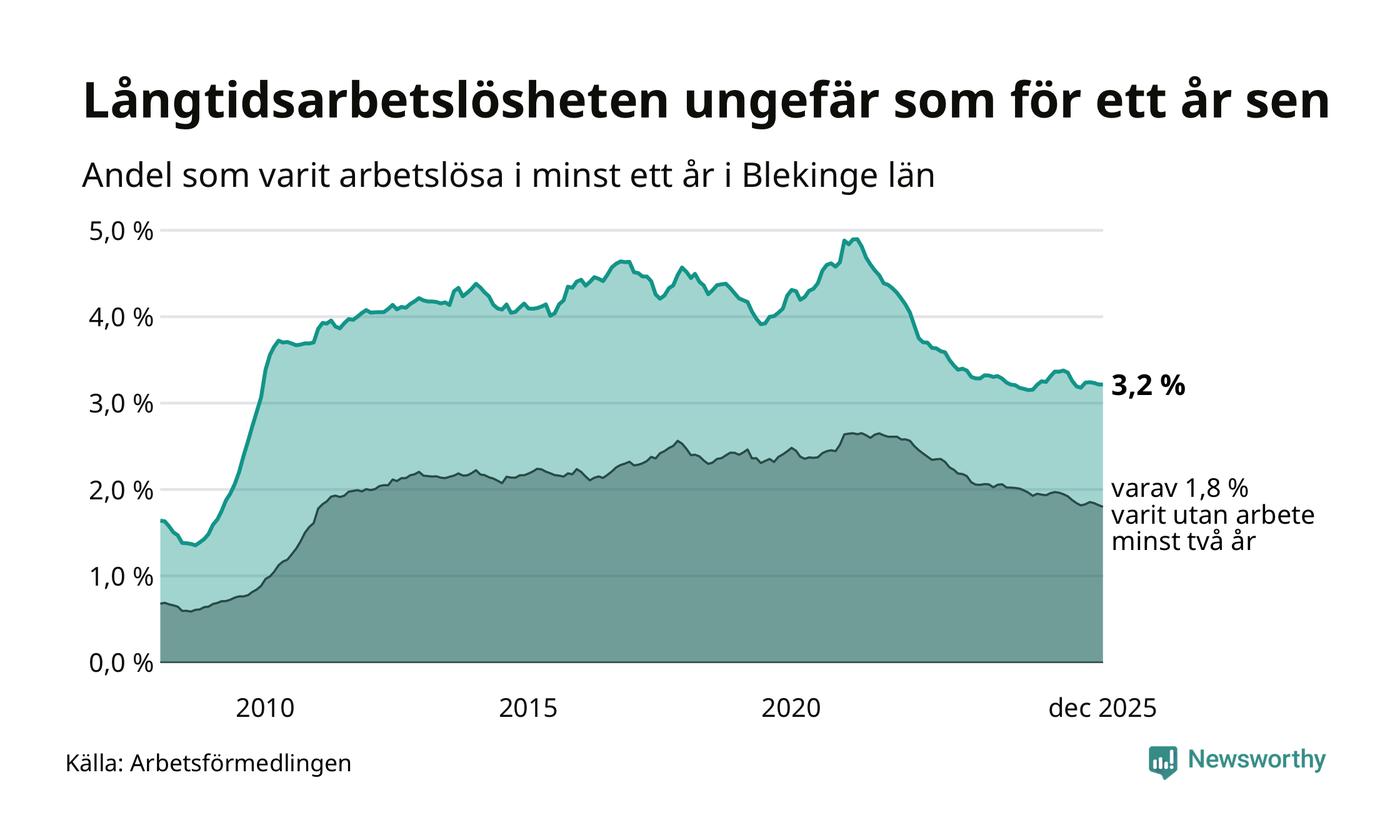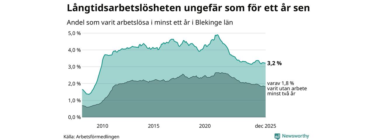I december hade 2 425 Blekingebor varit arbetslösa i minst ett år, vilket är en färre än månaden innan. 2 425 personer motsvarar 3,2 procent av arbetskraften i länet – andelen långtidsarbetslösa är ungefär på samma nivå som för ett år sedan.