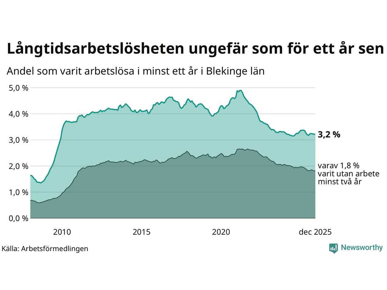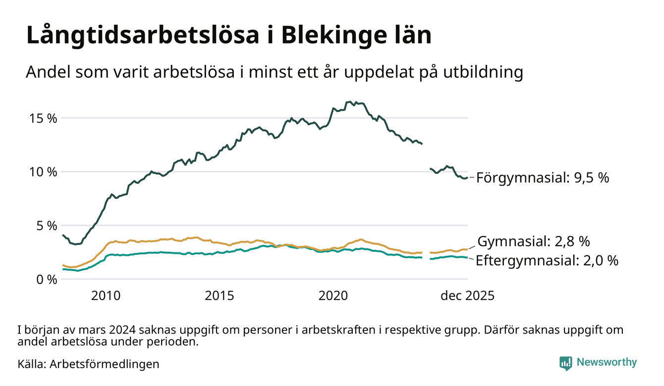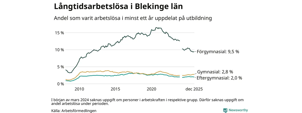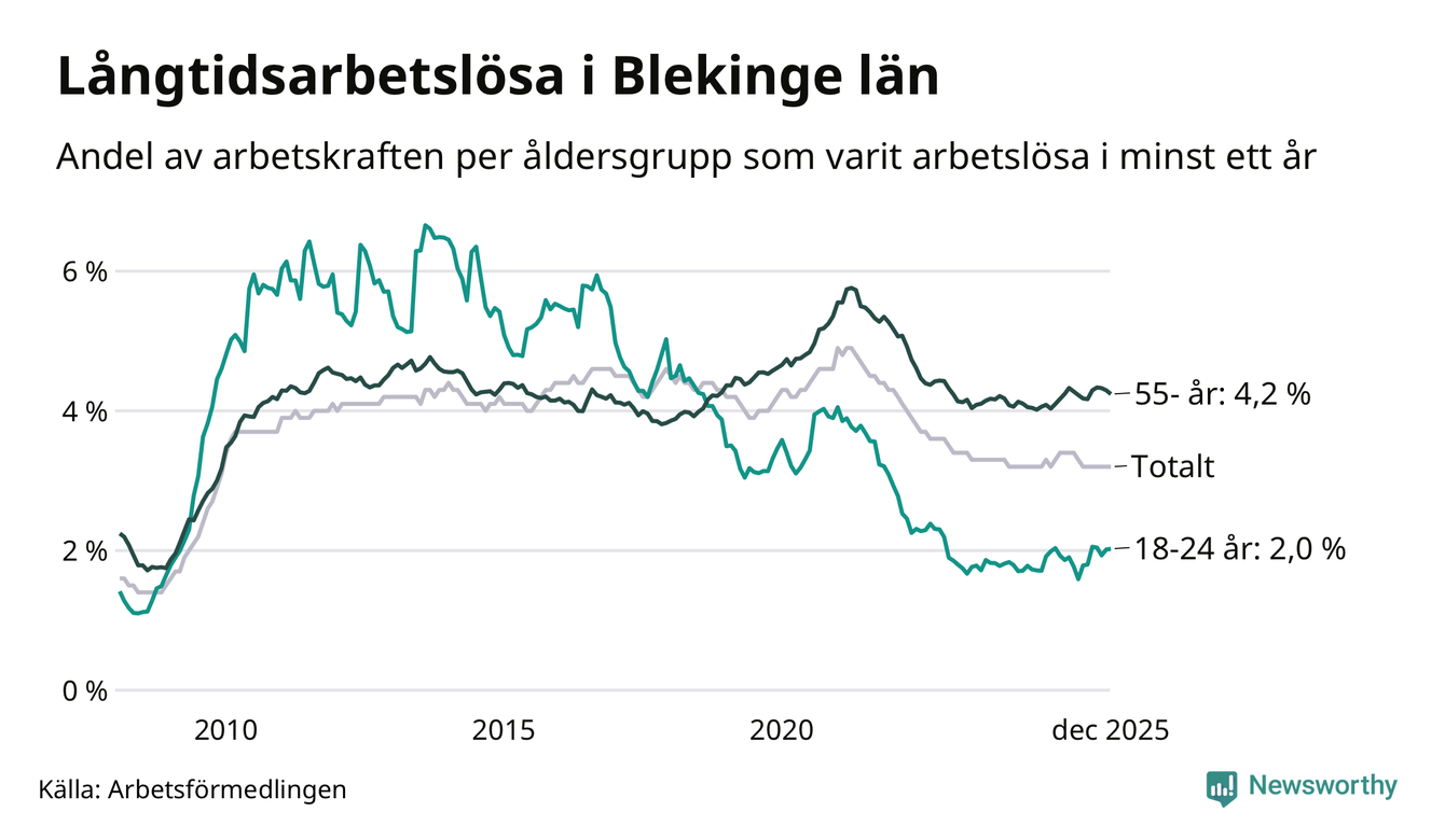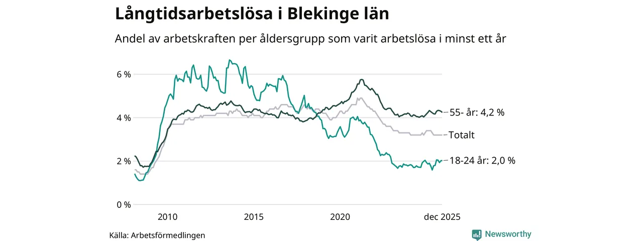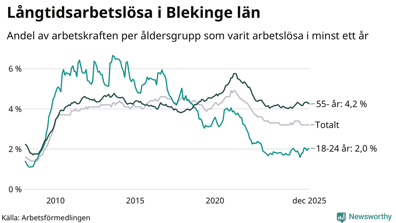 I december hade 2 425 Blekingebor varit arbetslösa i minst ett år, vilket är en färre än månaden innan. 2 425 personer motsvarar 3,2 procent av arbetskraften i länet – andelen långtidsarbetslösa är ungefär på samma nivå som för ett år sedan.