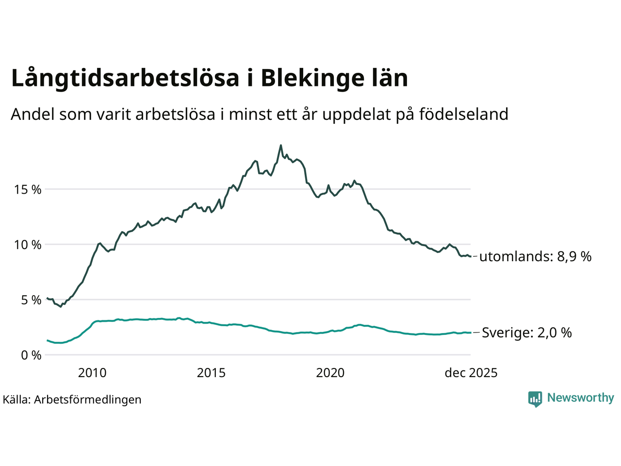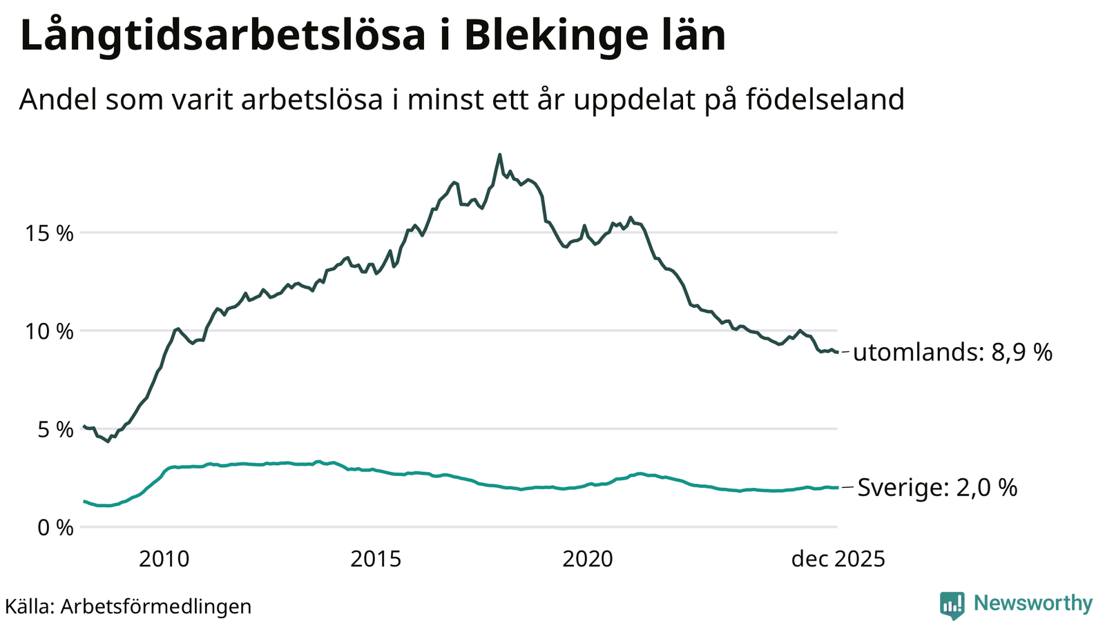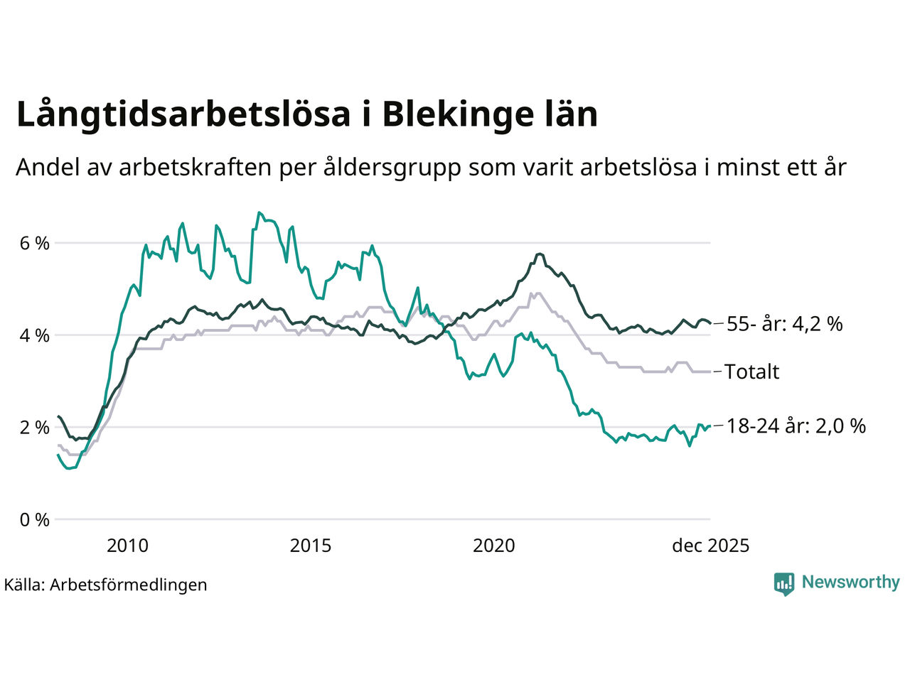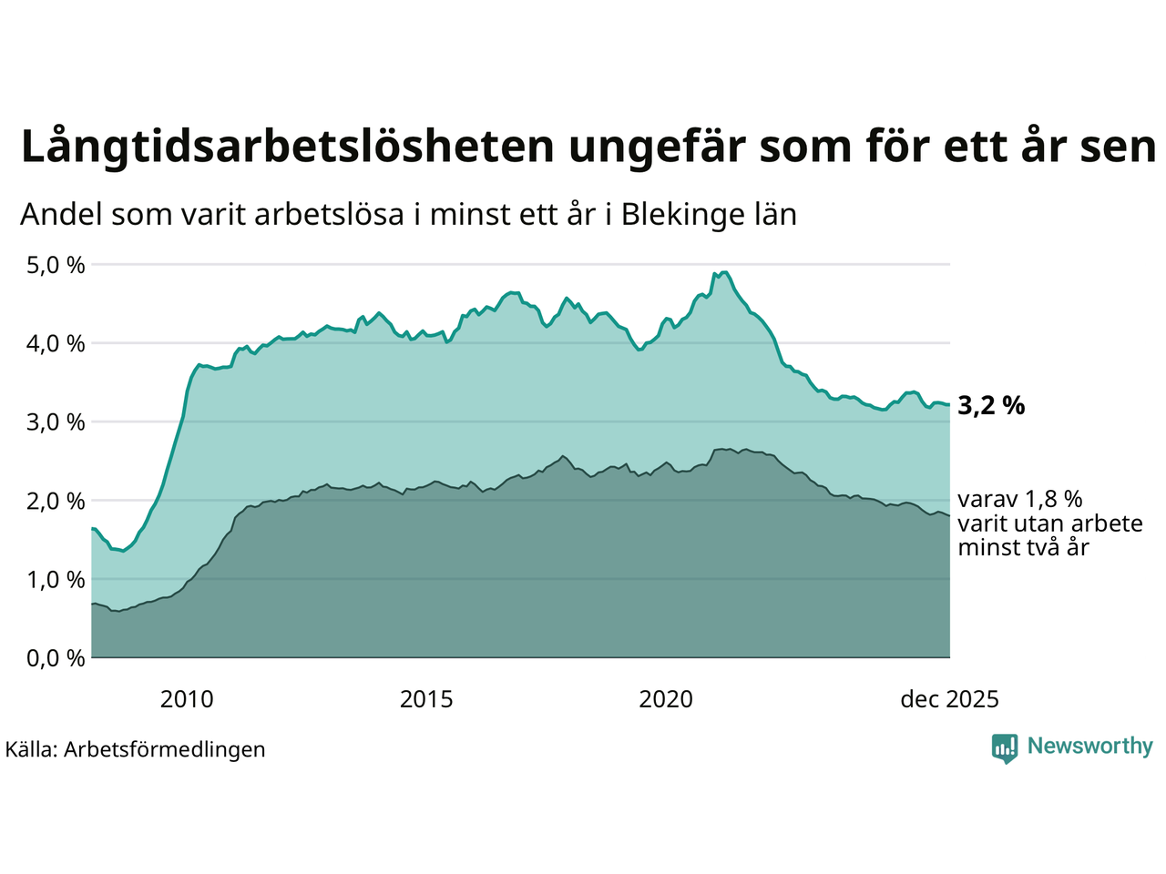 I december hade 2 425 Blekingebor varit arbetslösa i minst ett år, vilket är en färre än månaden innan. 2 425 personer motsvarar 3,2 procent av arbetskraften i länet – andelen långtidsarbetslösa är ungefär på samma nivå som för ett år sedan.