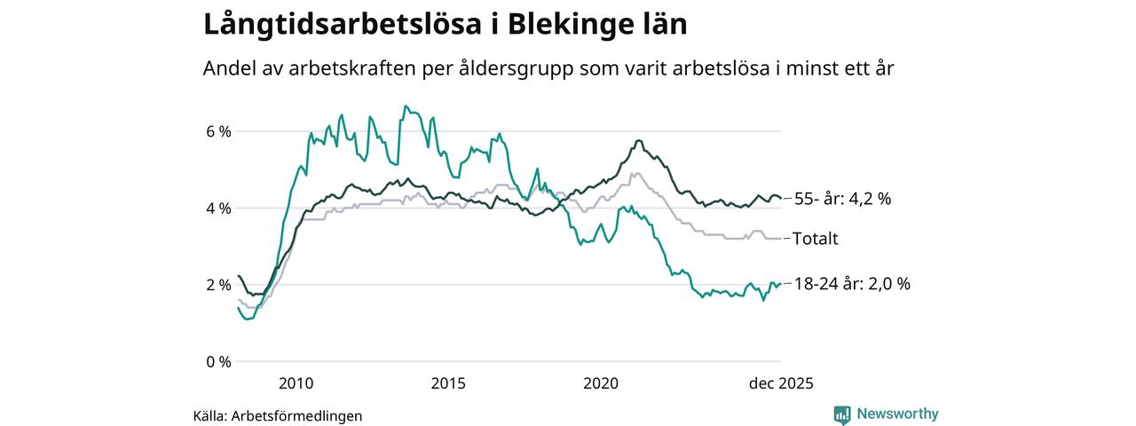 Av de 2 425 personerna som varit arbetslösa i mer än ett år i Blekinge län är 758 personer mellan 55 och 651 år och 167 är mellan 18 och 24 år. För den äldre gruppen är andelen arbetslösa 4,2 procent medan den i den yngre gruppen är 2,0 procent. Även i riket som helhet är långtidsarbetslösheten högre i gruppen äldre.