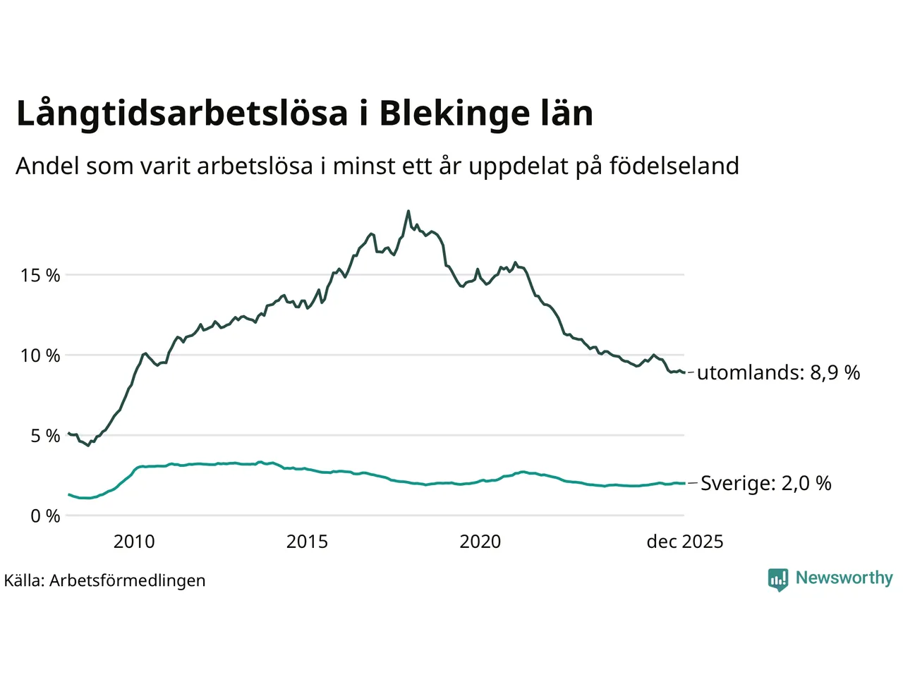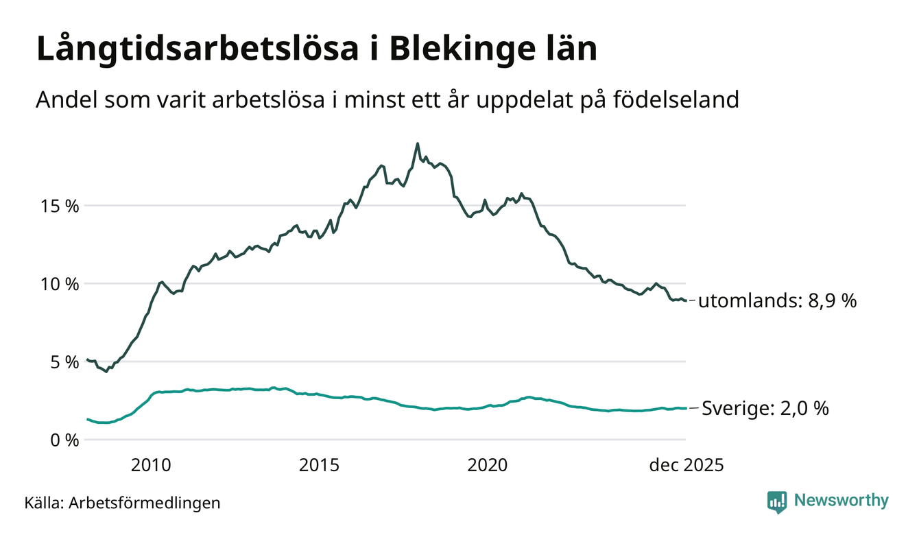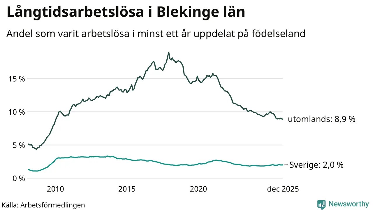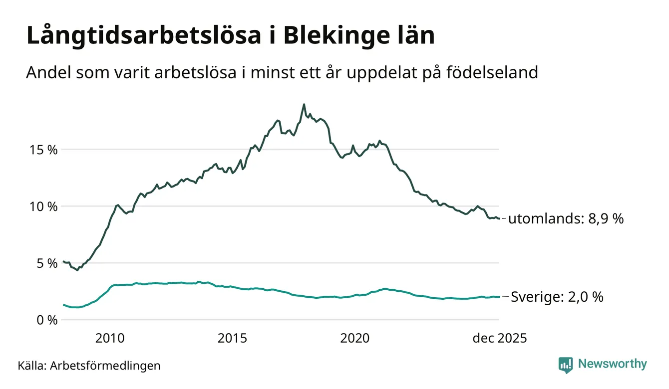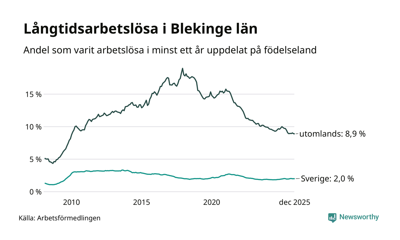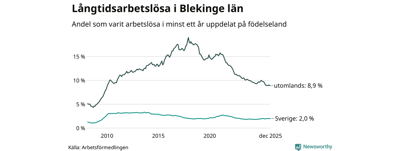 1 242 av de långtidsarbetslösa i Blekinge är födda i Sverige, medan 1 183 är födda utomlands. Det innebär att långtidsarbetslösheten bland Sverigefödda är 2,0 procent, medan den är fyra gånger så hög – 8,9 procent – bland födda utomlands. Även i riket som helhet är arbetslösheten högre bland utrikesfödda.