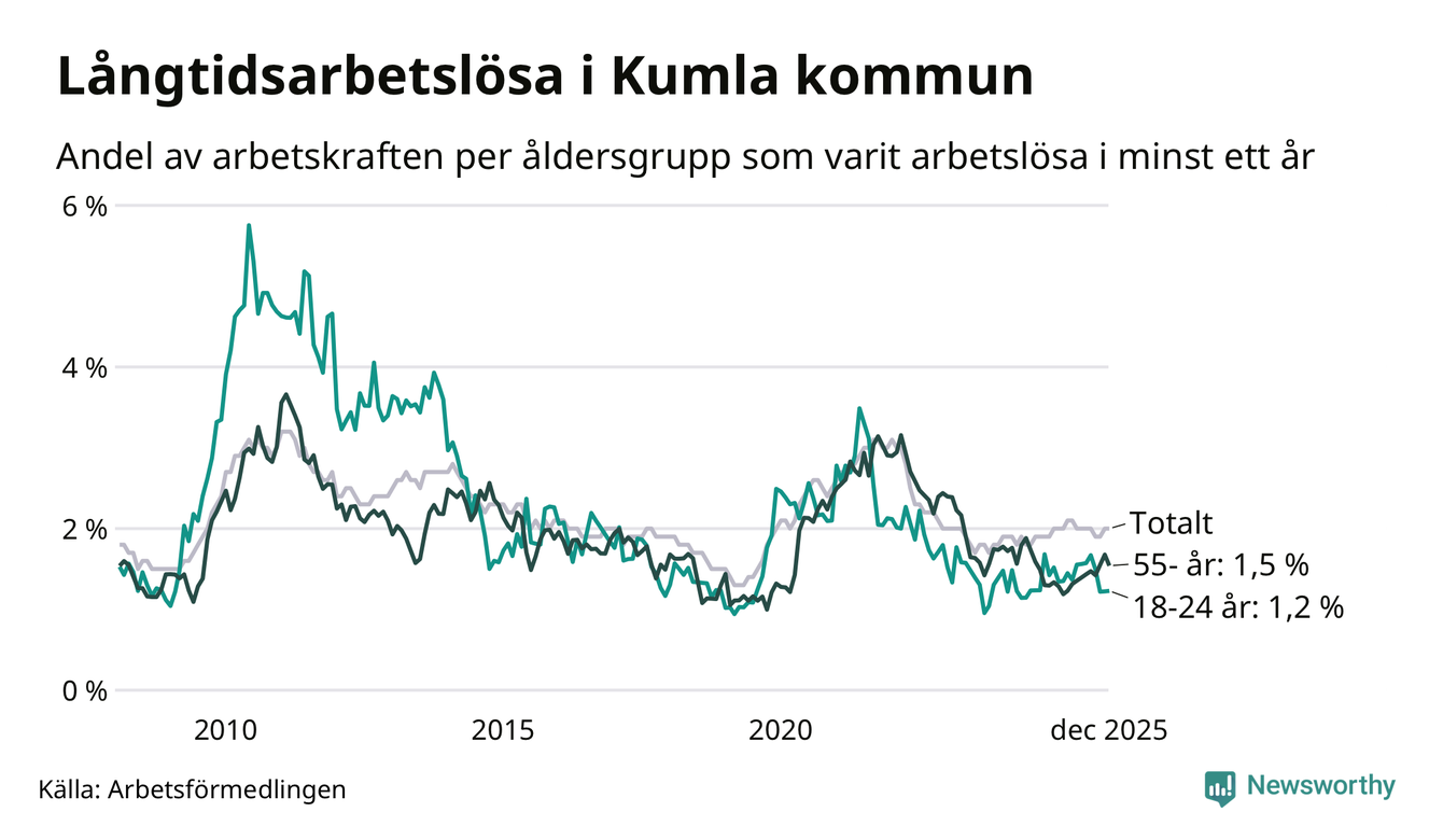 Graf: Andel arbetslösa uppdelat i åldersgrupper i Kumla