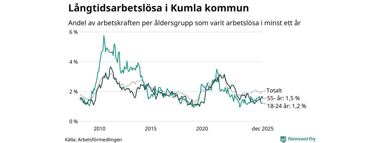 I december hade 224 Kumlabor varit arbetslösa i minst ett år, vilket är tre fler än månaden innan. 224 personer motsvarar 2,0 procent av arbetskraften i kommunen – andelen långtidsarbetslösa är ungefär på samma nivå som för ett år sedan.