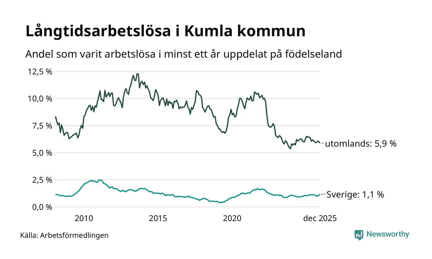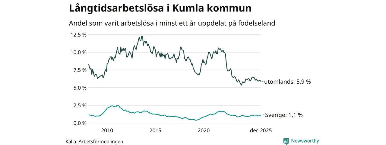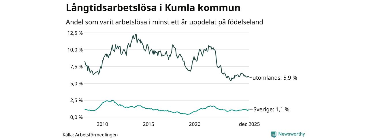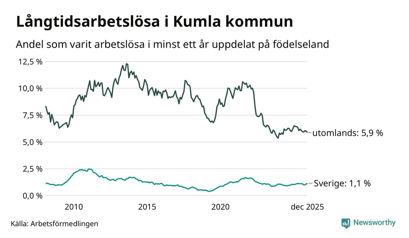 104 av de långtidsarbetslösa i Kumla är födda i Sverige, medan 120 är födda utomlands. Det innebär att långtidsarbetslösheten bland Sverigefödda är 1,1 procent, medan den är fem gånger så hög – 5,9 procent – bland födda utomlands. Även i riket som helhet är arbetslösheten högre bland utrikesfödda.