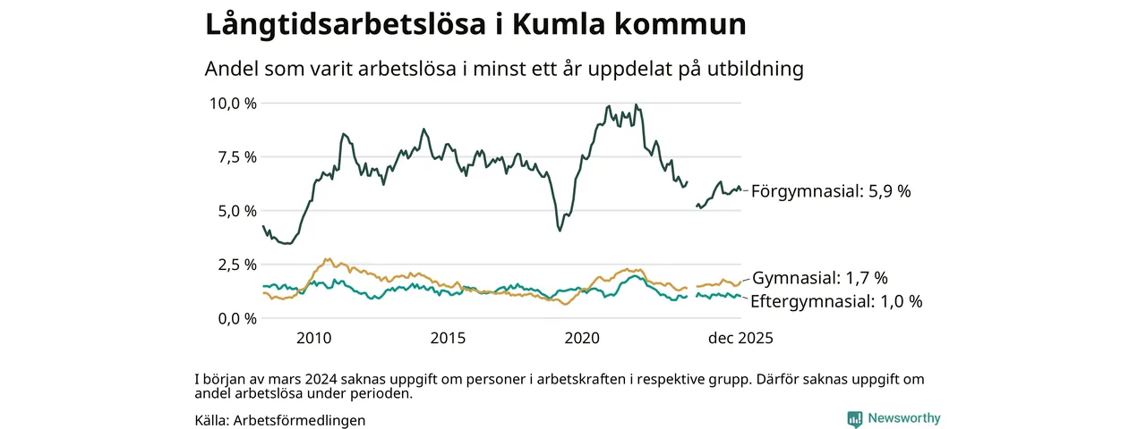 Graf över andel långtidsarbetslösa i Kumla uppdelat på utbildningsnivå