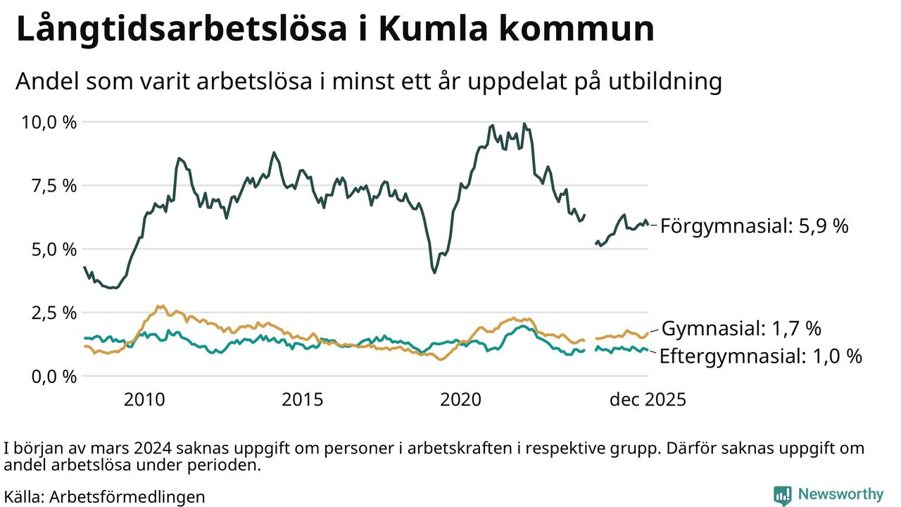 Graf: Andel arbetslösa i Kumla som varit utan arbete i minst 12 månader