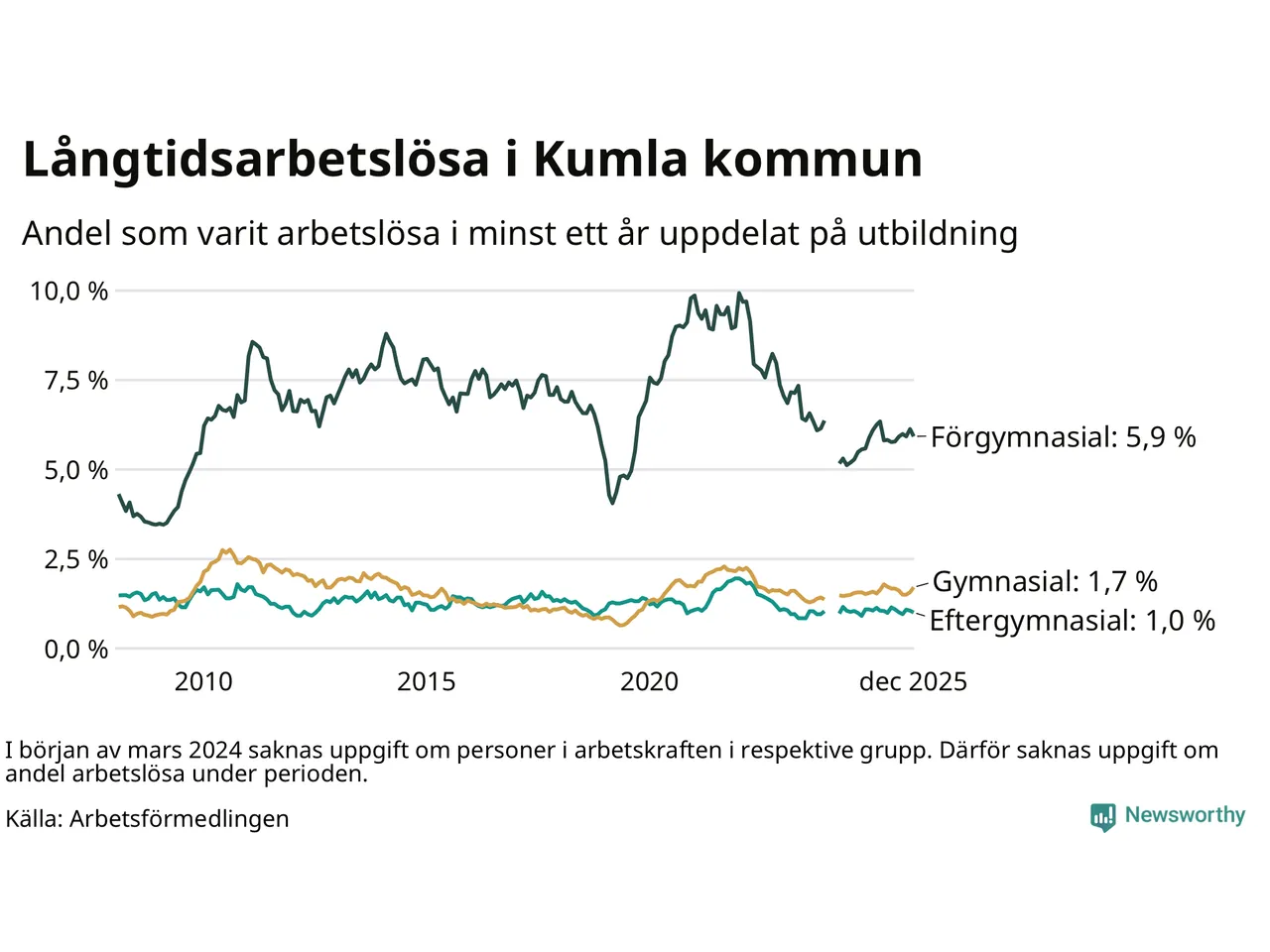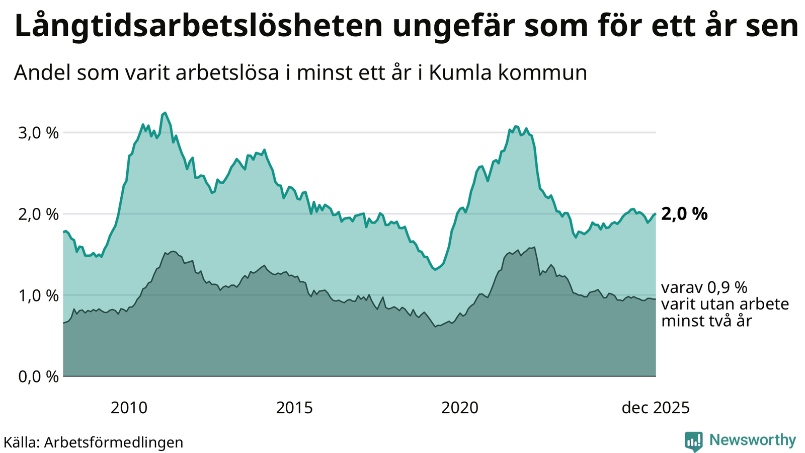Andelen som varit utan arbete i minst ett år i Kumla var ungefär lika stor i december jämfört med samma månad för ett år sedan. Det visar Arbetsfömedlingens senaste månadsstatistik.